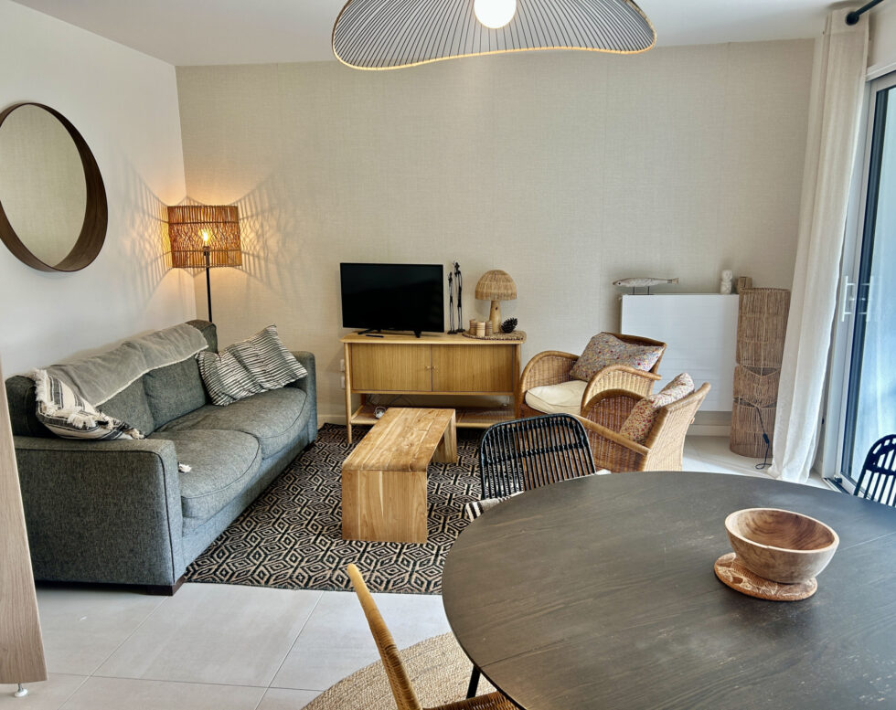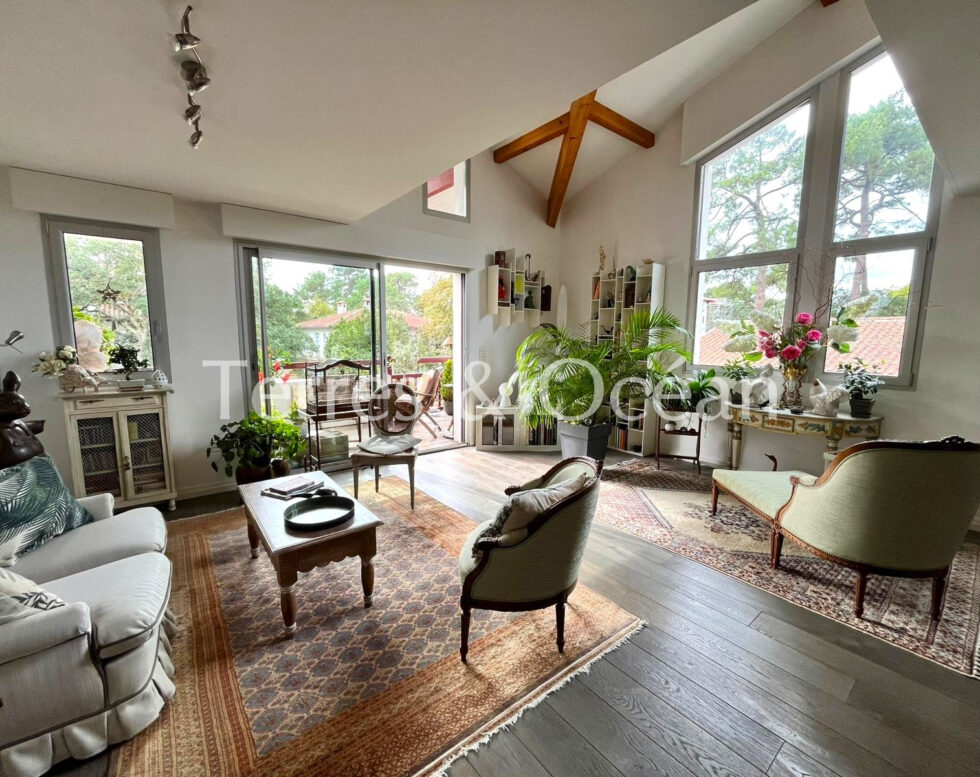 En dernier étage d’une résidence en plein centre d’Hossegor, appartement de charme de 88 m2 avec beaucoup de cachet et une grande terrasse de plus de 80m2. Comme une maison sur les toits, il offre de beaux volumes, un séjour avec charpente apparente et cheminée, une cuisine avec accès direct sur la terrasse, deux belles chambres, salle de bains, une entrée, un dégagements et un cellier. Il bénéficie d’une belle luminosté, et sa spacieuse terrasse reste à l’abri des vis-à-vis. Les informations sur les risques auxquels ce bien est exposé sont disponibles sur le site Géorisques :www.georisques.gouv.fr. Copropriété de 21 lots, pas de procédure en cours.
