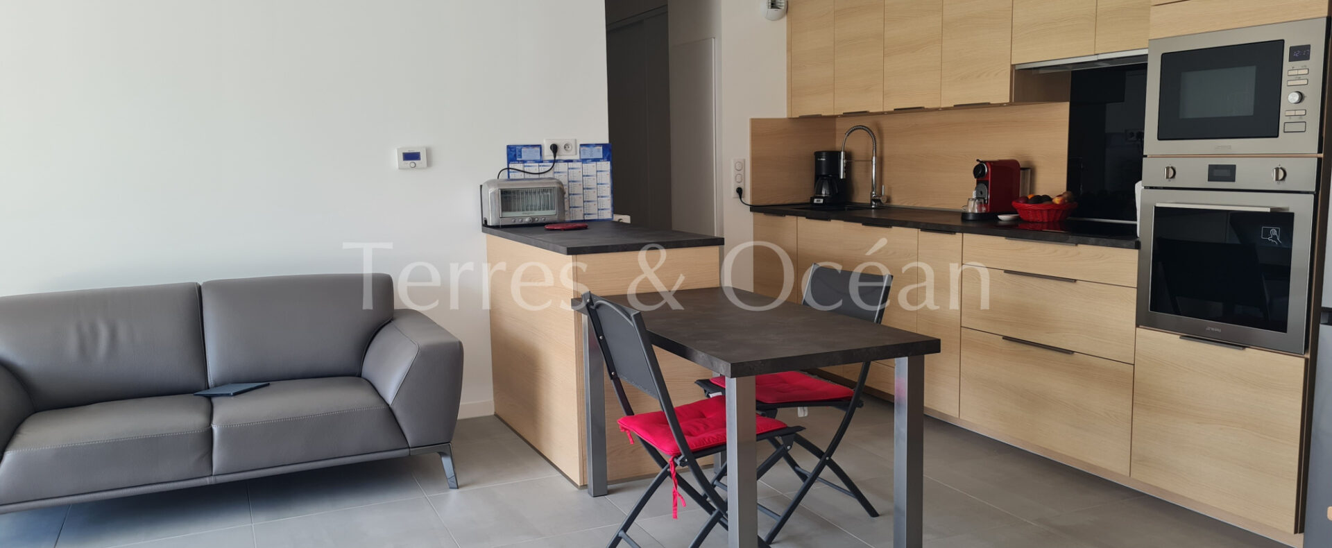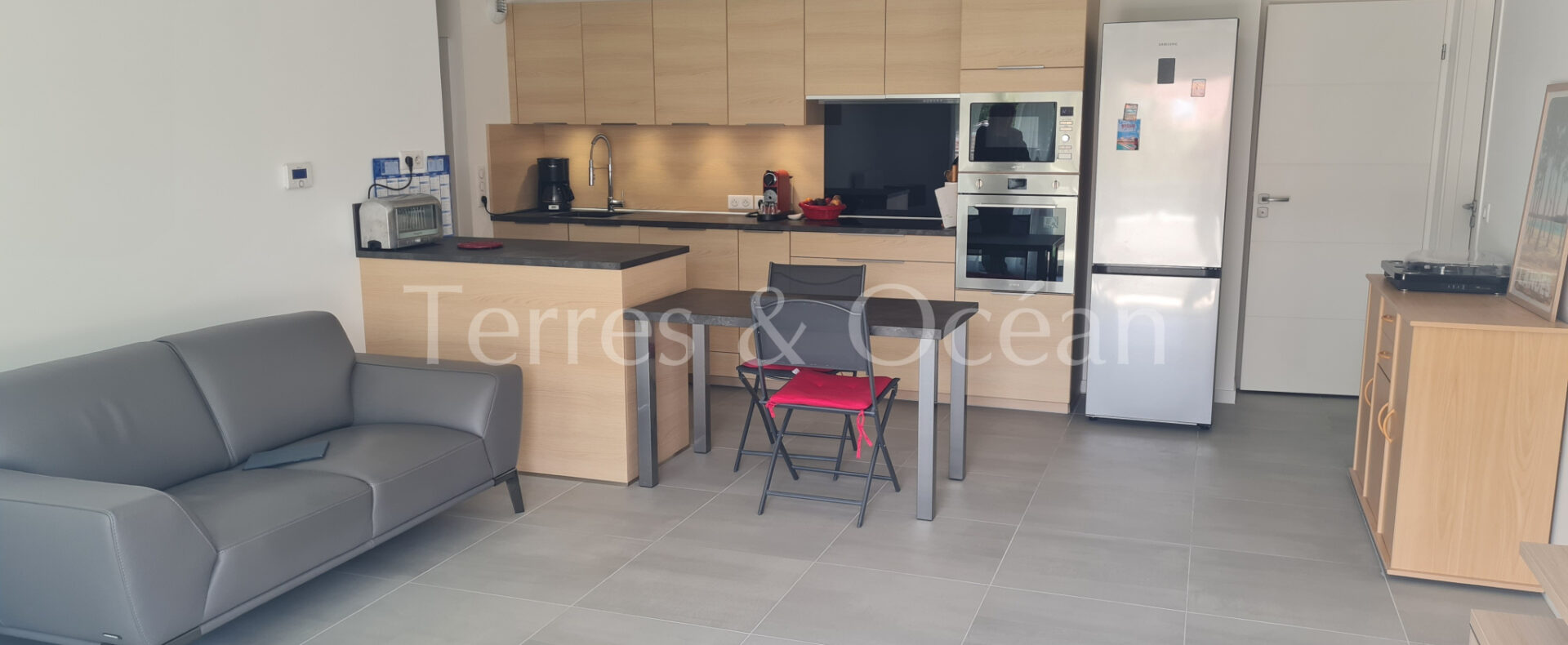 On the first floor with elevator, it consists of an entrance hall, living room with kitchen opening onto a beautiful and large covered terrace, two bedrooms with storage, shower room.