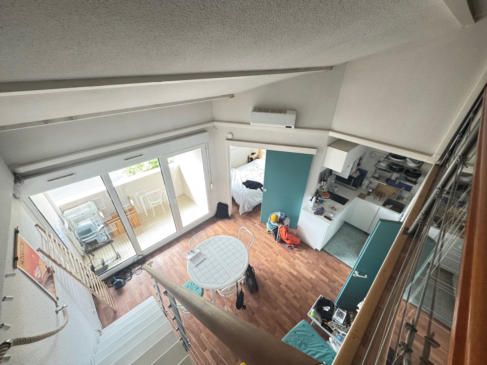 A mezzanine with a closed bedroom above the living room offers additional sleeping accommodations.