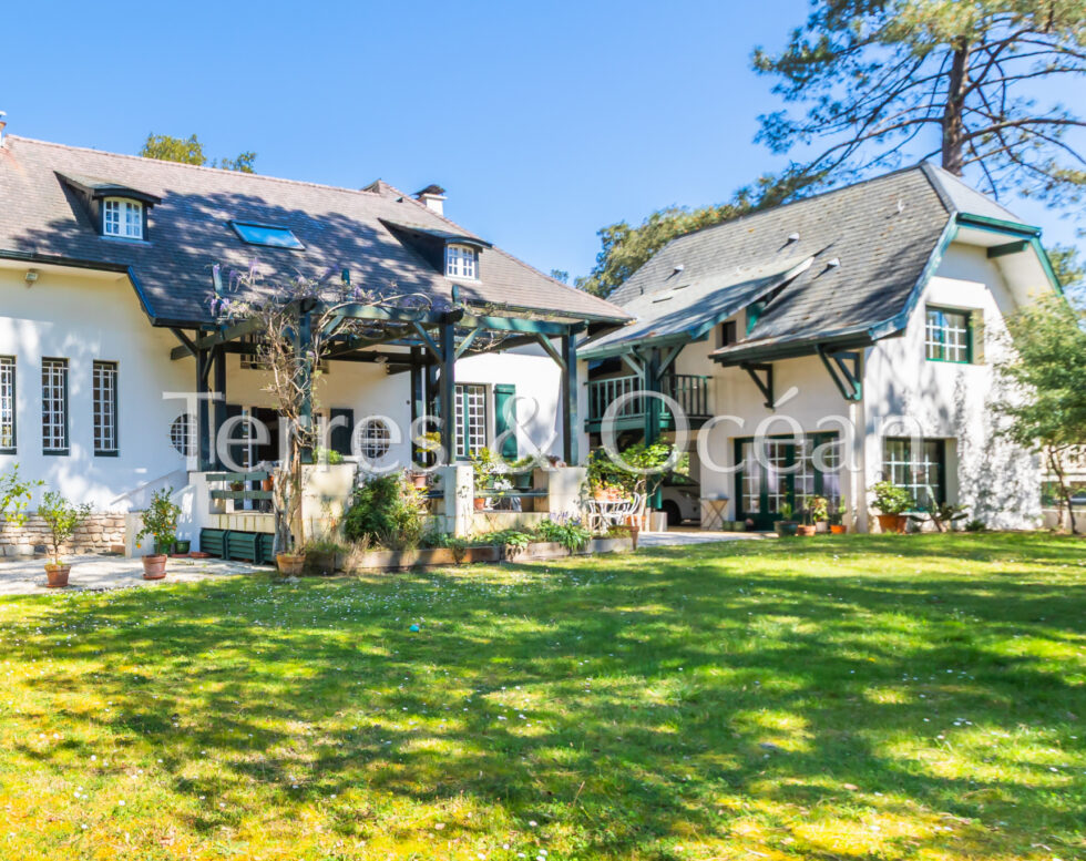 15 minutes from the beaches and golf course of Hossegor, this recently renovated property consists of two well-exposed houses on a plot of over 3000 m2. The main house offers an entrance, large cathedral living room crossing with an area of 80 m2, open fitted kitchen, three bedrooms on one level, a large mezzanine TV lounge upstairs , two other bedrooms upstairs, three water rooms, utility room. The guest house is distributed entirely on one level (95 m2), consists of an entrance, a living room of 33 m2, a semi open kitchen of 11 m2, three bedrooms with storage and a bathroom. The two houses benefit from covered terraces overlooking the garden and the swimming pool area (heated and covered swimming pool). In annex, a double garage with two boxes, several parking spaces. This property will suit a large family home or a tourist accommodation project, with a potential of eight bedrooms. Offered for sale by Terres et Océan Immobilier in Hossegor