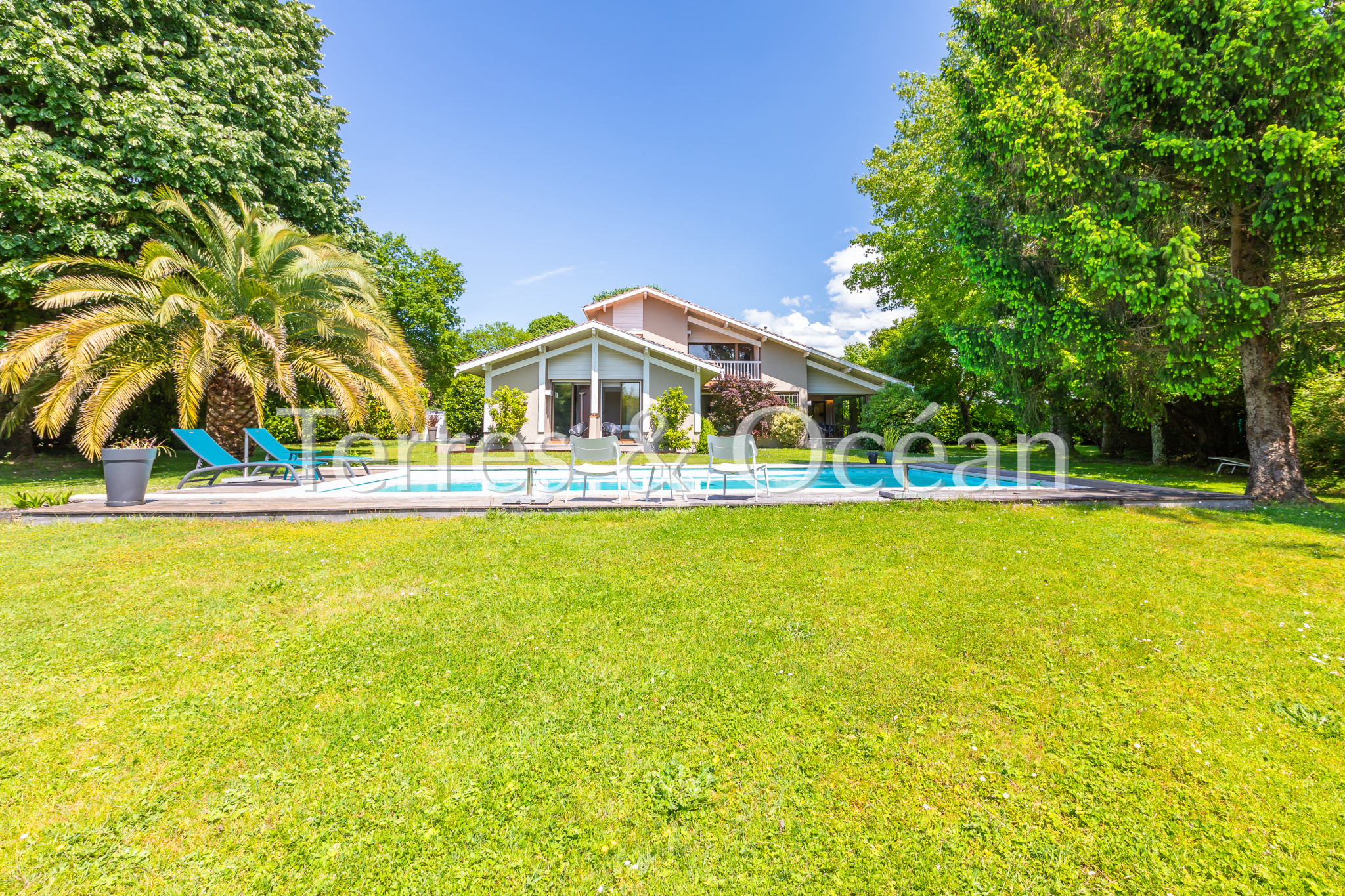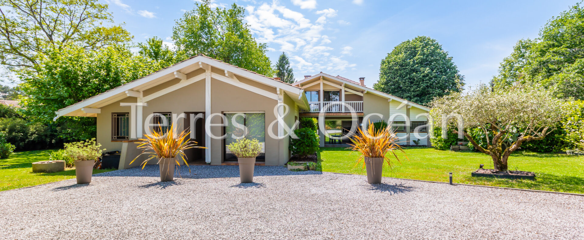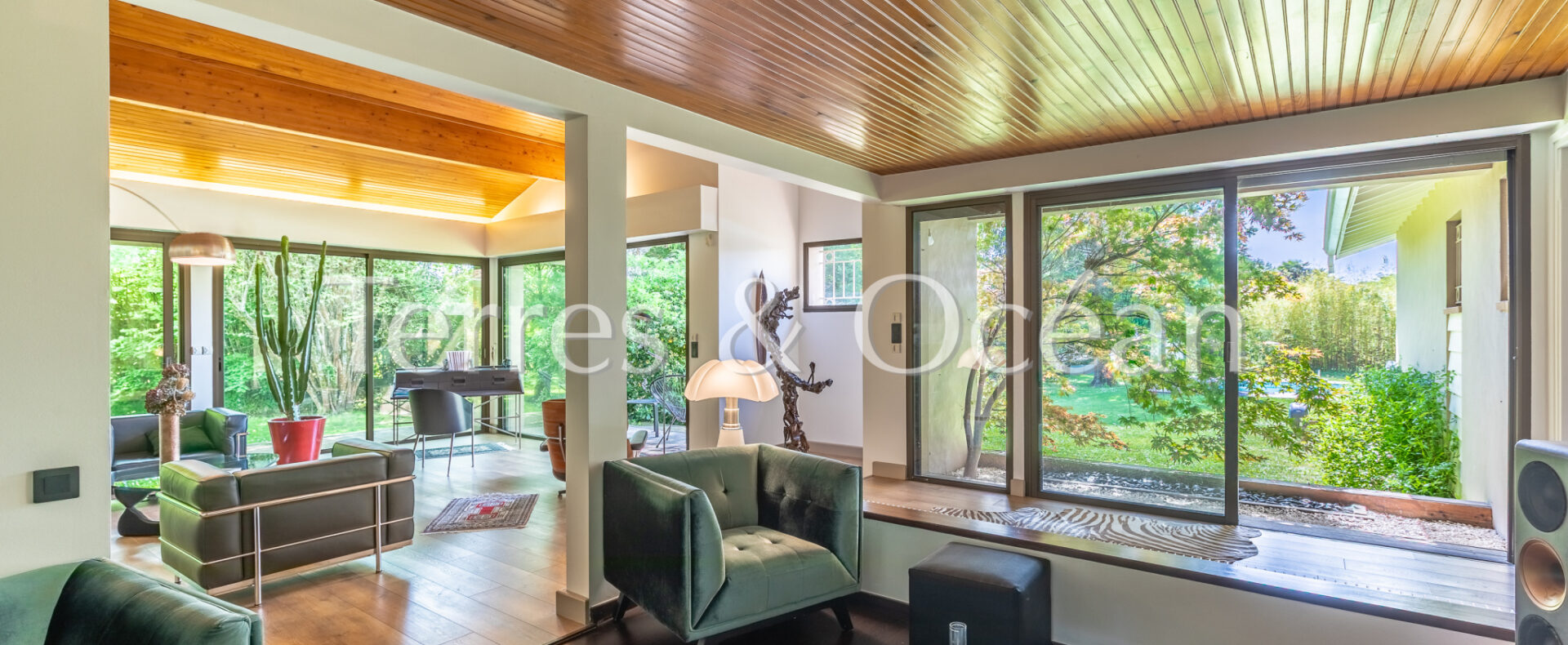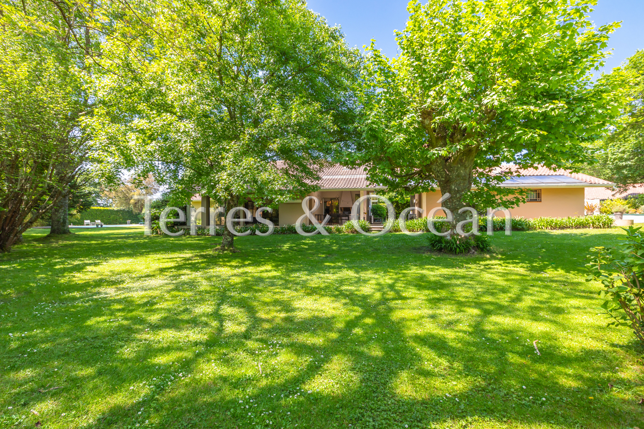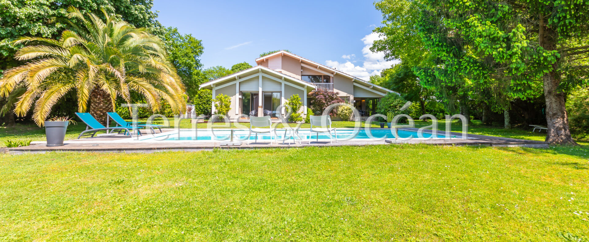 Au calme, proche du centre d’un village, à 12 min d’Hossegor et des plages, villa avec annexe en très bon état d’entretien. Bien exposée sur une parcelle joliment arborée de 3 200 m2, cette maison de construction traditionnelle de 1984 offre de beaux volumes, et une surface habitable de 243 m2, à laquelle s’ajoutent les 57 m2 de la maison d’amis. La maison principale dispose d’un beau séjour avec cheminée, baigné de lumière et largement ouvert sur l’extérieur, d’une cuisine séparée, de cinq chambres plus un bureau. En surfaces annexes, buanderie, cellier, double garage et atelier, grande terrasse partiellement couverte, piscine. Les prestations sont de qualité, chauffage gaz, climatisation, volets roulants électriques, panneaux photo-voltaïques … Ce bien de grande qualité pourra convenir en résidence principale aussi bien que pour une merveilleuse maison de vacances, mais aussi à une profession libérale avec la possibilité d’aménager la dépendance en bureau ou cabinet.