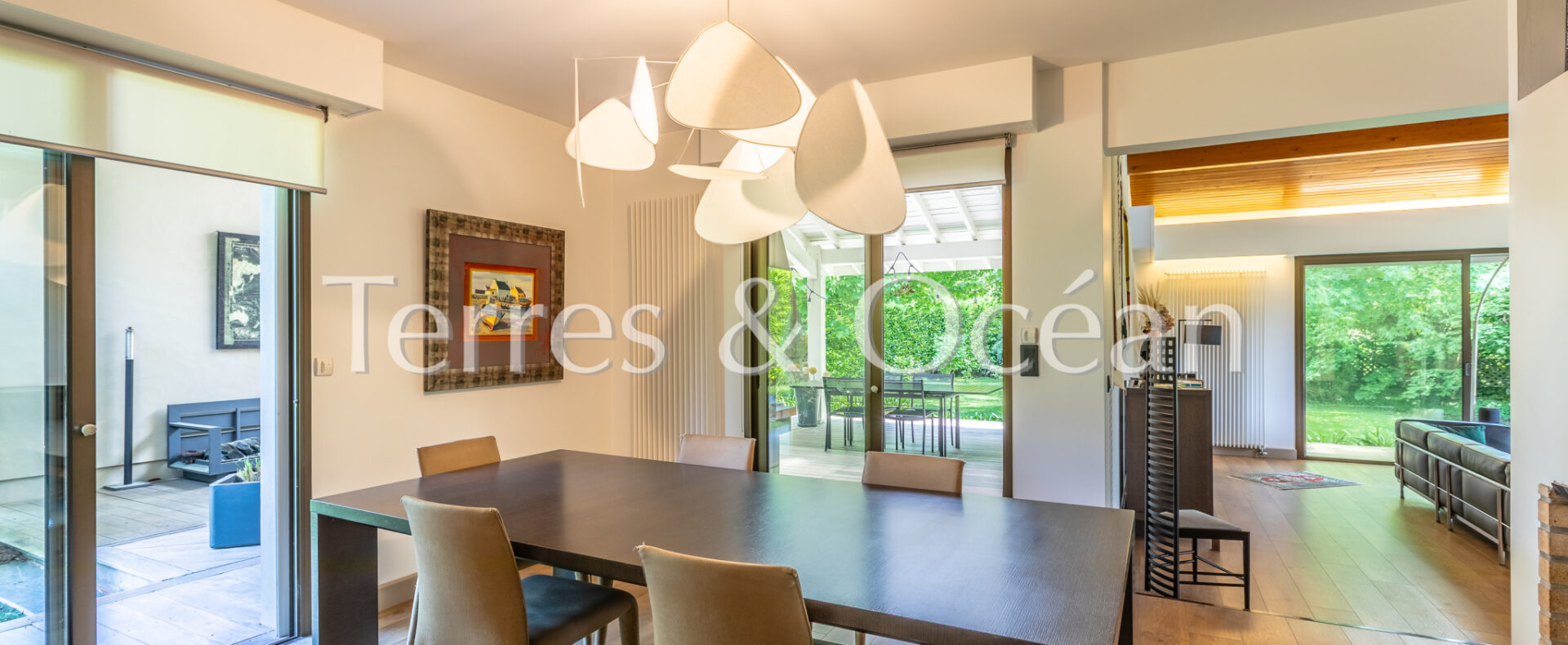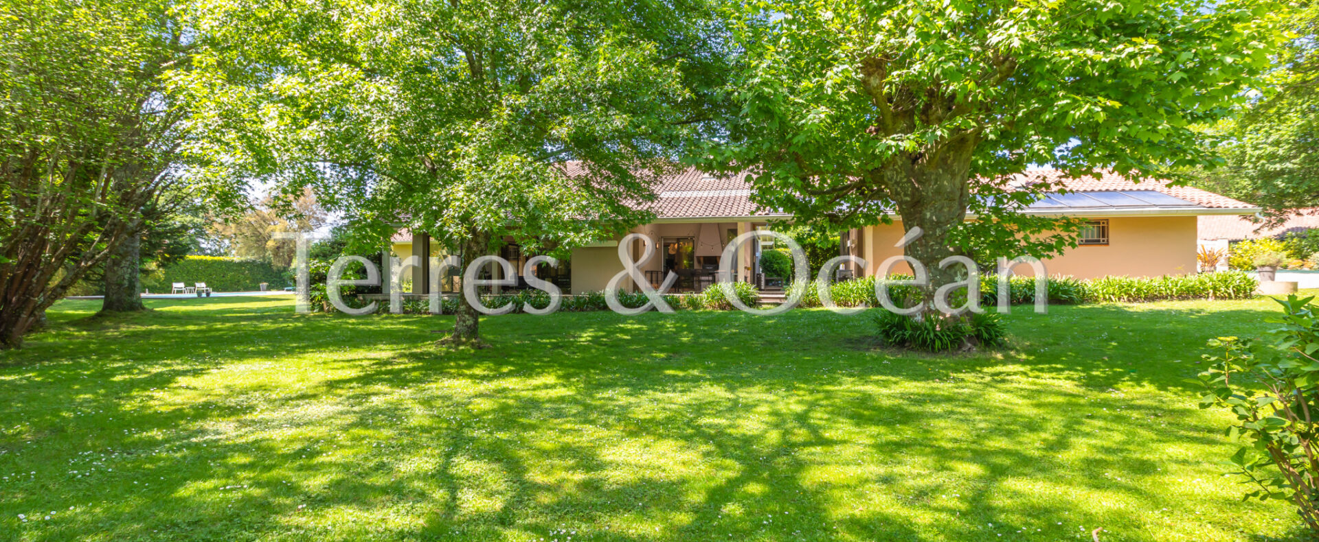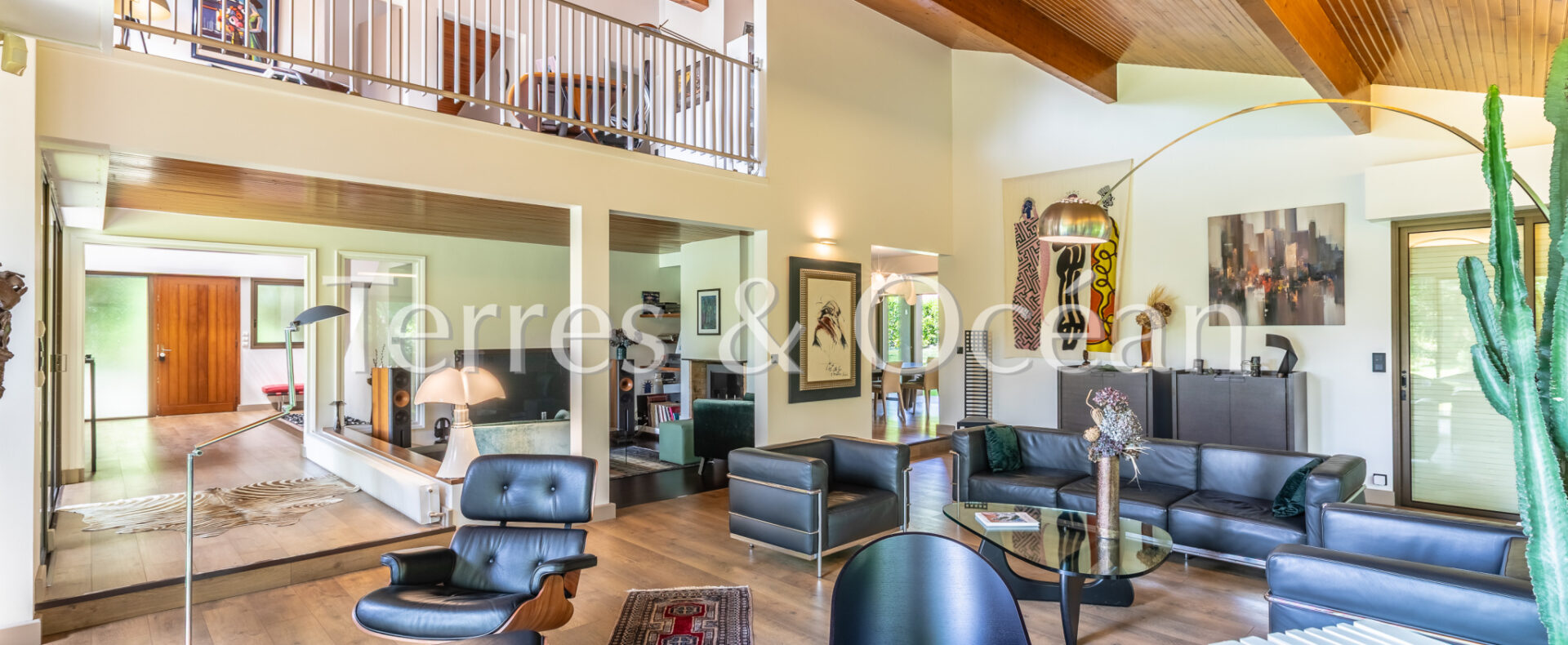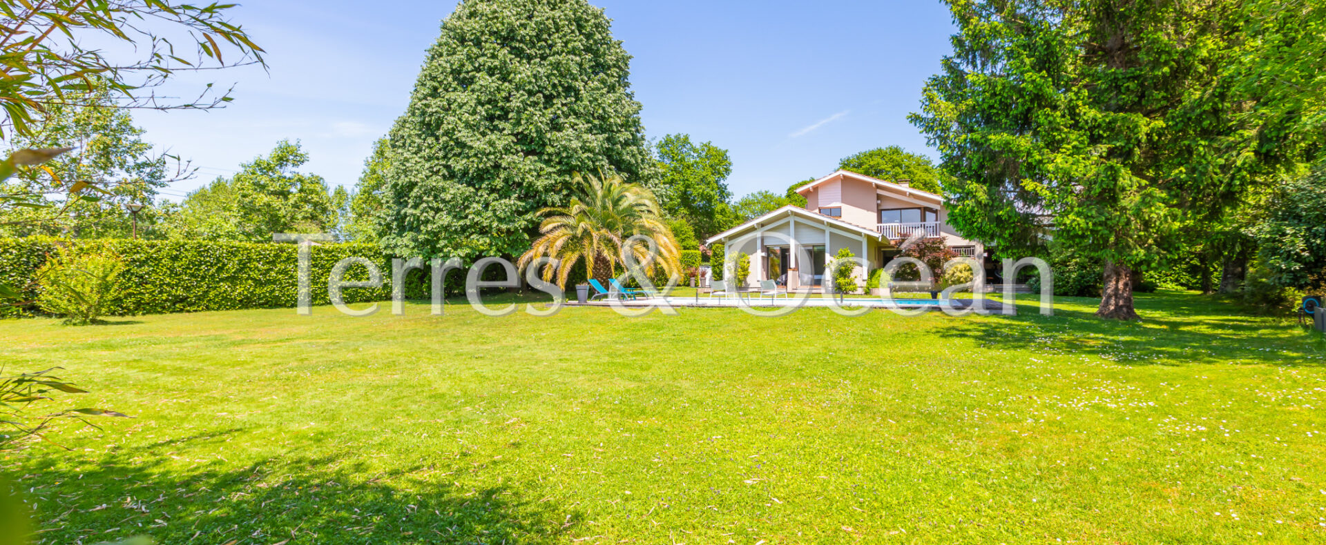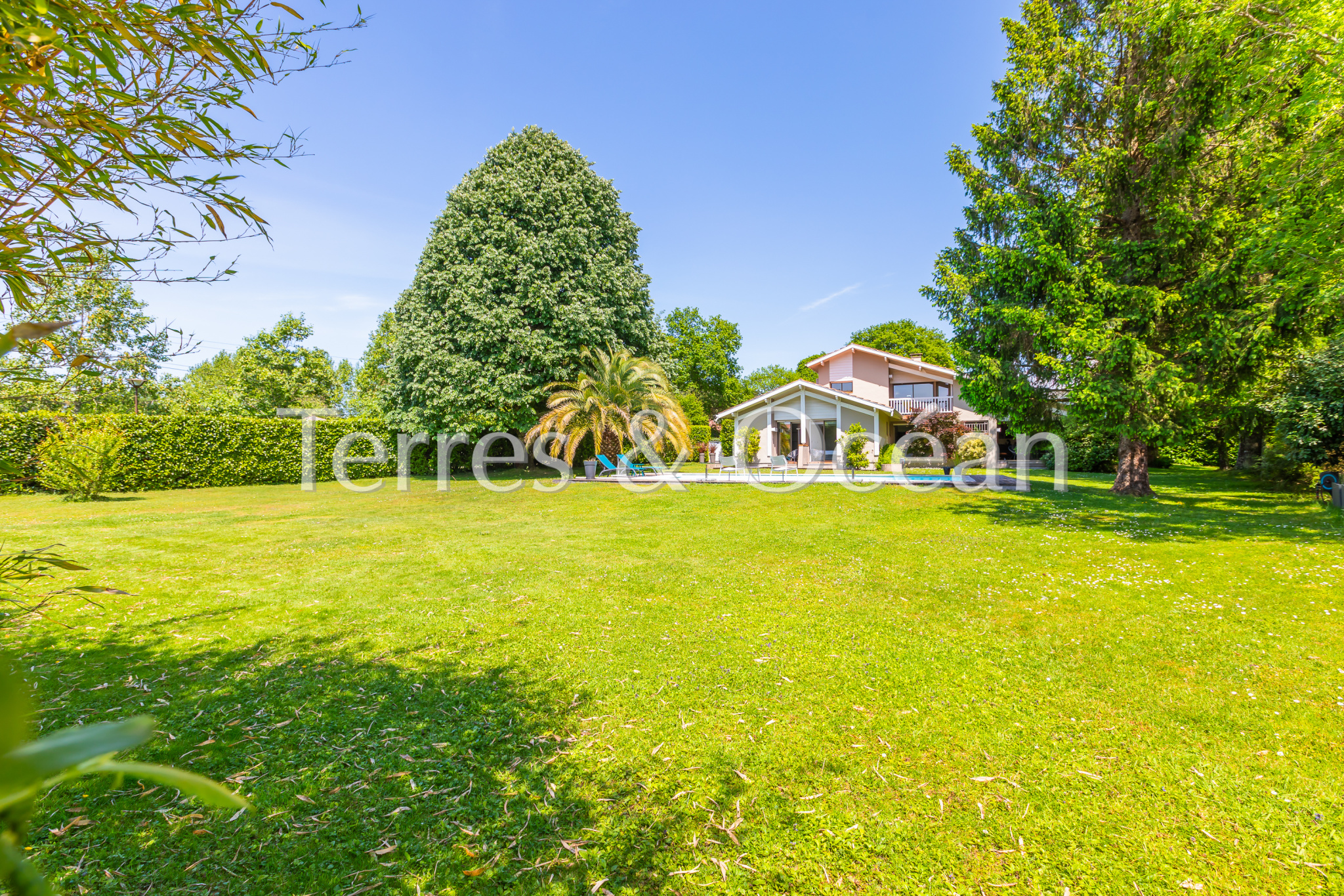 Au calme, proche du centre d’un village, à 12 min d’Hossegor et des plages, villa avec annexe en très bon état d’entretien. Bien exposée sur une parcelle joliment arborée de 3 200 m2, cette maison de construction traditionnelle de 1984 offre de beaux volumes, et une surface habitable de 243 m2, à laquelle s’ajoutent les 57 m2 de la maison d’amis. La maison principale dispose d’un beau séjour avec cheminée, baigné de lumière et largement ouvert sur l’extérieur, d’une cuisine séparée, de cinq chambres plus un bureau. En surfaces annexes, buanderie, cellier, double garage et atelier, grande terrasse partiellement couverte, piscine. Les prestations sont de qualité, chauffage gaz, climatisation, volets roulants électriques, panneaux photo-voltaïques … Ce bien de grande qualité pourra convenir en résidence principale aussi bien que pour une merveilleuse maison de vacances, mais aussi à une profession libérale avec la possibilité d’aménager la dépendance en bureau ou cabinet.