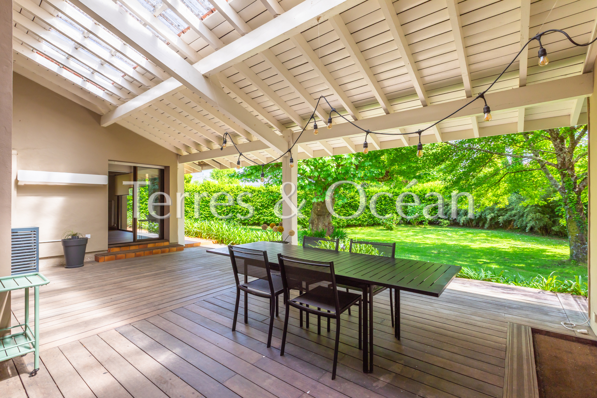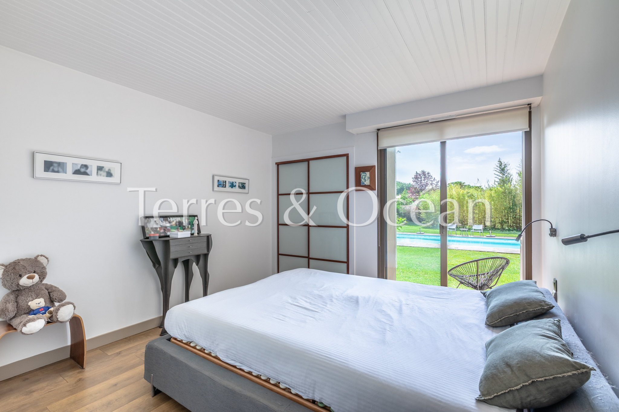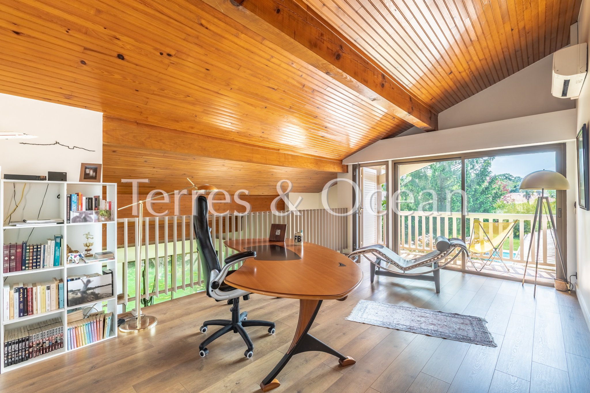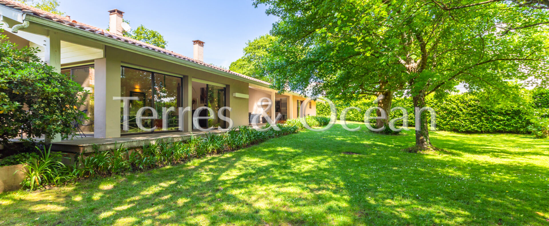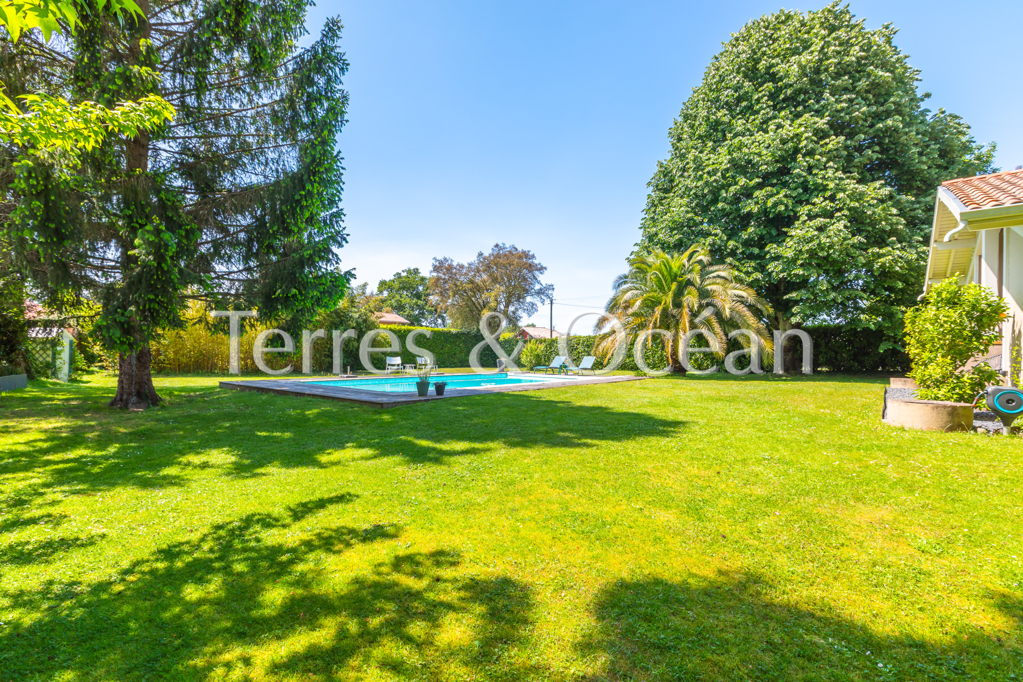 Au calme, proche du centre d’un village, à 12 min d’Hossegor et des plages, villa avec annexe en très bon état d’entretien. Bien exposée sur une parcelle joliment arborée de 3 200 m2, cette maison de construction traditionnelle de 1984 offre de beaux volumes, et une surface habitable de 243 m2, à laquelle s’ajoutent les 57 m2 de la maison d’amis. La maison principale dispose d’un beau séjour avec cheminée, baigné de lumière et largement ouvert sur l’extérieur, d’une cuisine séparée, de cinq chambres plus un bureau. En surfaces annexes, buanderie, cellier, double garage et atelier, grande terrasse partiellement couverte, piscine. Les prestations sont de qualité, chauffage gaz, climatisation, volets roulants électriques, panneaux photo-voltaïques … Ce bien de grande qualité pourra convenir en résidence principale aussi bien que pour une merveilleuse maison de vacances, mais aussi à une profession libérale avec la possibilité d’aménager la dépendance en bureau ou cabinet.