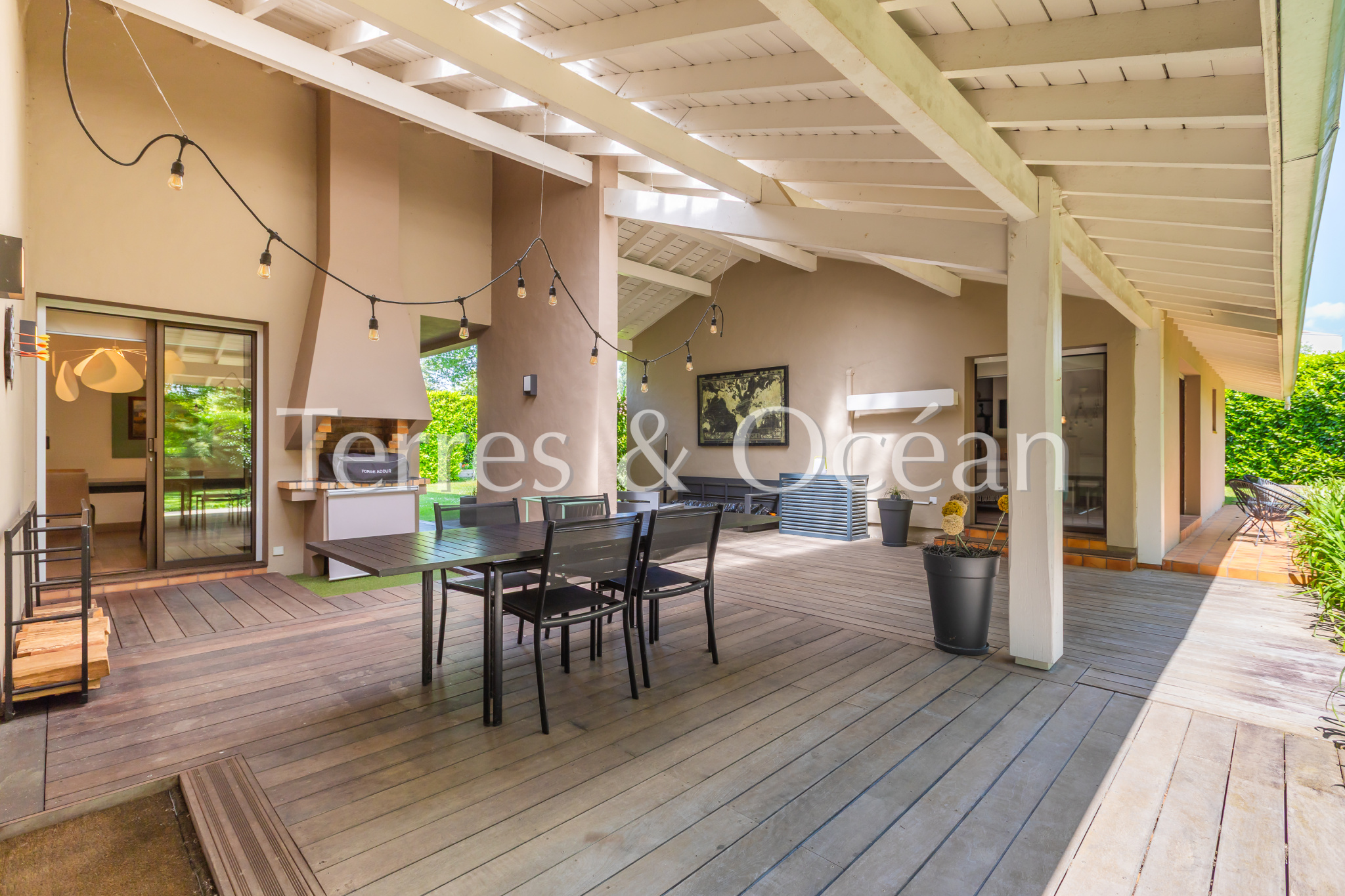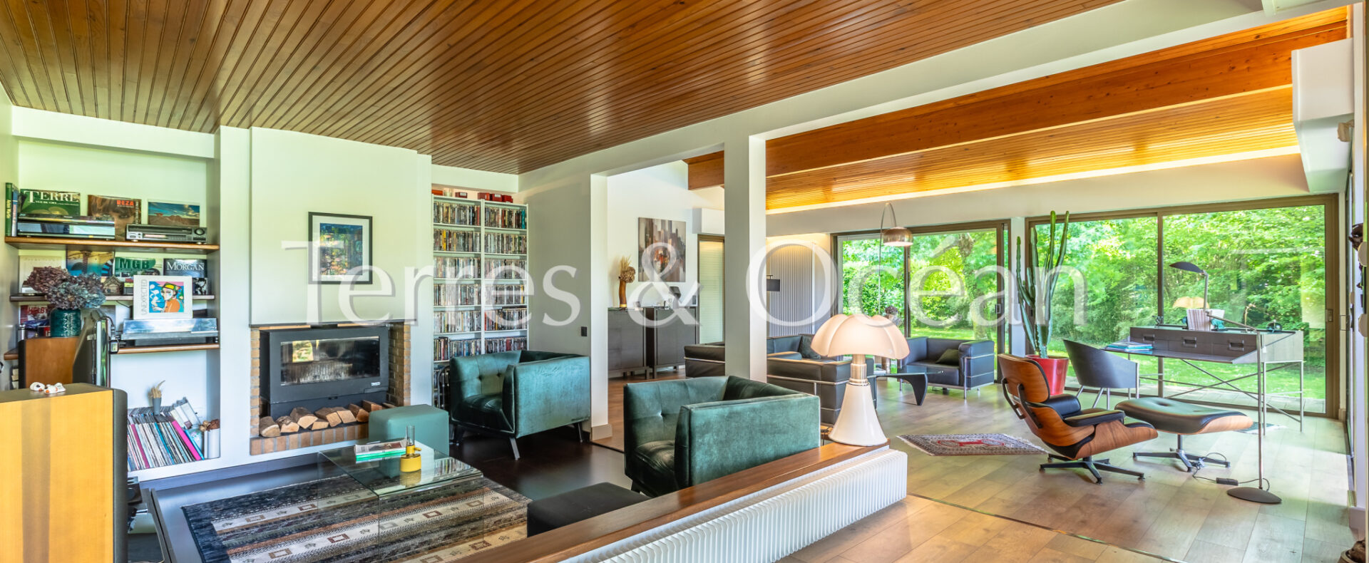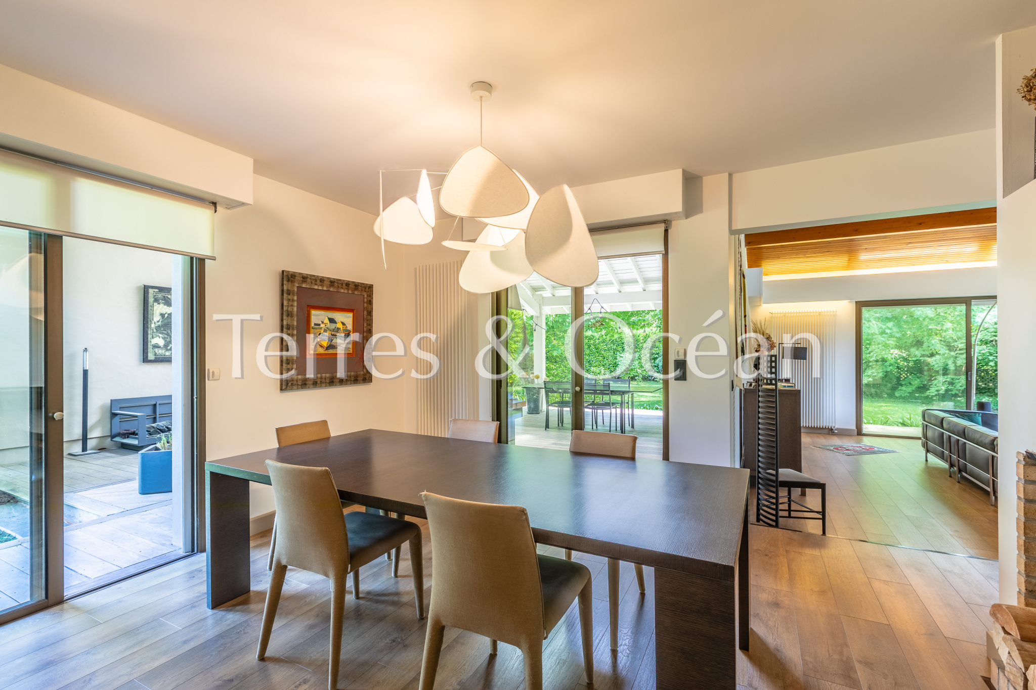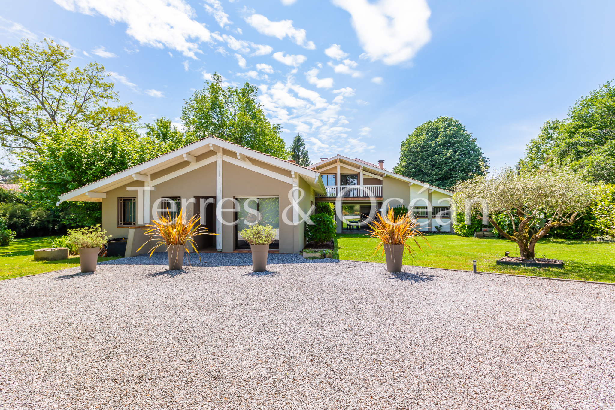 Au calme, proche du centre d’un village, à 12 min d’Hossegor et des plages, villa avec annexe en très bon état d’entretien. Bien exposée sur une parcelle joliment arborée de 3 200 m2, cette maison de construction traditionnelle de 1984 offre de beaux volumes, et une surface habitable de 243 m2, à laquelle s’ajoutent les 57 m2 de la maison d’amis. La maison principale dispose d’un beau séjour avec cheminée, baigné de lumière et largement ouvert sur l’extérieur, d’une cuisine séparée, de cinq chambres plus un bureau. En surfaces annexes, buanderie, cellier, double garage et atelier, grande terrasse partiellement couverte, piscine. Les prestations sont de qualité, chauffage gaz, climatisation, volets roulants électriques, panneaux photo-voltaïques … Ce bien de grande qualité pourra convenir en résidence principale aussi bien que pour une merveilleuse maison de vacances, mais aussi à une profession libérale avec la possibilité d’aménager la dépendance en bureau ou cabinet.