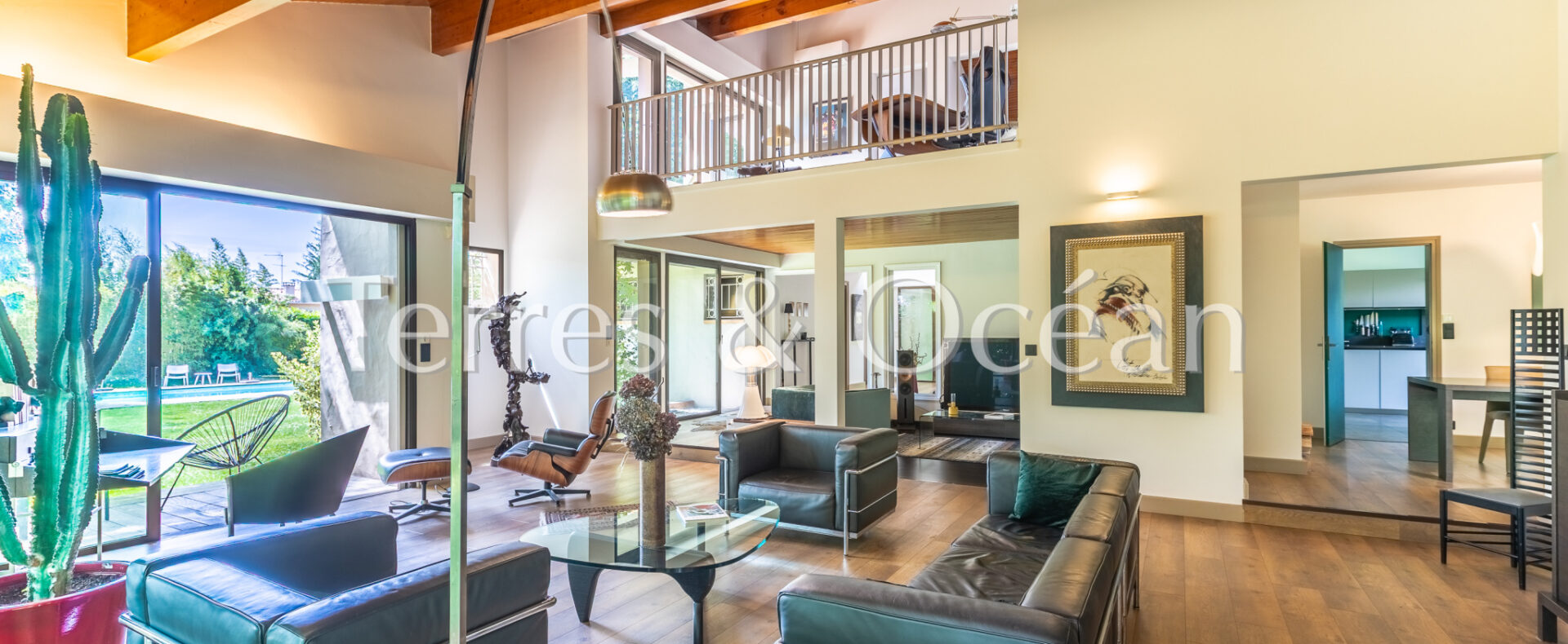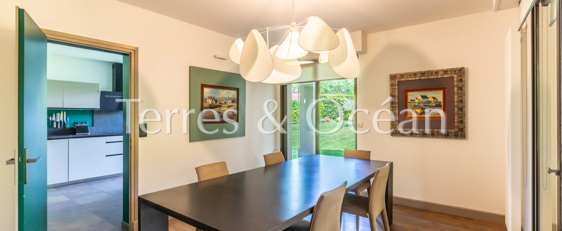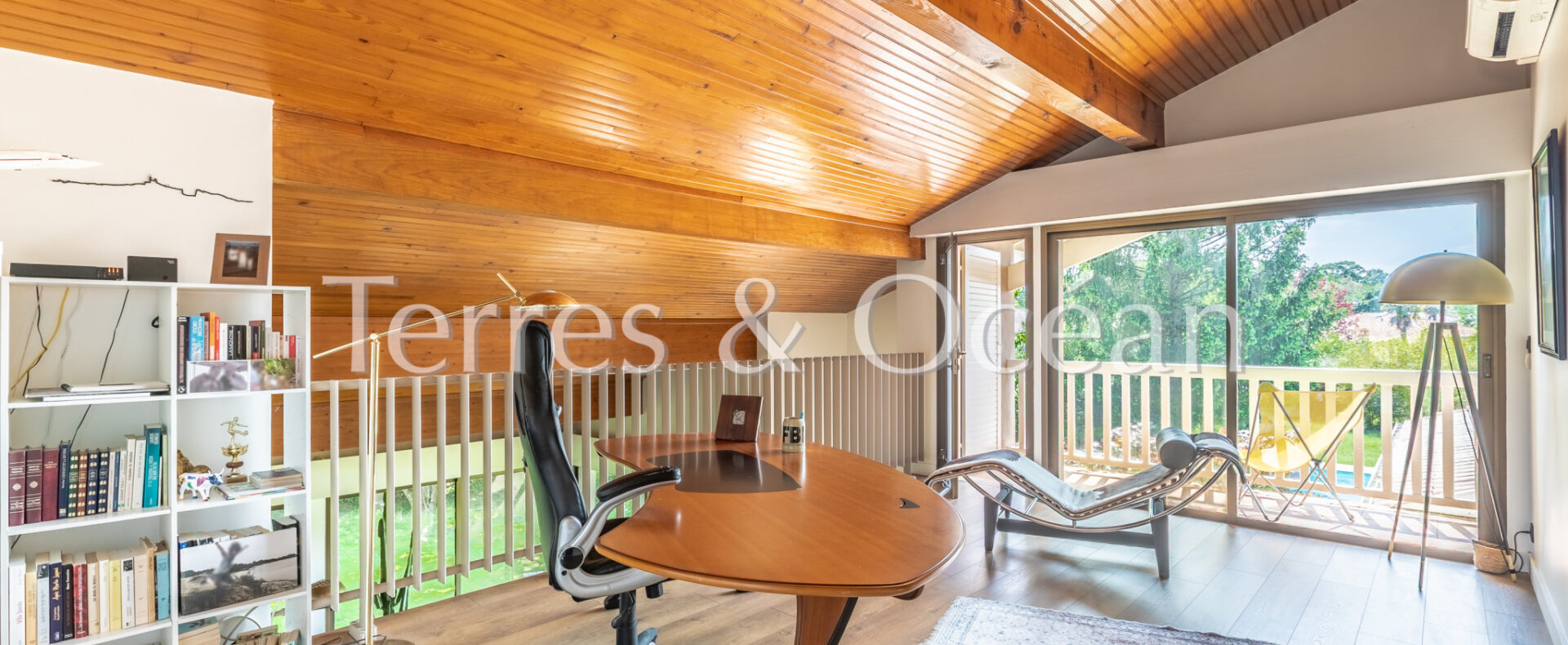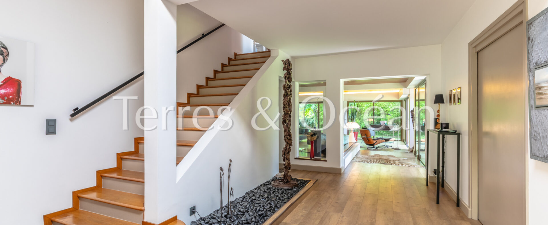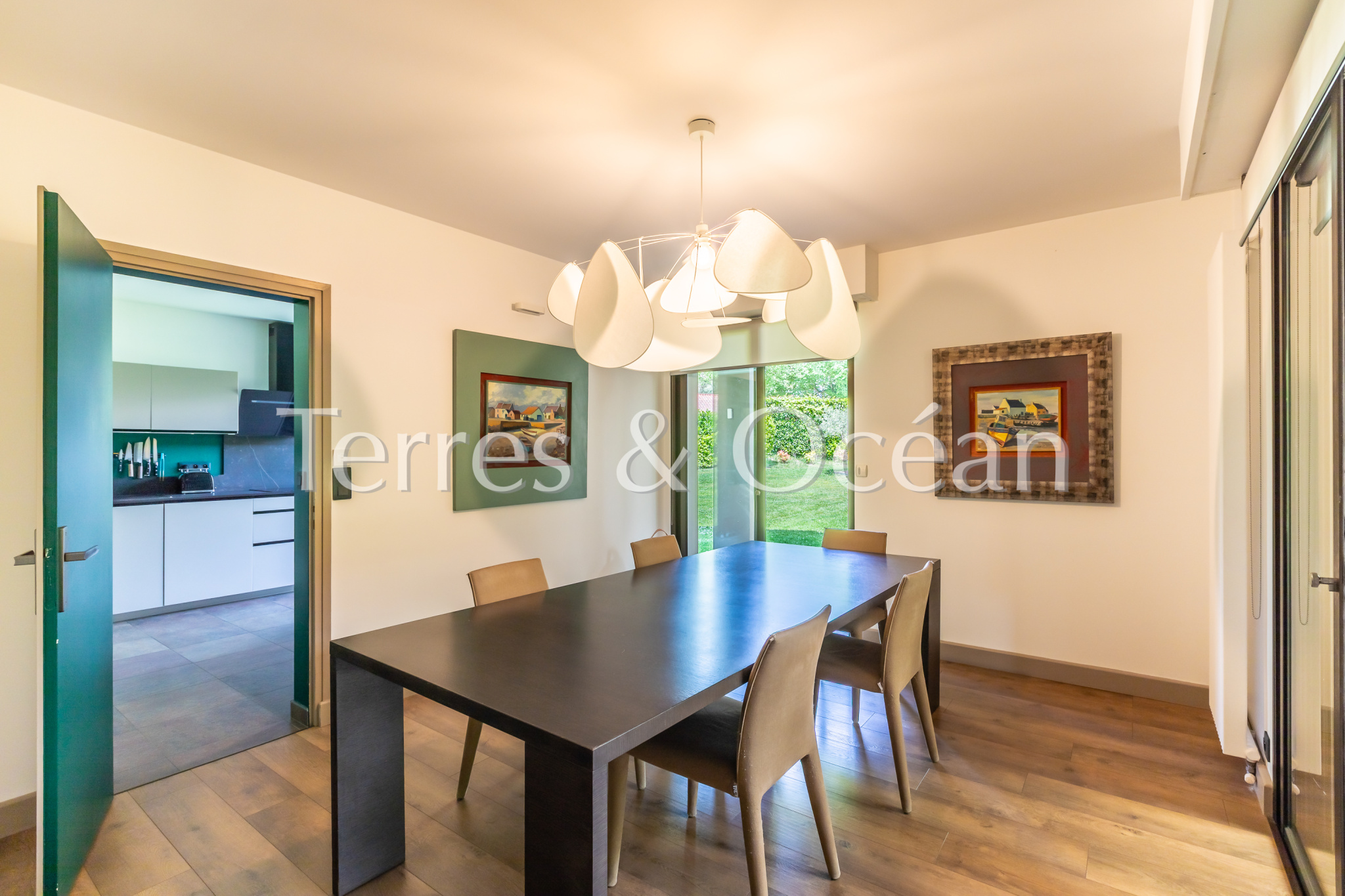 Au calme, proche du centre d’un village, à 12 min d’Hossegor et des plages, villa avec annexe en très bon état d’entretien. Bien exposée sur une parcelle joliment arborée de 3 200 m2, cette maison de construction traditionnelle de 1984 offre de beaux volumes, et une surface habitable de 243 m2, à laquelle s’ajoutent les 57 m2 de la maison d’amis. La maison principale dispose d’un beau séjour avec cheminée, baigné de lumière et largement ouvert sur l’extérieur, d’une cuisine séparée, de cinq chambres plus un bureau. En surfaces annexes, buanderie, cellier, double garage et atelier, grande terrasse partiellement couverte, piscine. Les prestations sont de qualité, chauffage gaz, climatisation, volets roulants électriques, panneaux photo-voltaïques … Ce bien de grande qualité pourra convenir en résidence principale aussi bien que pour une merveilleuse maison de vacances, mais aussi à une profession libérale avec la possibilité d’aménager la dépendance en bureau ou cabinet.