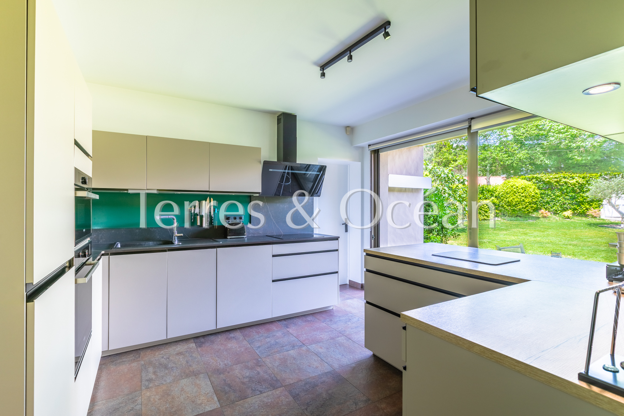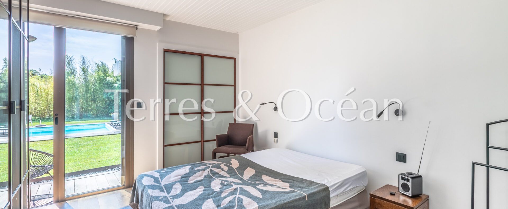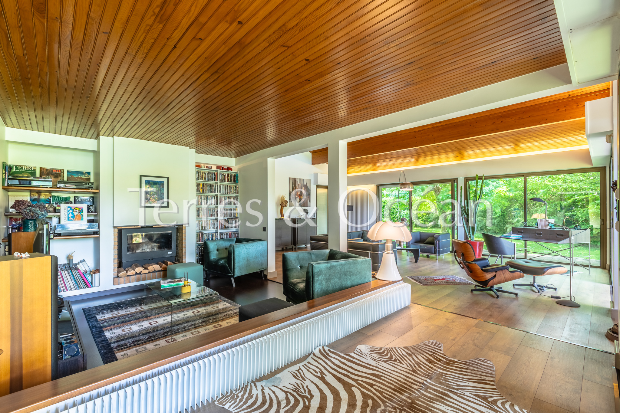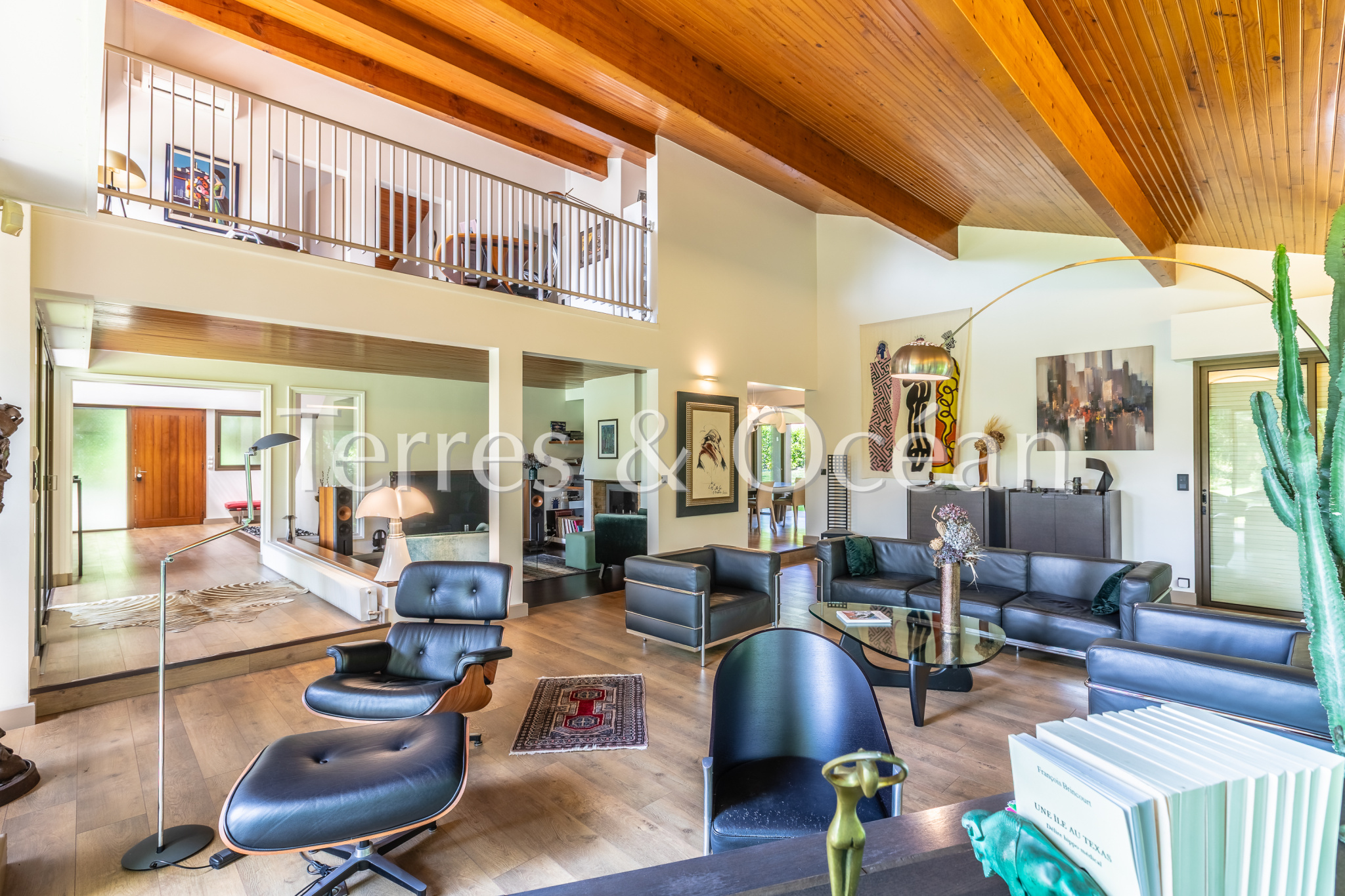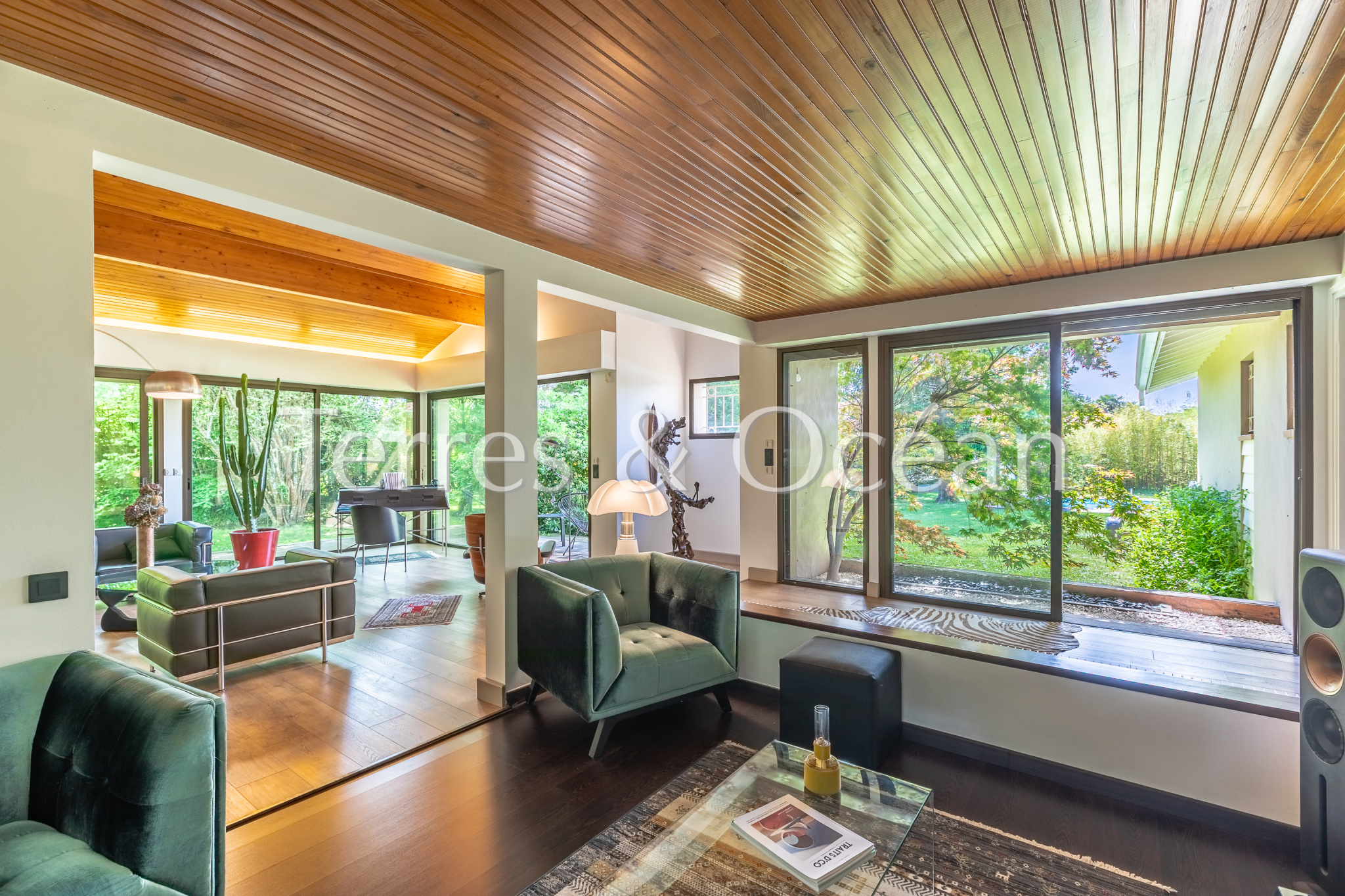 Au calme, proche du centre d’un village, à 12 min d’Hossegor et des plages, villa avec annexe en très bon état d’entretien. Bien exposée sur une parcelle joliment arborée de 3 200 m2, cette maison de construction traditionnelle de 1984 offre de beaux volumes, et une surface habitable de 243 m2, à laquelle s’ajoutent les 57 m2 de la maison d’amis. La maison principale dispose d’un beau séjour avec cheminée, baigné de lumière et largement ouvert sur l’extérieur, d’une cuisine séparée, de cinq chambres plus un bureau. En surfaces annexes, buanderie, cellier, double garage et atelier, grande terrasse partiellement couverte, piscine. Les prestations sont de qualité, chauffage gaz, climatisation, volets roulants électriques, panneaux photo-voltaïques … Ce bien de grande qualité pourra convenir en résidence principale aussi bien que pour une merveilleuse maison de vacances, mais aussi à une profession libérale avec la possibilité d’aménager la dépendance en bureau ou cabinet.