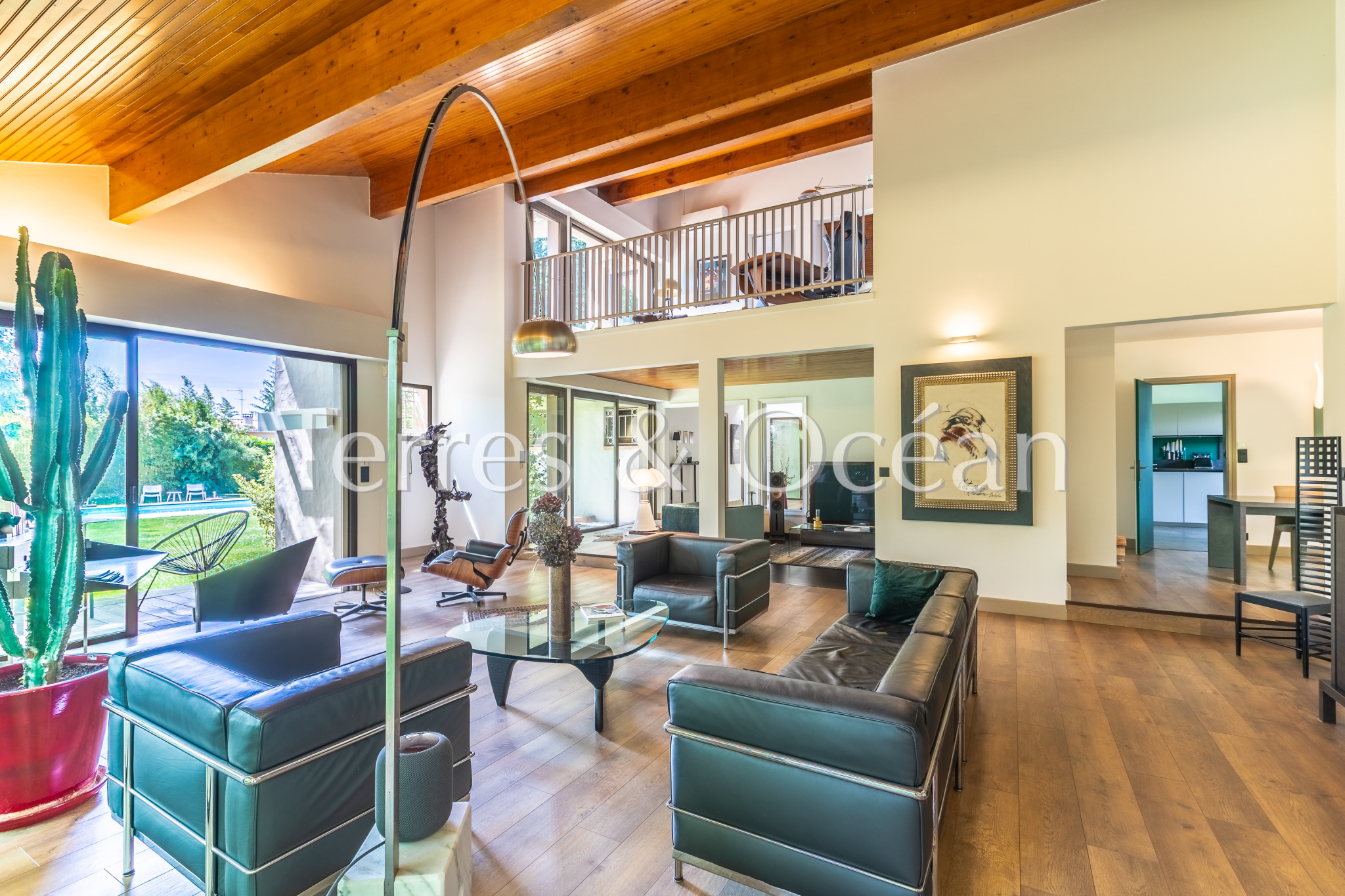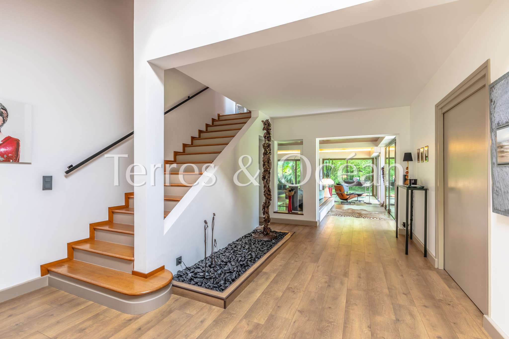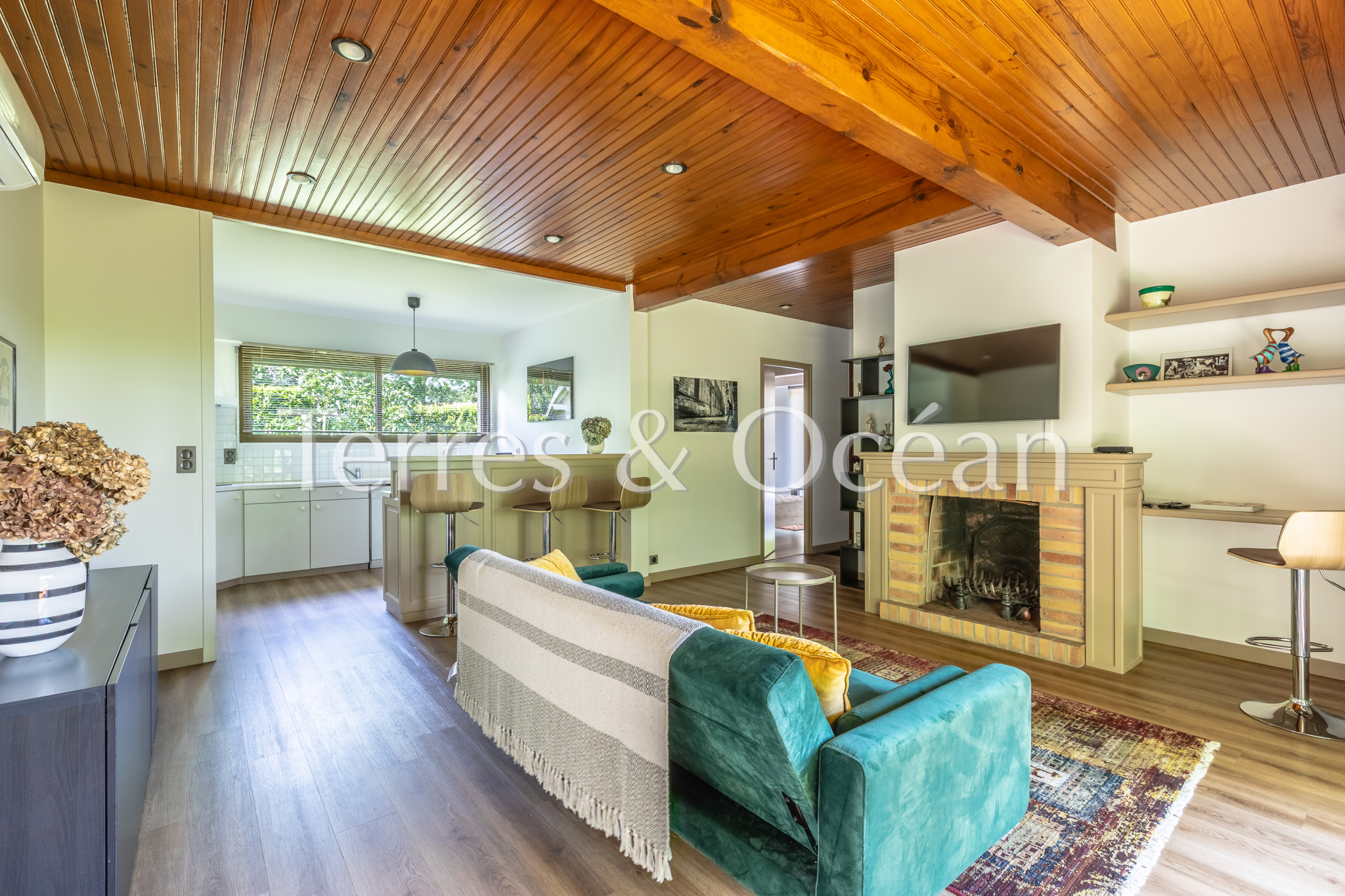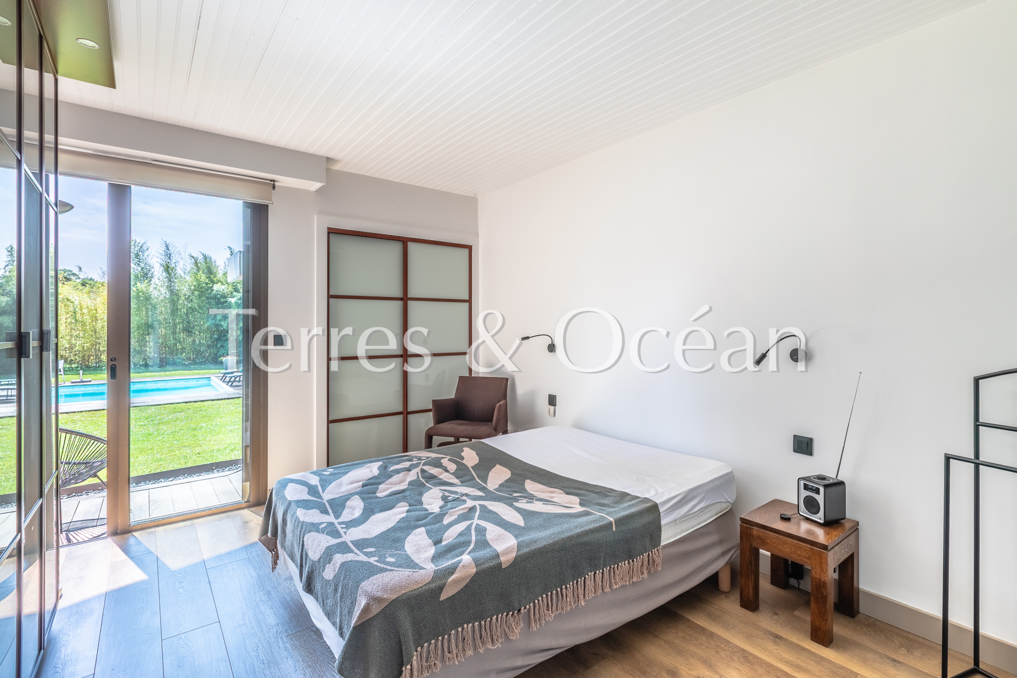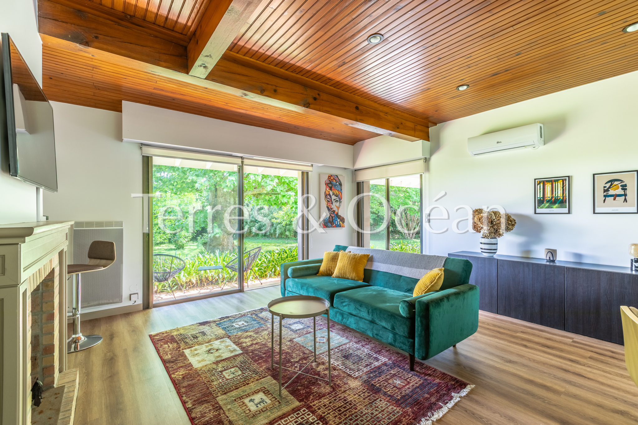Au calme, proche du centre d’un village, à 12 min d’Hossegor et des plages, villa avec annexe en très bon état d’entretien. Bien exposée sur une parcelle joliment arborée de 3 200 m2, cette maison de construction traditionnelle de 1984 offre de beaux volumes, et une surface habitable de 243 m2, à laquelle s’ajoutent les 57 m2 de la maison d’amis. La maison principale dispose d’un beau séjour avec cheminée, baigné de lumière et largement ouvert sur l’extérieur, d’une cuisine séparée, de cinq chambres plus un bureau. En surfaces annexes, buanderie, cellier, double garage et atelier, grande terrasse partiellement couverte, piscine. Les prestations sont de qualité, chauffage gaz, climatisation, volets roulants électriques, panneaux photo-voltaïques … Ce bien de grande qualité pourra convenir en résidence principale aussi bien que pour une merveilleuse maison de vacances, mais aussi à une profession libérale avec la possibilité d’aménager la dépendance en bureau ou cabinet.