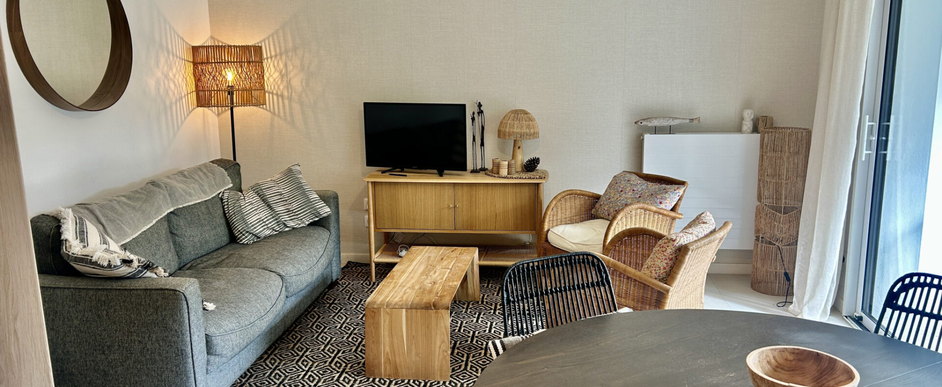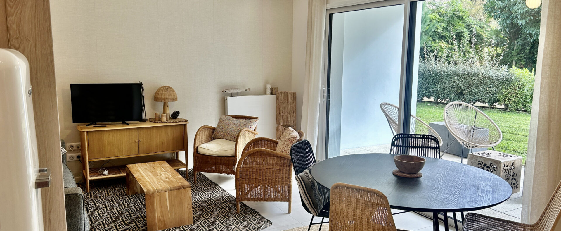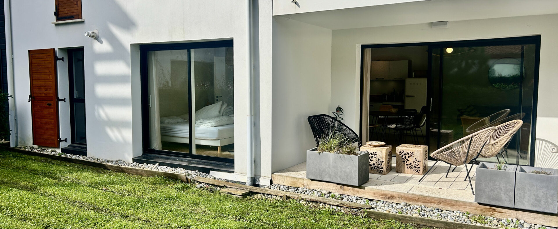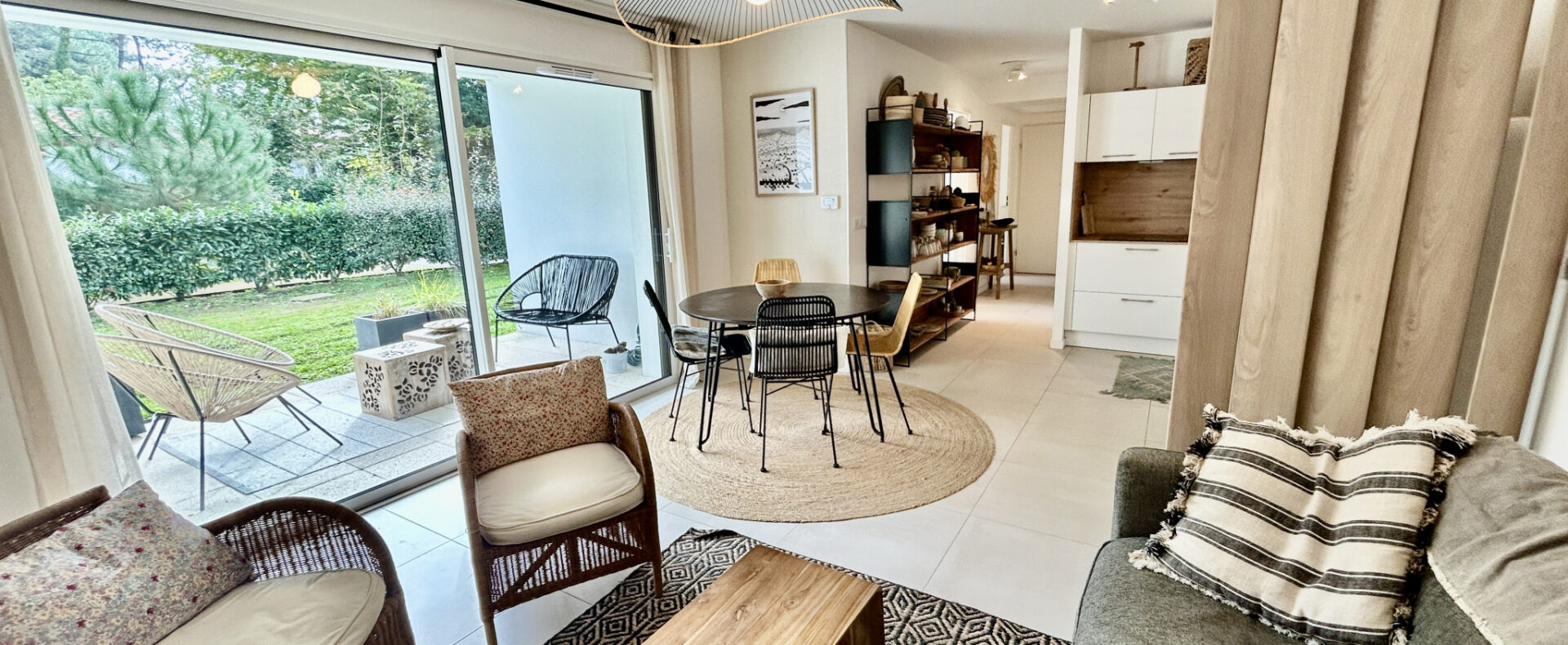 Superbe appartement rez de chaussée au coeur d’Hossegor, dans une résidence neuve. Il est composé d’une entrée avec placards, un salon/salle à manger avec cuisine équipée ouverte donnant sur une terrasse de plus de 10 m2, deux chambres avec placards, une salle d’eau, un wc et un espace buanderie. Un garage et possibilité d’en acquérir un autre. Résidence sécurisée. Nombre de lots : 23. Pas de procédure en cours.