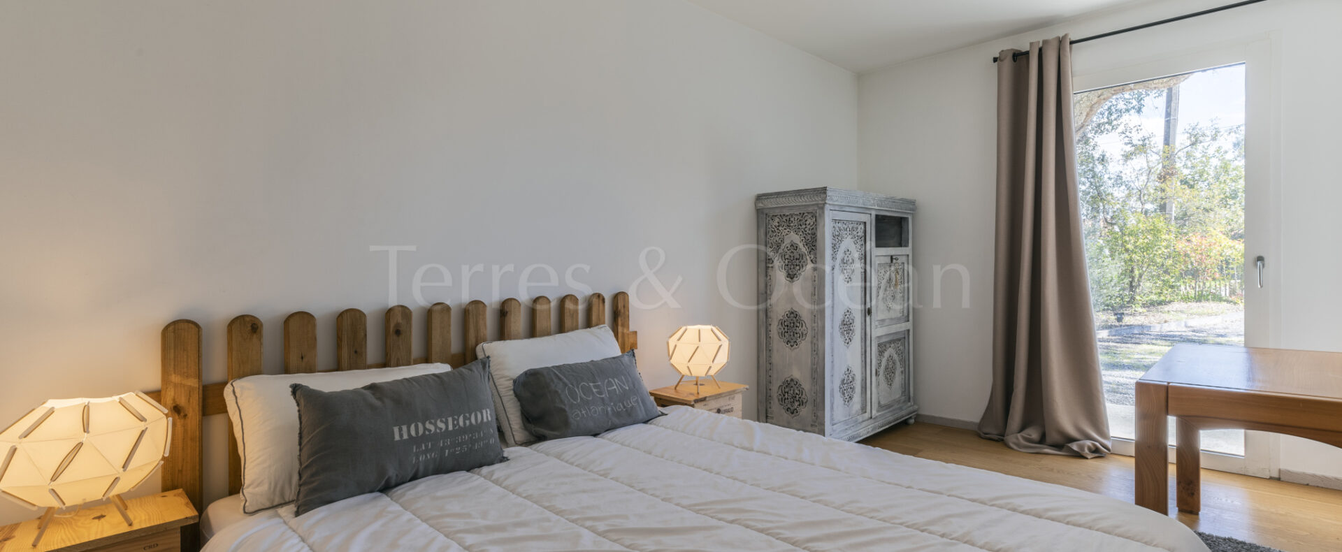 Le RDC comprend une entrée/dégagement, un grand salon/séjour avec cuisine ouverte aménagée et équipée, poêle à bois, une chambre avec salle d’eau/wc, deux autres chambres avec placards, salle d’eau/wc. Buanderie, garage et cave.