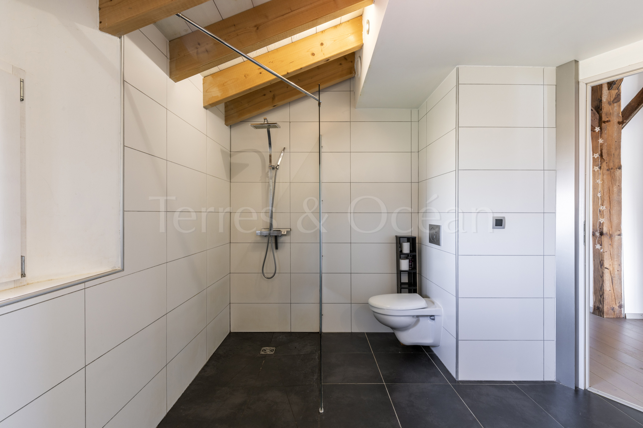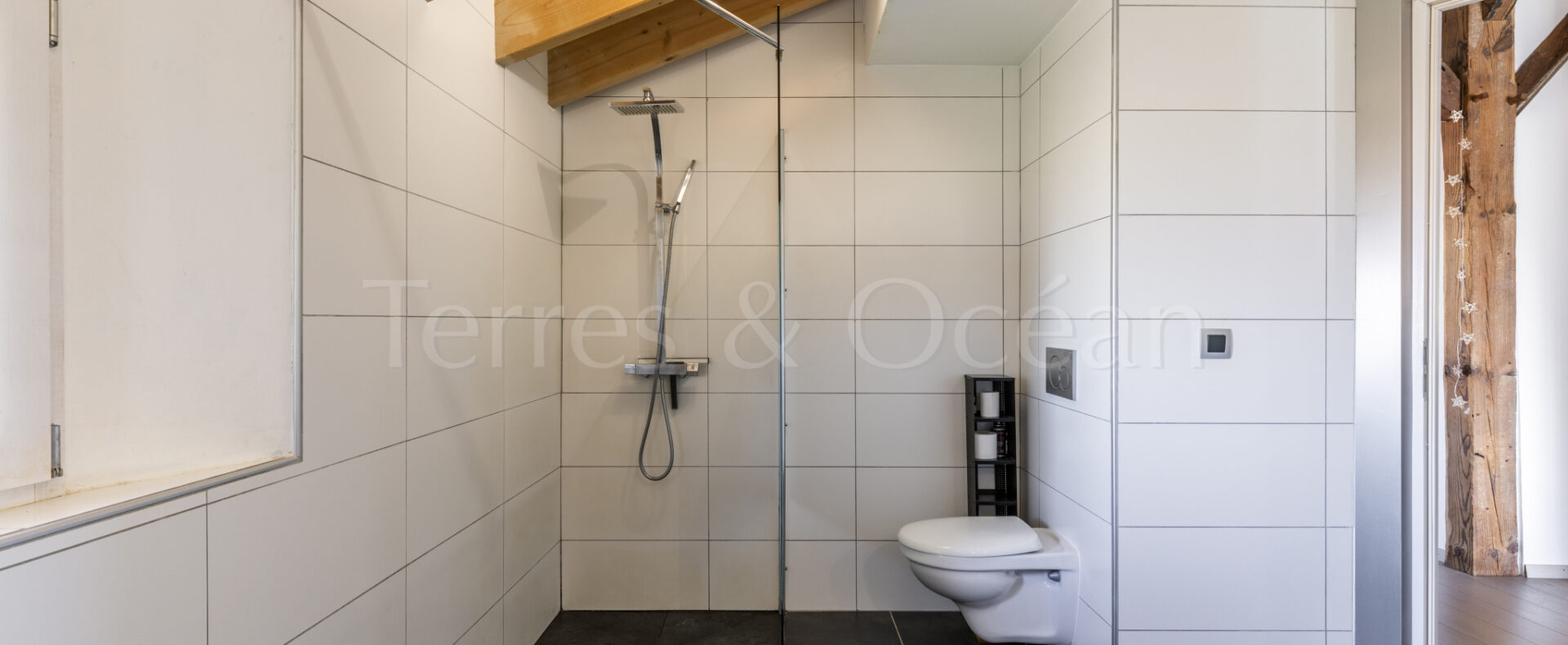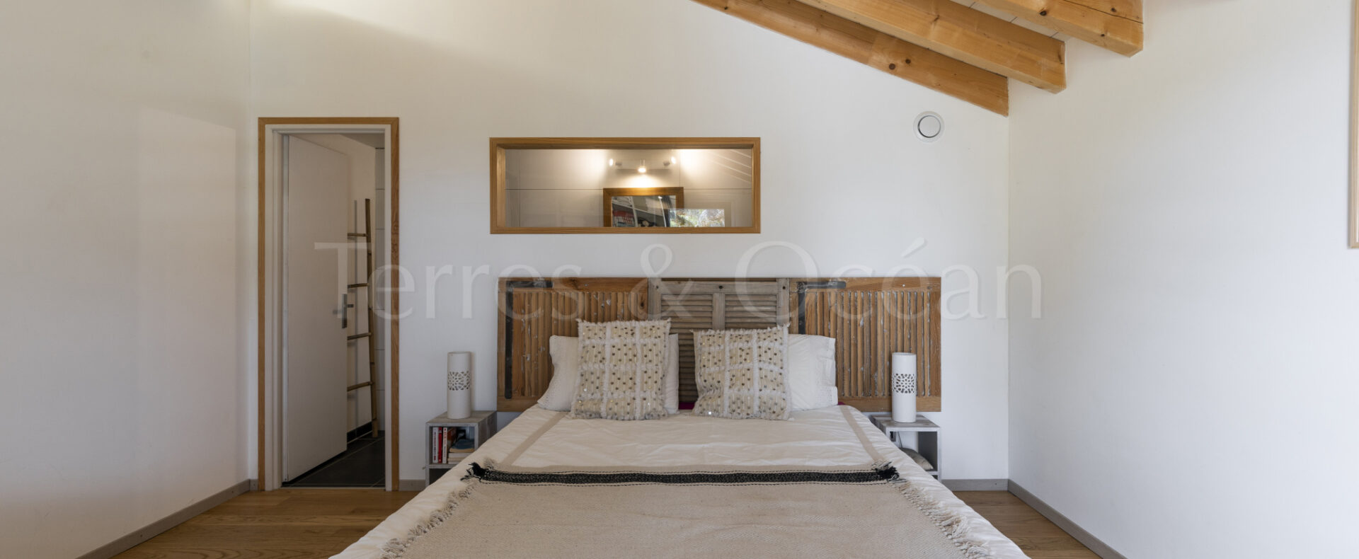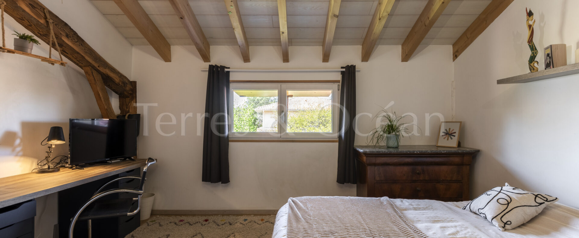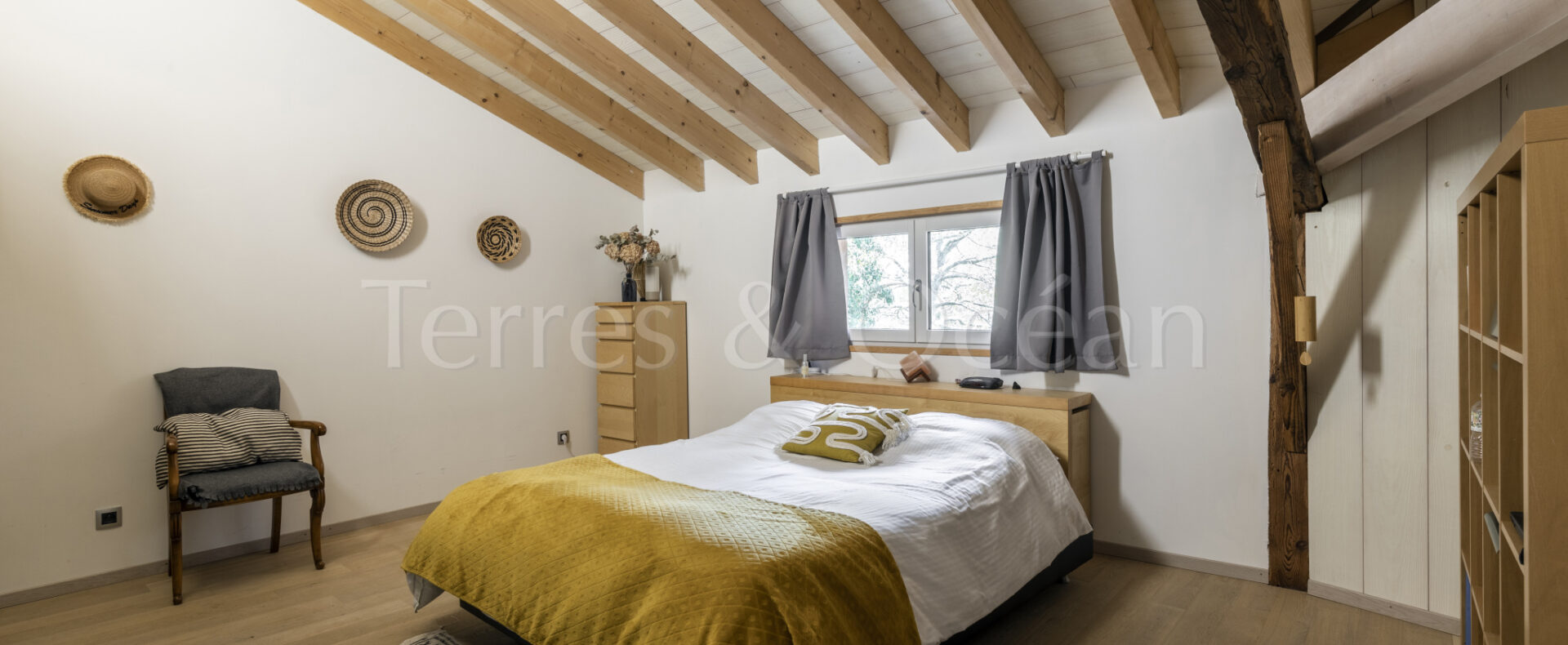 A l’étage une entrée/dégagement, escalier, toilettes invités, un grand salon/séjour avec une seconde cuisine ouverte aménagée et équipée. Très belle charpente apparente donnant un beau volume à la pièce. La partie nuit comprend 3 chambres avec rangements dont une en suite avec son dressing et sa salle d’eau, une autre salle d’eau avec wc.