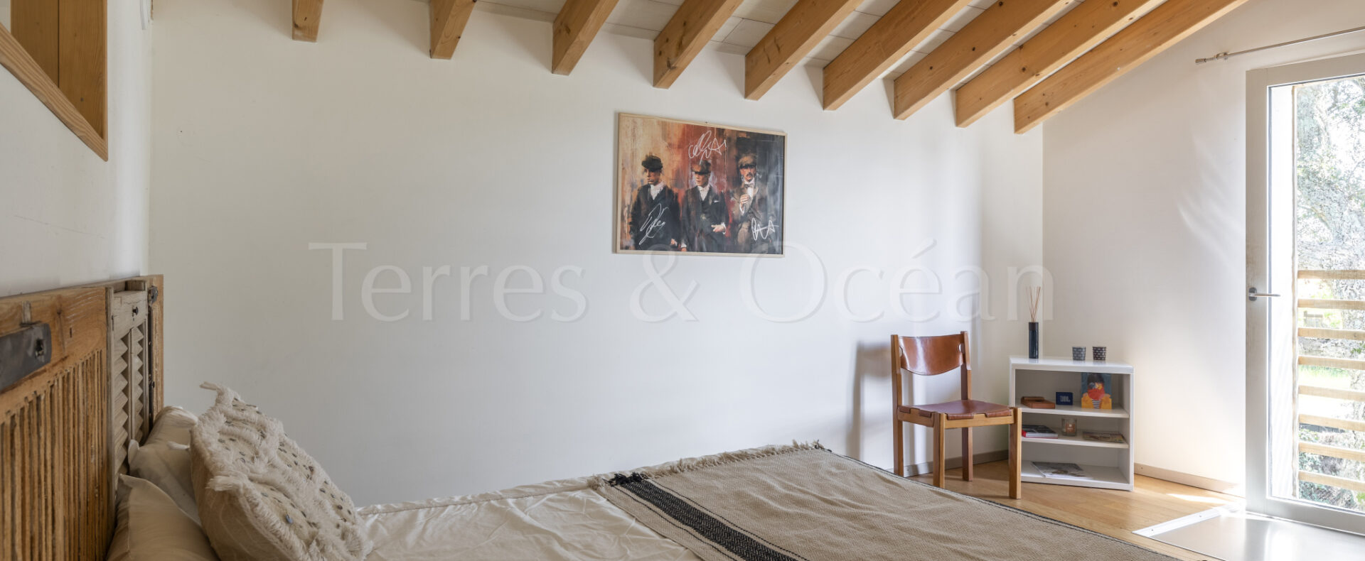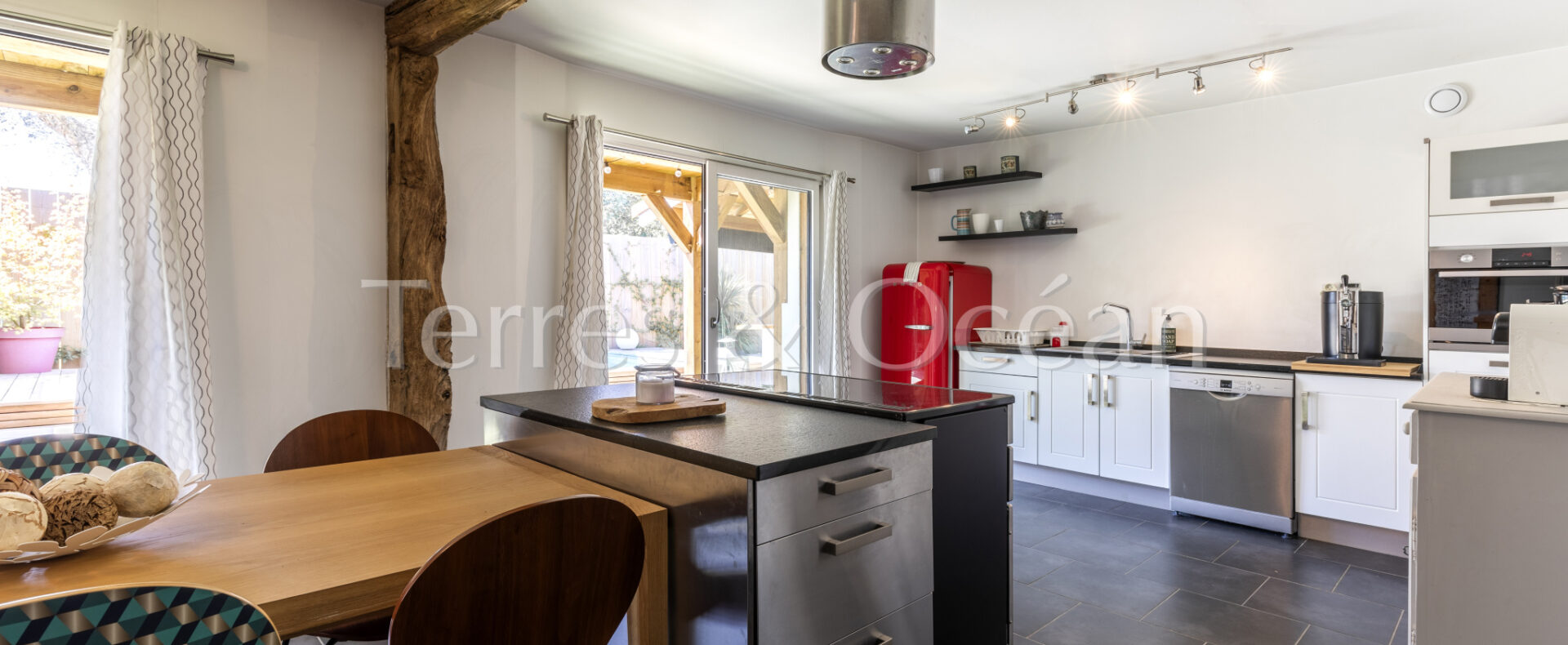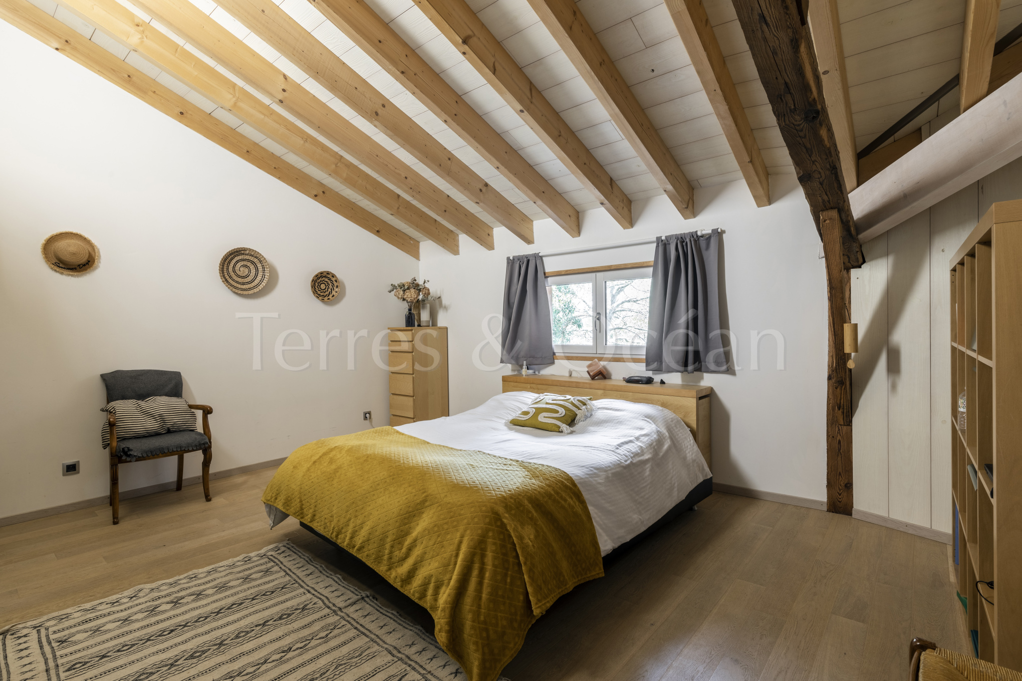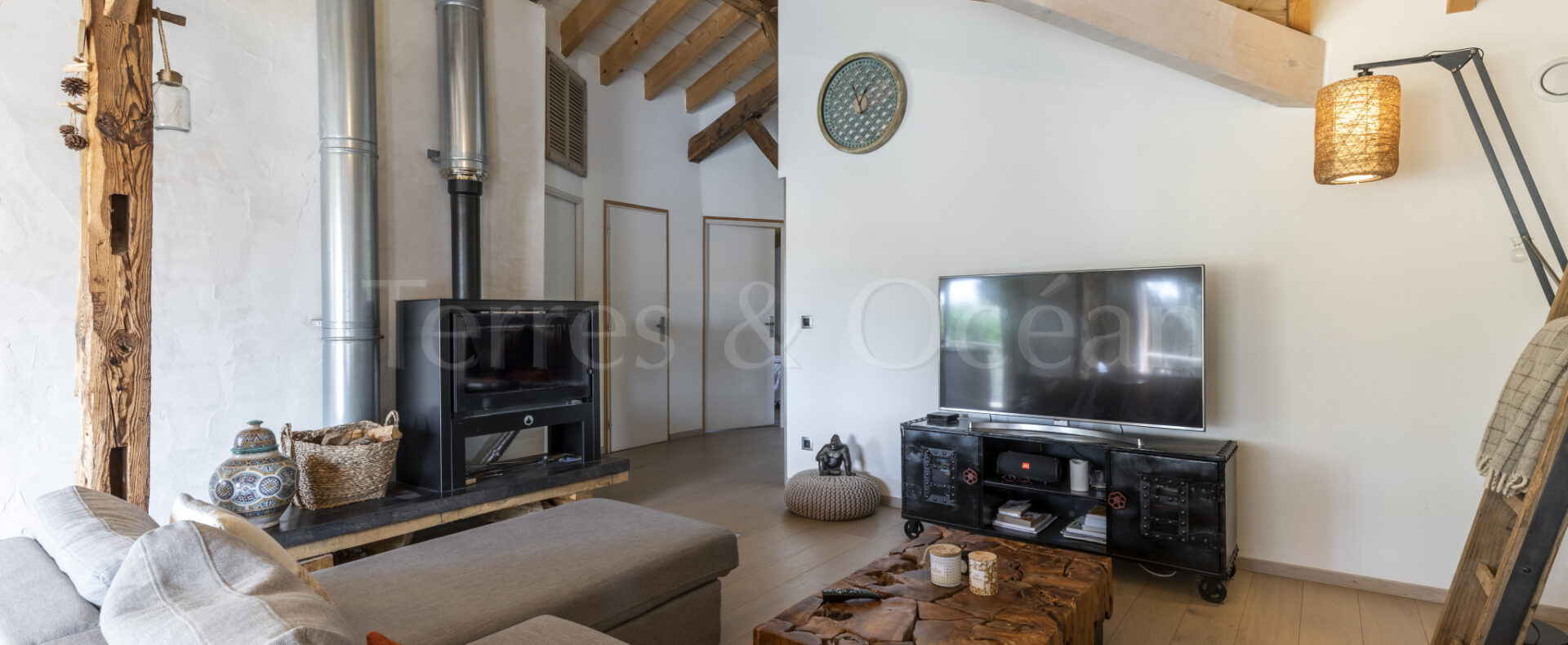 A l’étage une entrée/dégagement, escalier, toilettes invités, un grand salon/séjour avec une seconde cuisine ouverte aménagée et équipée. Très belle charpente apparente donnant un beau volume à la pièce. La partie nuit comprend 3 chambres avec rangements dont une en suite avec son dressing et sa salle d’eau, une autre salle d’eau avec wc.