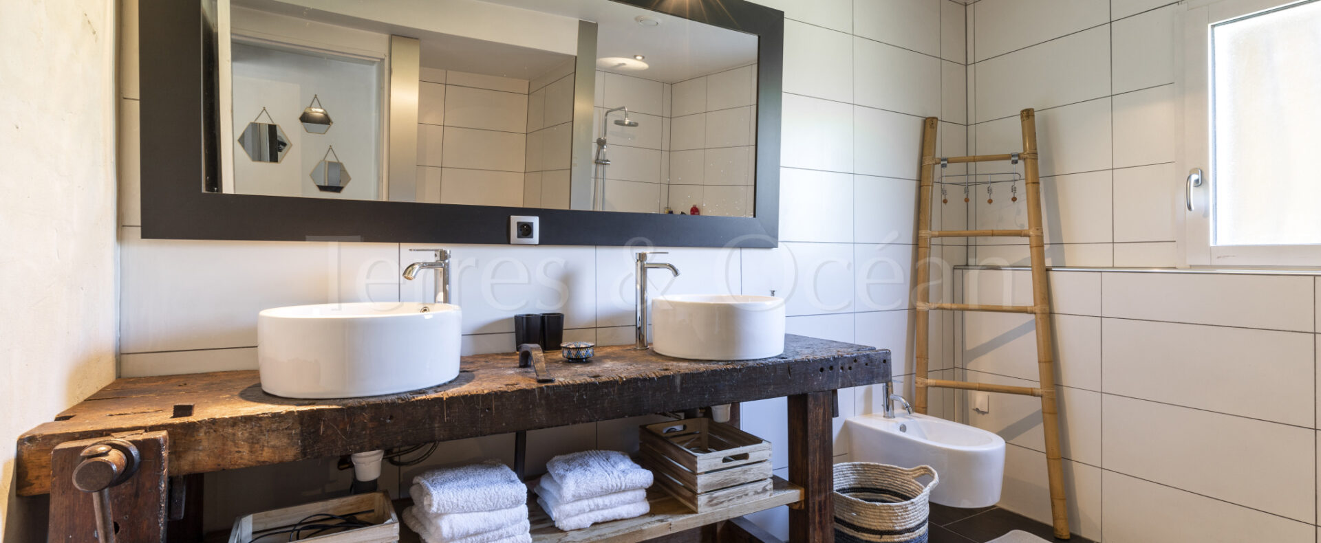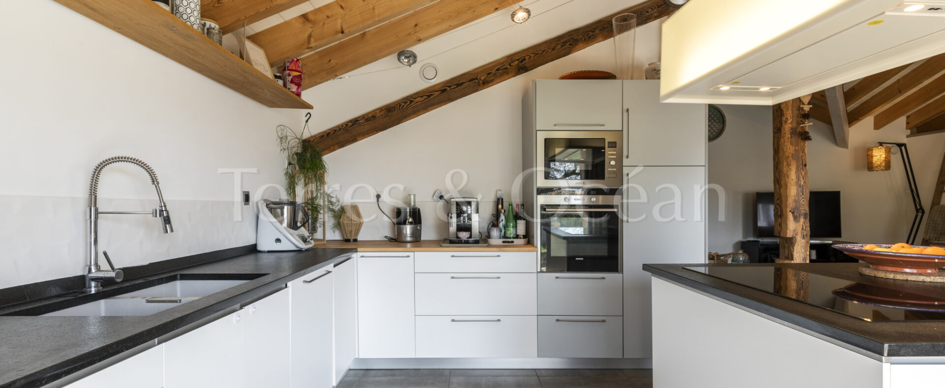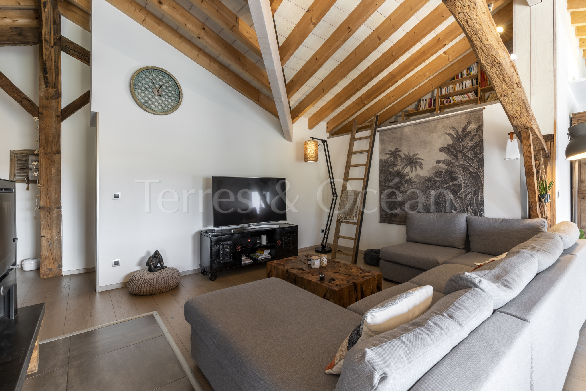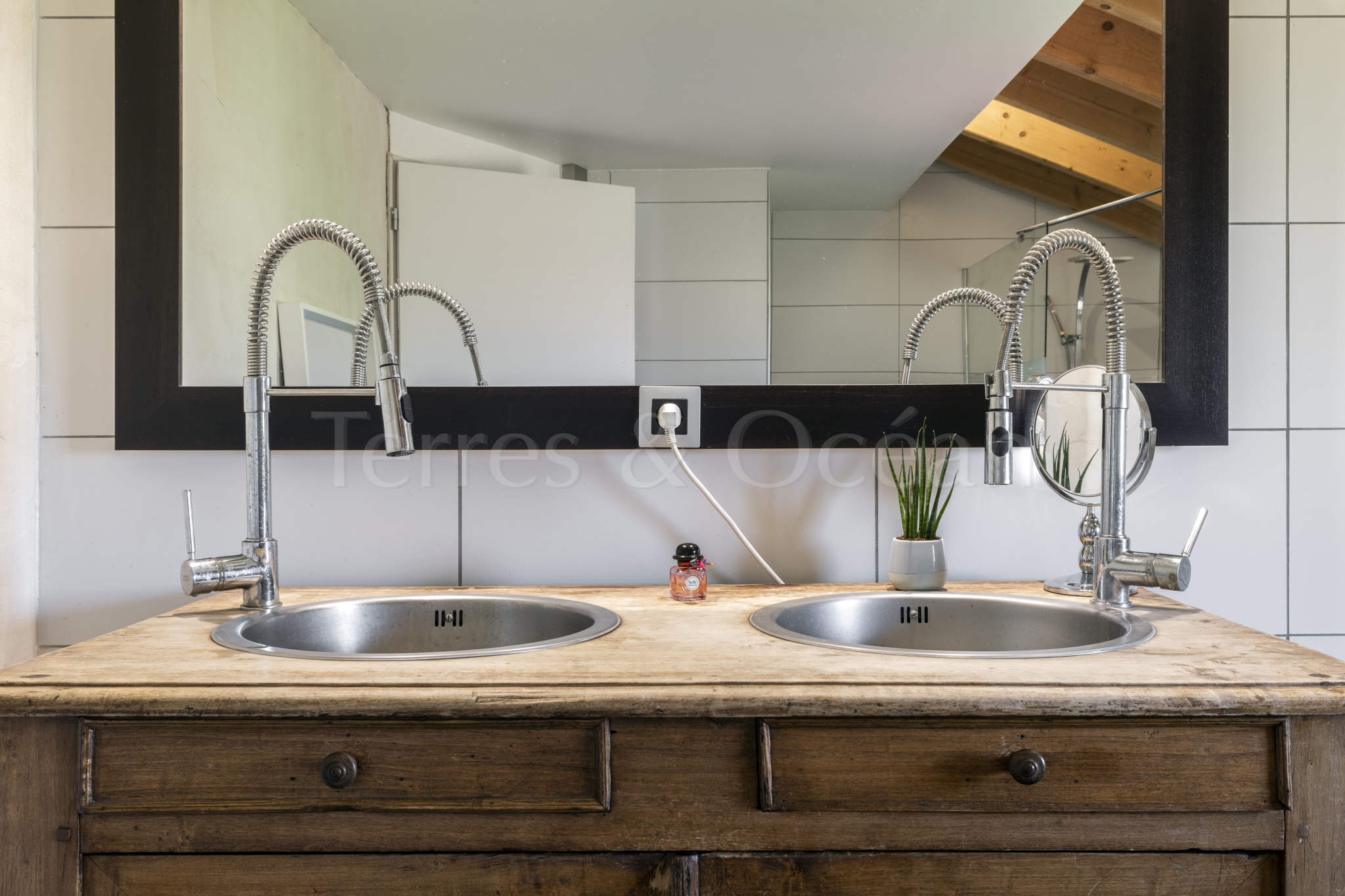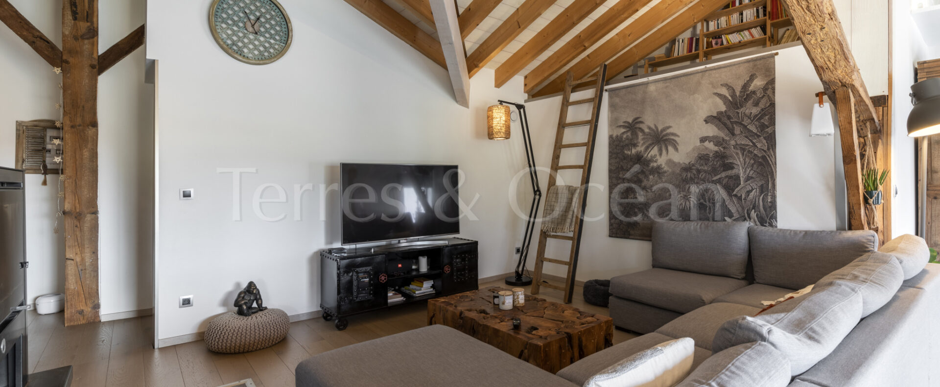 A l’étage une entrée/dégagement, escalier, toilettes invités, un grand salon/séjour avec une seconde cuisine ouverte aménagée et équipée. Très belle charpente apparente donnant un beau volume à la pièce. La partie nuit comprend 3 chambres avec rangements dont une en suite avec son dressing et sa salle d’eau, une autre salle d’eau avec wc.