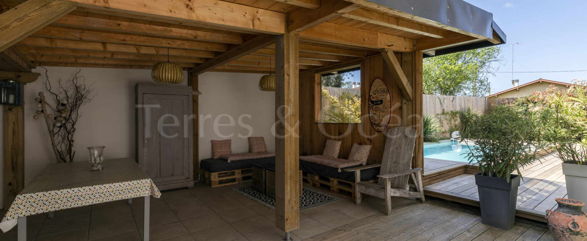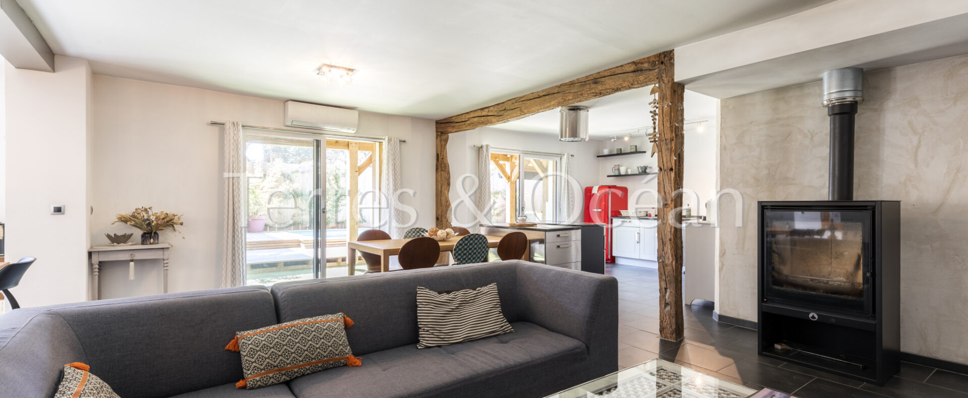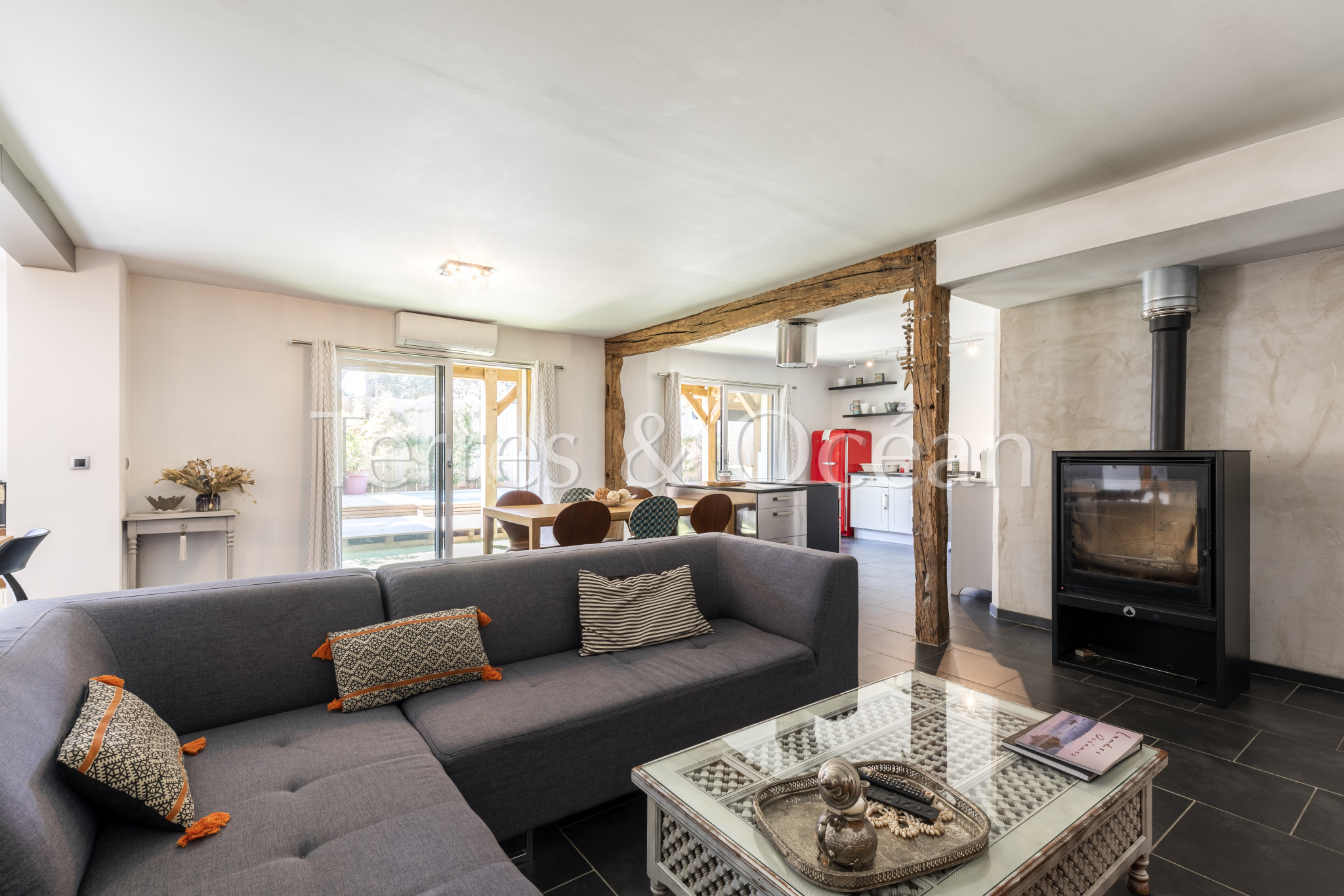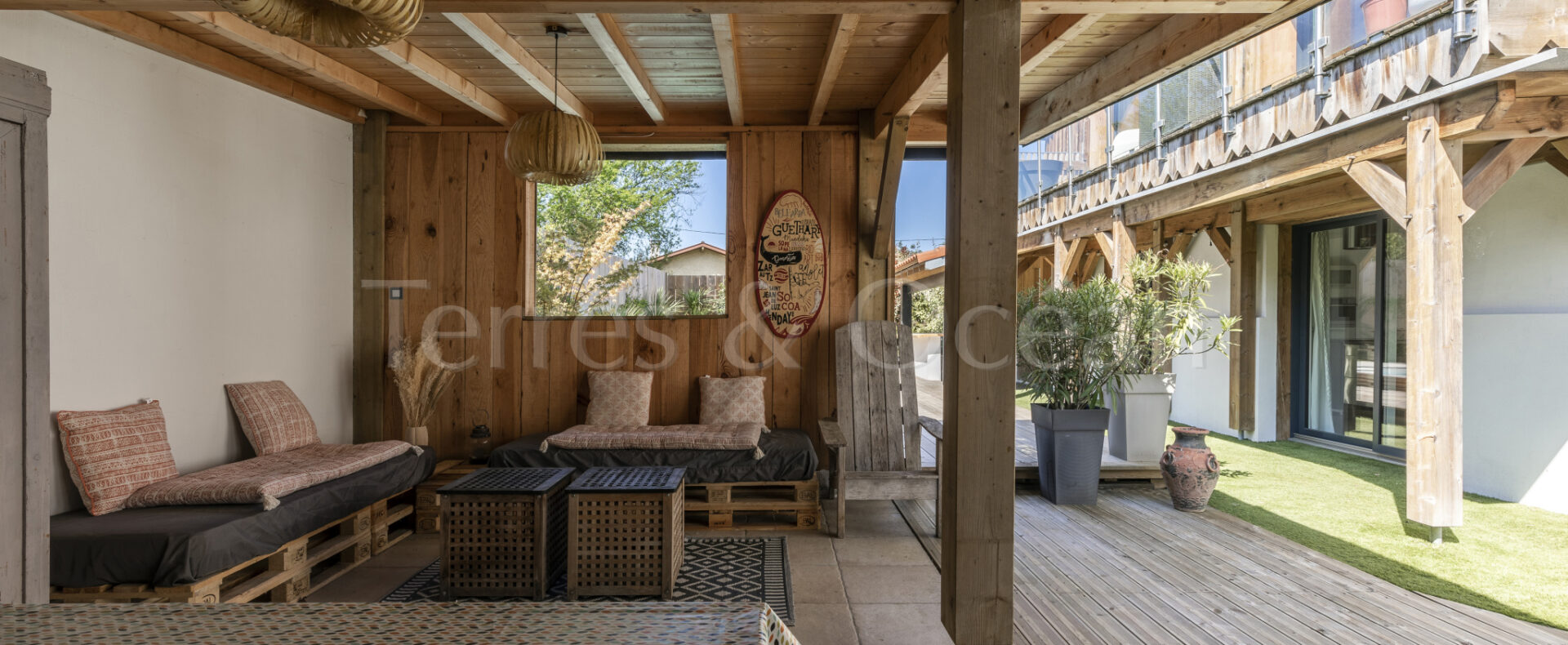 A 15 minutes d’Hossegor et 7 kms de l’océan, grande maison familiale d’une surface de 300 m2 environ, dans un environnement calme et préservé.