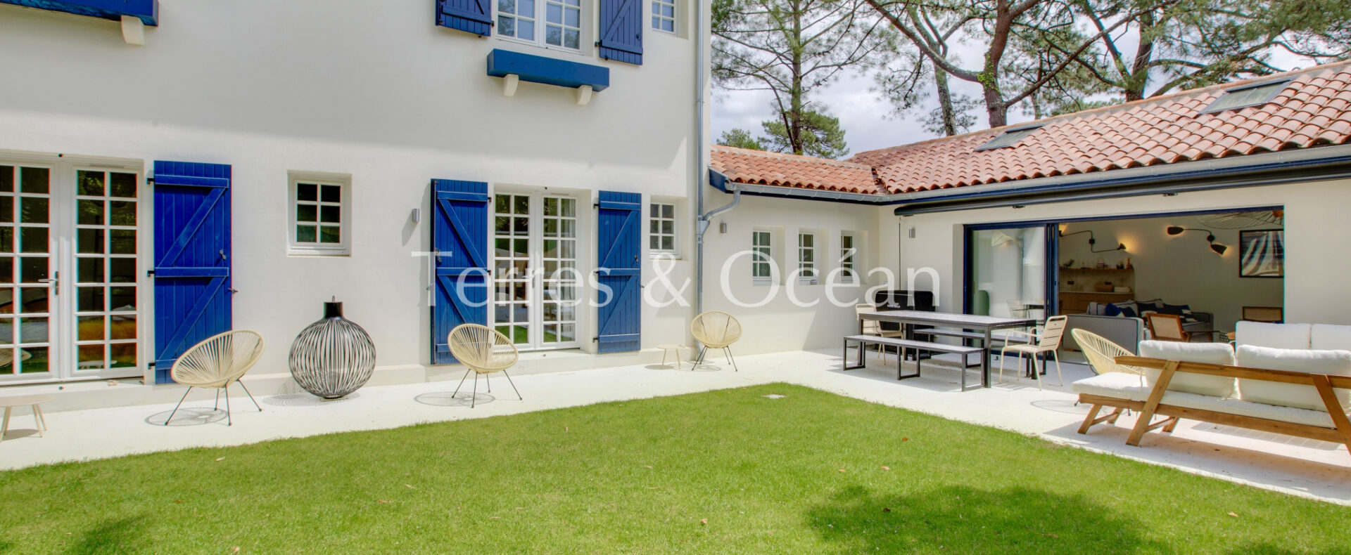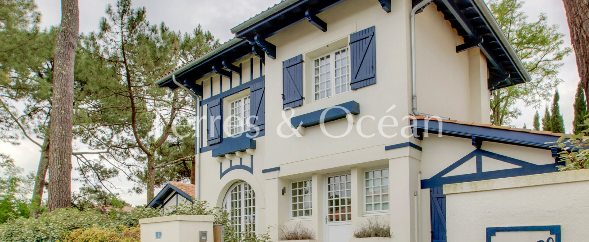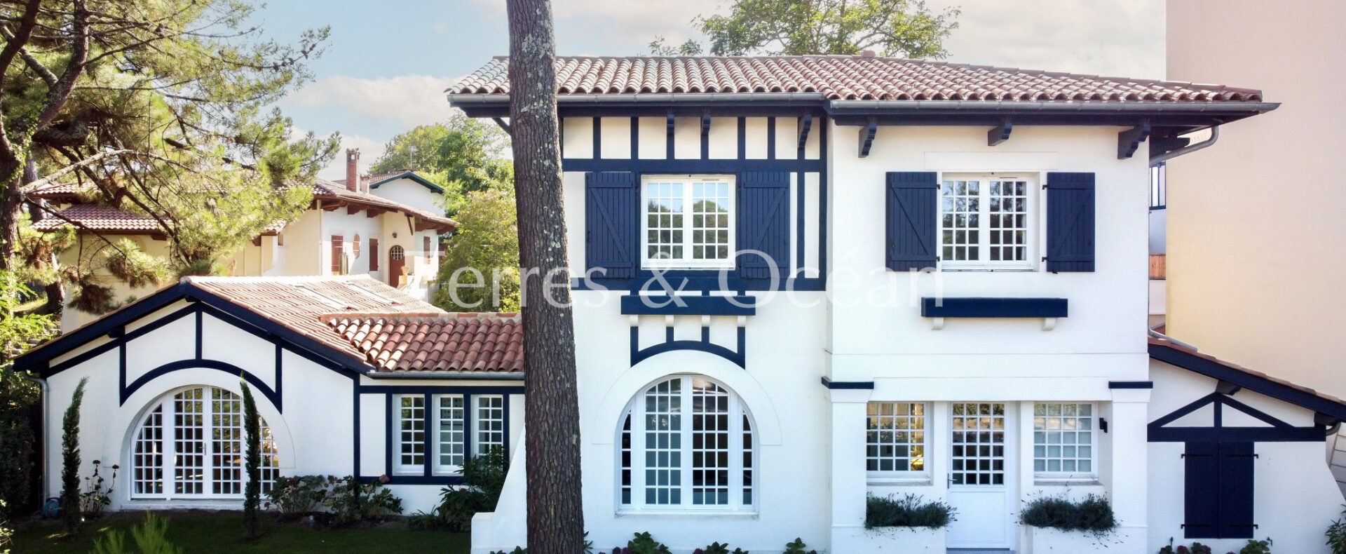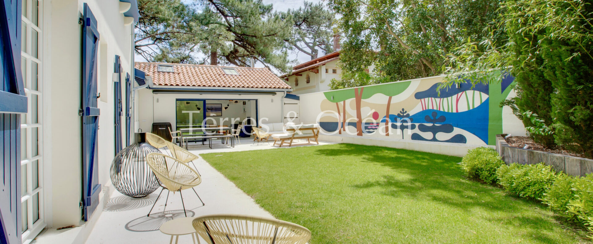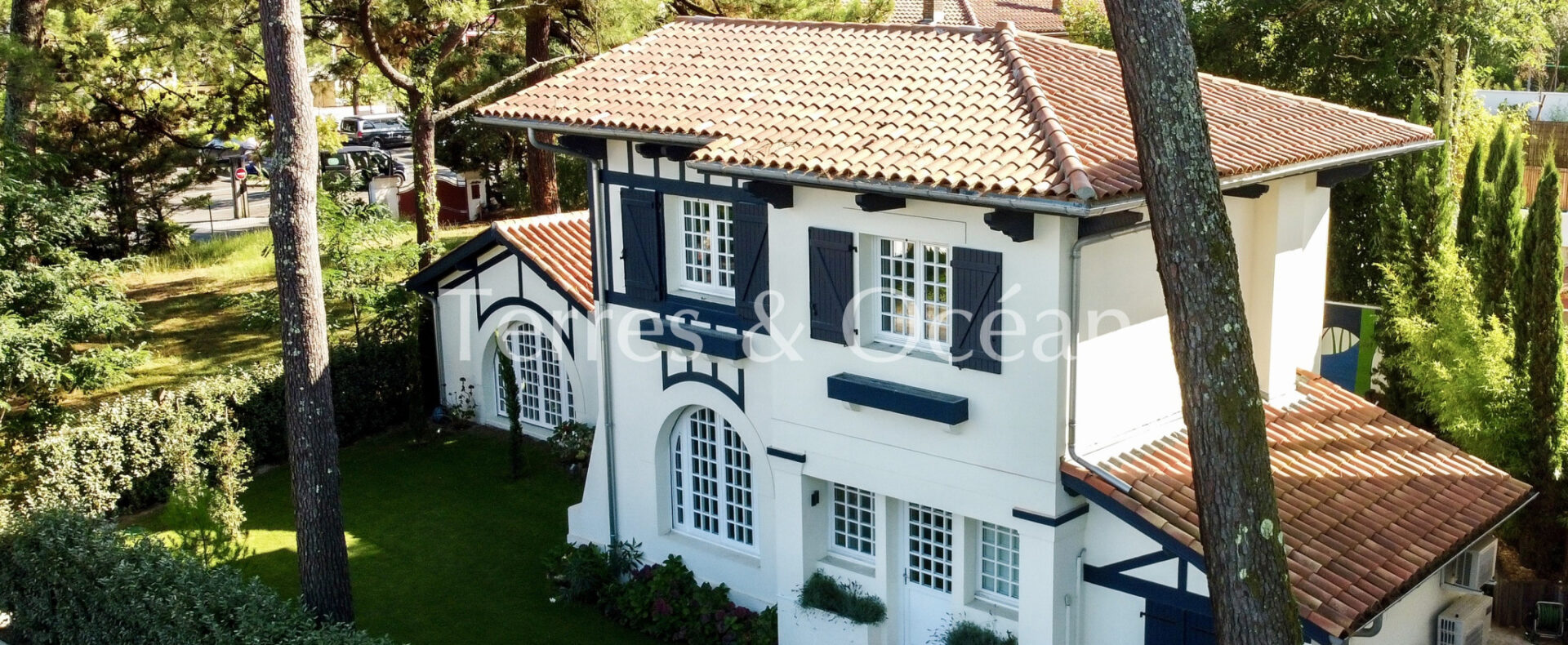 À quelques pas du marché, des commerces et du lac, se dévoile une villa d’exception édifiée en 1937 par l’architecte Louis Lagrange, maître incontesté du style basco-landais. Inscrite au patrimoine local, cette demeure emblématique marie avec justesse l’authenticité de son architecture et le confort de prestations contemporaines, dans un cadre privilégié au coeur d’Hossegor. Entièrement rénovée en 2024 avec des matériaux et finitions haut de gamme, la villa, entièrement climatisée, développe environ 170 m2 de surface au sol, dont 150 m2 habitables, au sein d’un jardin paysager intime. Une déclaration préalable a d’ores et déjà été validée pour l’édification d’une piscine côté sud, si l’acquéreur le souhaite. Le rez-de-chaussée offre une vaste pièce de vie baignée de lumière, réunissant salon, salle à manger et cuisine équipée. Le sol en terrazzo, qui se prolonge vers la terrasse extérieure, crée une parfaite continuité entre intérieur et extérieur. Le mobilier et les banquettes sur-mesure viennent souligner l’élégance de l’ensemble. Trois chambres, chacune avec salle d’eau privative, complètent harmonieusement ce niveau. À l’étage, deux chambres supplémentaires s’accompagnent d’une salle d’eau et d’une salle de bains. Deux mezzanines ouvertes, conçues pour accueillir des couchages d’appoint de qualité, offrent une capacité d’accueil généreuse, sans compromis sur le confort. À l’extérieur, le jardin clos et aménagé, doté d’un forage et d’un système d’arrosage automatique, est sublimé par une fresque originale signée Steven Burke, conférant à la propriété une dimension artistique singulière. Alliance rare entre patrimoine architectural et modernité, finitions soignées et emplacement recherché : cette villa incarne une opportunité unique.