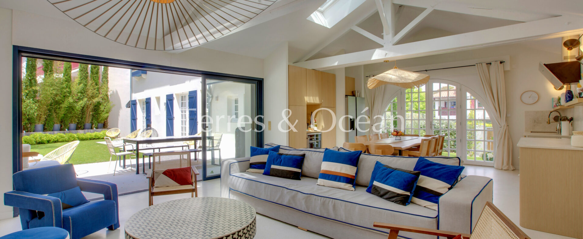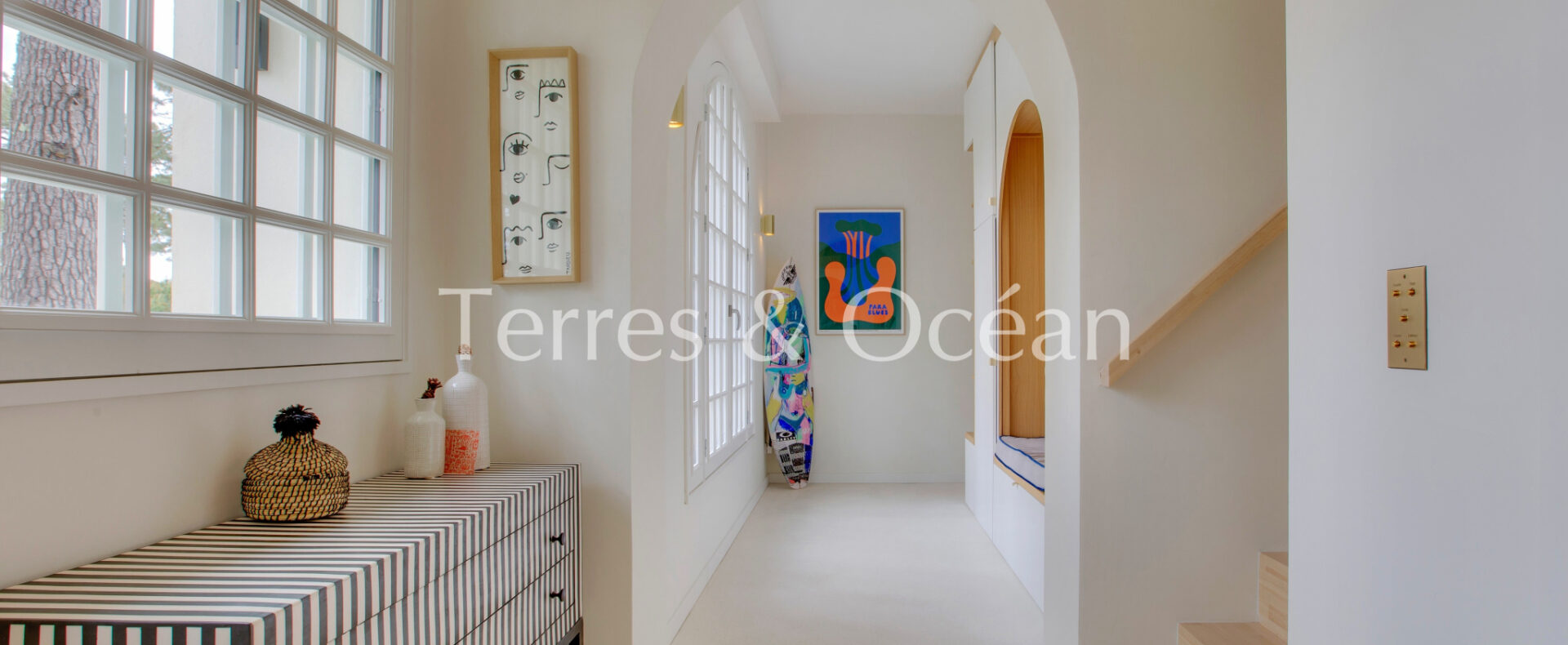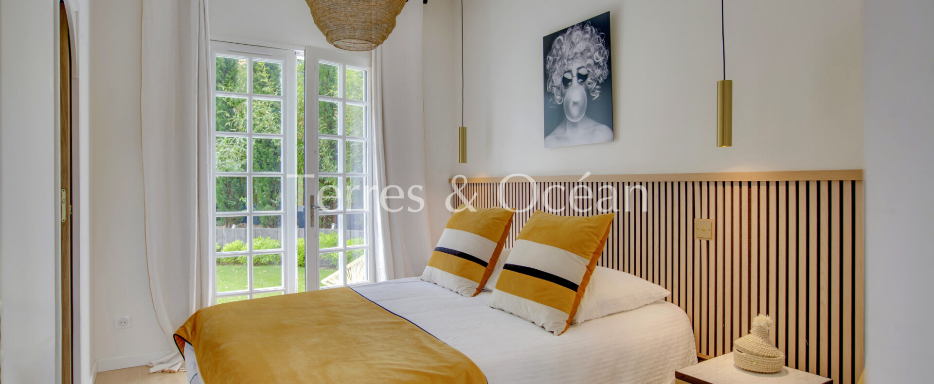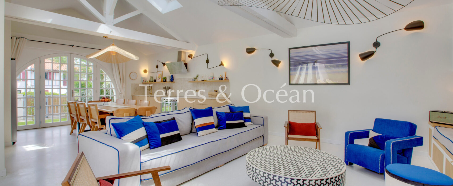 À quelques pas du marché, des commerces et du lac, se dévoile une villa d’exception édifiée en 1937 par l’architecte Louis Lagrange, maître incontesté du style basco-landais. Inscrite au patrimoine local, cette demeure emblématique marie avec justesse l’authenticité de son architecture et le confort de prestations contemporaines, dans un cadre privilégié au coeur d’Hossegor. Entièrement rénovée en 2024 avec des matériaux et finitions haut de gamme, la villa, entièrement climatisée, développe environ 170 m2 de surface au sol, dont 150 m2 habitables, au sein d’un jardin paysager intime. Une déclaration préalable a d’ores et déjà été validée pour l’édification d’une piscine côté sud, si l’acquéreur le souhaite. Le rez-de-chaussée offre une vaste pièce de vie baignée de lumière, réunissant salon, salle à manger et cuisine équipée. Le sol en terrazzo, qui se prolonge vers la terrasse extérieure, crée une parfaite continuité entre intérieur et extérieur. Le mobilier et les banquettes sur-mesure viennent souligner l’élégance de l’ensemble. Trois chambres, chacune avec salle d’eau privative, complètent harmonieusement ce niveau. À l’étage, deux chambres supplémentaires s’accompagnent d’une salle d’eau et d’une salle de bains. Deux mezzanines ouvertes, conçues pour accueillir des couchages d’appoint de qualité, offrent une capacité d’accueil généreuse, sans compromis sur le confort. À l’extérieur, le jardin clos et aménagé, doté d’un forage et d’un système d’arrosage automatique, est sublimé par une fresque originale signée Steven Burke, conférant à la propriété une dimension artistique singulière. Alliance rare entre patrimoine architectural et modernité, finitions soignées et emplacement recherché : cette villa incarne une opportunité unique.