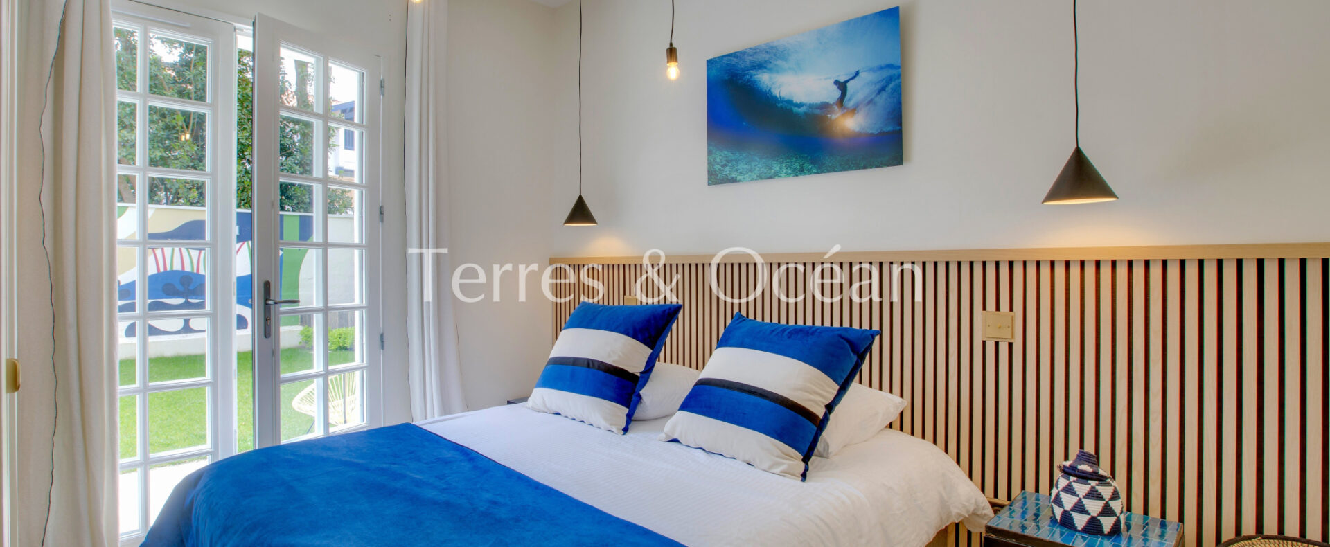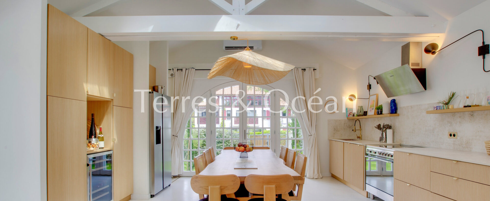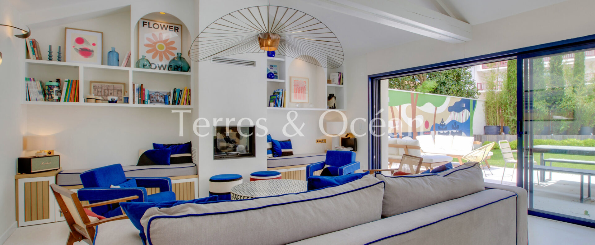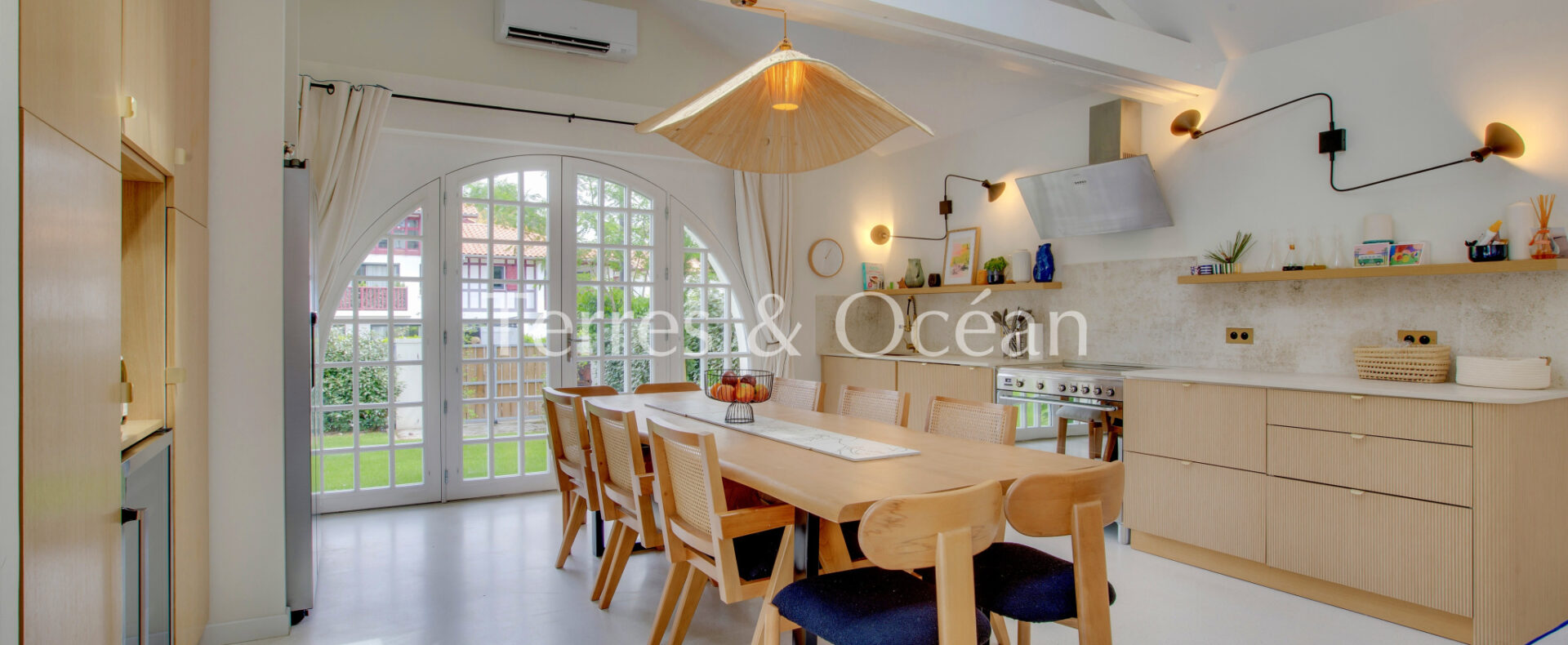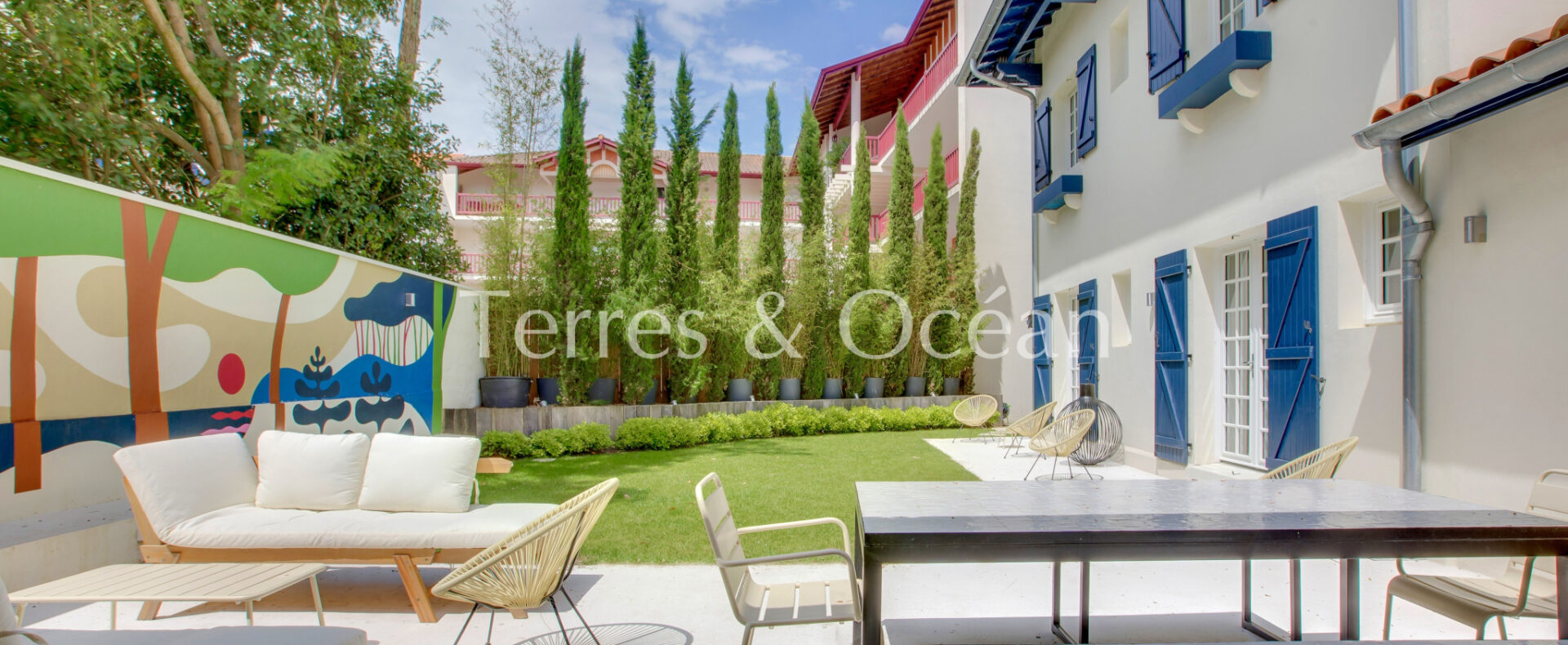 À quelques pas du marché, des commerces et du lac, se dévoile une villa d’exception édifiée en 1937 par l’architecte Louis Lagrange, maître incontesté du style basco-landais. Inscrite au patrimoine local, cette demeure emblématique marie avec justesse l’authenticité de son architecture et le confort de prestations contemporaines, dans un cadre privilégié au coeur d’Hossegor. Entièrement rénovée en 2024 avec des matériaux et finitions haut de gamme, la villa, entièrement climatisée, développe environ 170 m2 de surface au sol, dont 150 m2 habitables, au sein d’un jardin paysager intime. Une déclaration préalable a d’ores et déjà été validée pour l’édification d’une piscine côté sud, si l’acquéreur le souhaite. Le rez-de-chaussée offre une vaste pièce de vie baignée de lumière, réunissant salon, salle à manger et cuisine équipée. Le sol en terrazzo, qui se prolonge vers la terrasse extérieure, crée une parfaite continuité entre intérieur et extérieur. Le mobilier et les banquettes sur-mesure viennent souligner l’élégance de l’ensemble. Trois chambres, chacune avec salle d’eau privative, complètent harmonieusement ce niveau. À l’étage, deux chambres supplémentaires s’accompagnent d’une salle d’eau et d’une salle de bains. Deux mezzanines ouvertes, conçues pour accueillir des couchages d’appoint de qualité, offrent une capacité d’accueil généreuse, sans compromis sur le confort. À l’extérieur, le jardin clos et aménagé, doté d’un forage et d’un système d’arrosage automatique, est sublimé par une fresque originale signée Steven Burke, conférant à la propriété une dimension artistique singulière. Alliance rare entre patrimoine architectural et modernité, finitions soignées et emplacement recherché : cette villa incarne une opportunité unique.