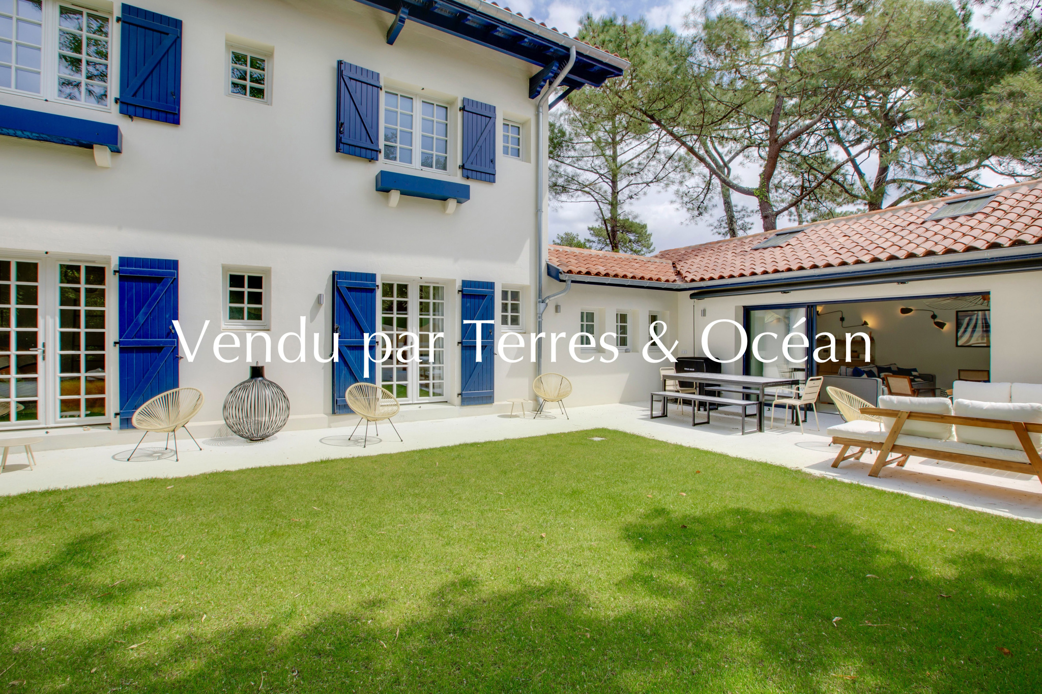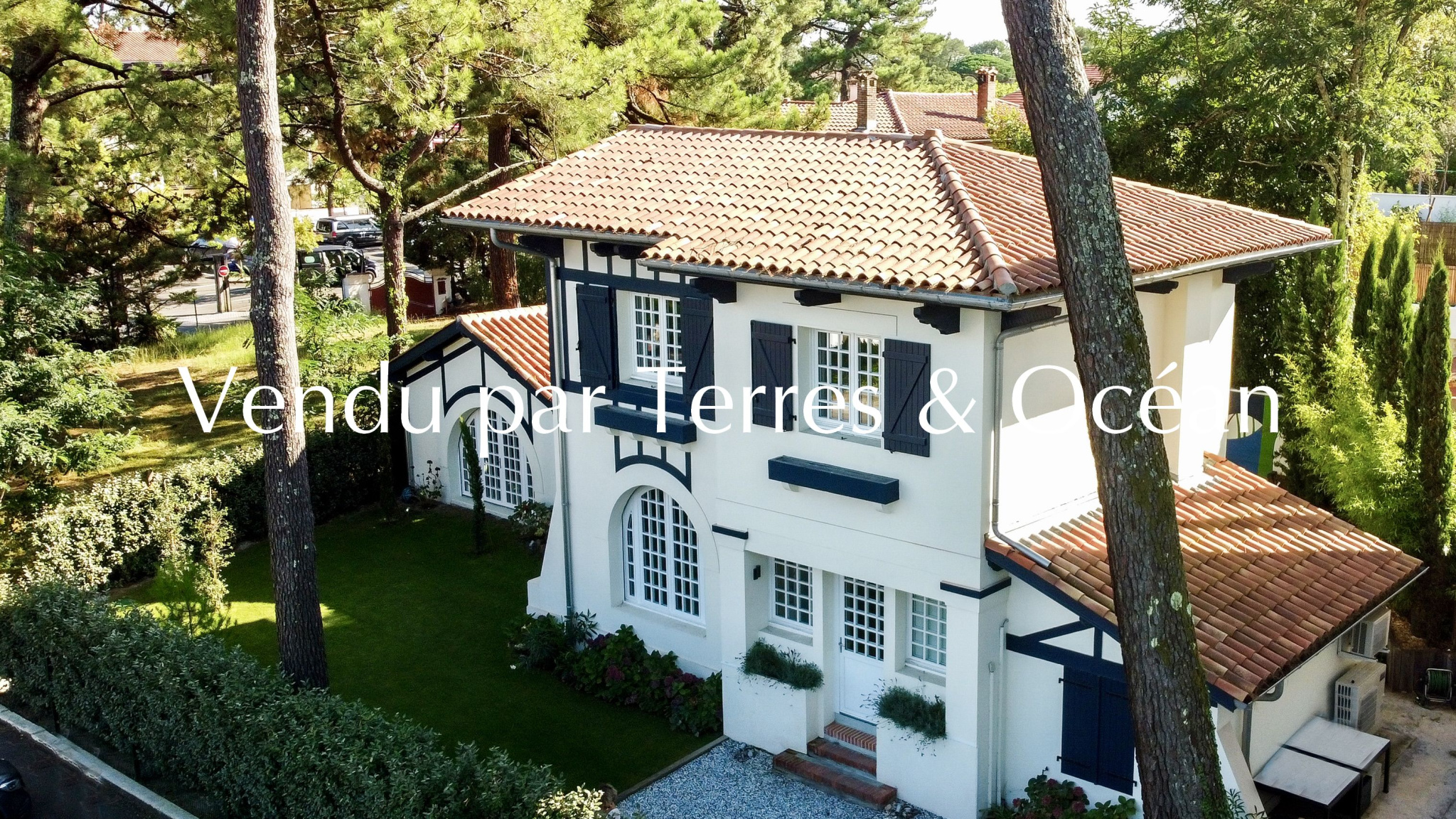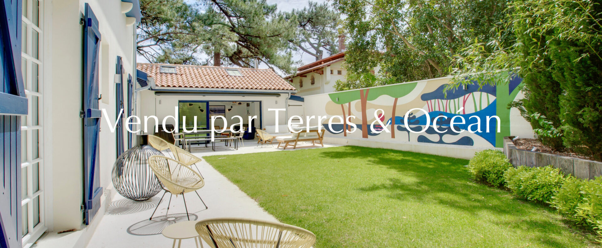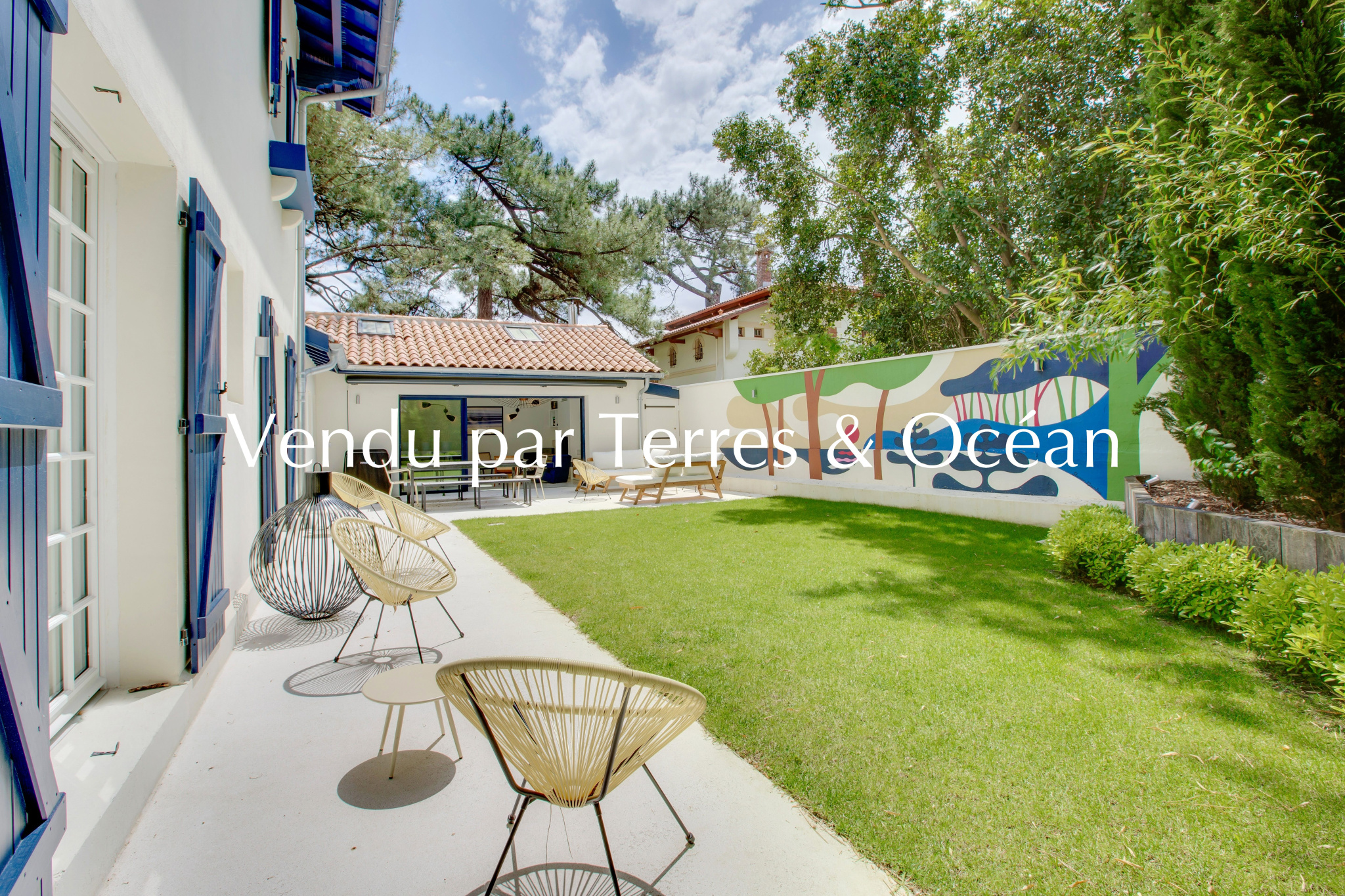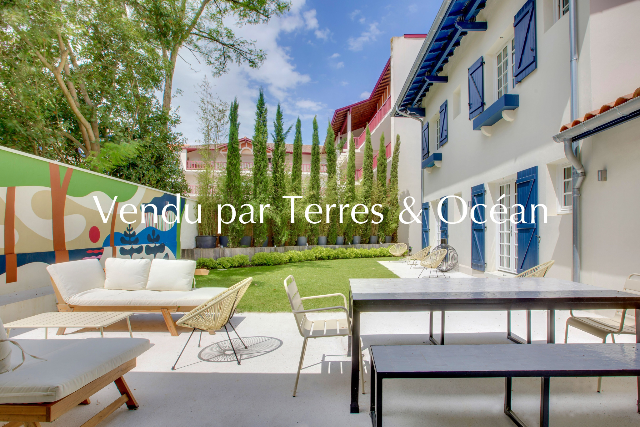 Vendu – À quelques pas du marché, des commerces et du lac, se dévoile une villa d’exception édifiée en 1937 par l’architecte Louis Lagrange, maître incontesté du style basco-landais. Inscrite au patrimoine local, cette demeure emblématique marie avec justesse l’authenticité de son architecture et le confort de prestations contemporaines, dans un cadre privilégié au coeur d’Hossegor. Entièrement rénovée en 2024 avec des matériaux et finitions haut de gamme, la villa, entièrement climatisée, développe environ 170 m2 de surface au sol, dont 150 m2 habitables, au sein d’un jardin paysager intime. Une déclaration préalable a d’ores et déjà été validée pour l’édification d’une piscine côté sud, si l’acquéreur le souhaite. Le rez-de-chaussée offre une vaste pièce de vie baignée de lumière, réunissant salon, salle à manger et cuisine équipée. Le sol en terrazzo, qui se prolonge vers la terrasse extérieure, crée une parfaite continuité entre intérieur et extérieur. Le mobilier et les banquettes sur-mesure viennent souligner l’élégance de l’ensemble. Trois chambres, chacune avec salle d’eau privative, complètent harmonieusement ce niveau. À l’étage, deux chambres supplémentaires s’accompagnent d’une salle d’eau et d’une salle de bains. Deux mezzanines ouvertes, conçues pour accueillir des couchages d’appoint de qualité, offrent une capacité d’accueil généreuse, sans compromis sur le confort. À l’extérieur, le jardin clos et aménagé, doté d’un forage et d’un système d’arrosage automatique, est sublimé par une fresque originale signée Steven Burke, conférant à la propriété une dimension artistique singulière. Alliance rare entre patrimoine architectural et modernité, finitions soignées et emplacement recherché : cette villa incarne une opportunité unique.