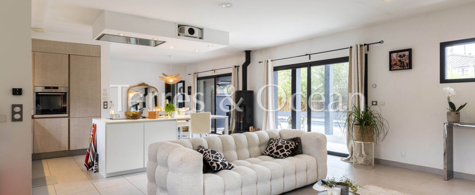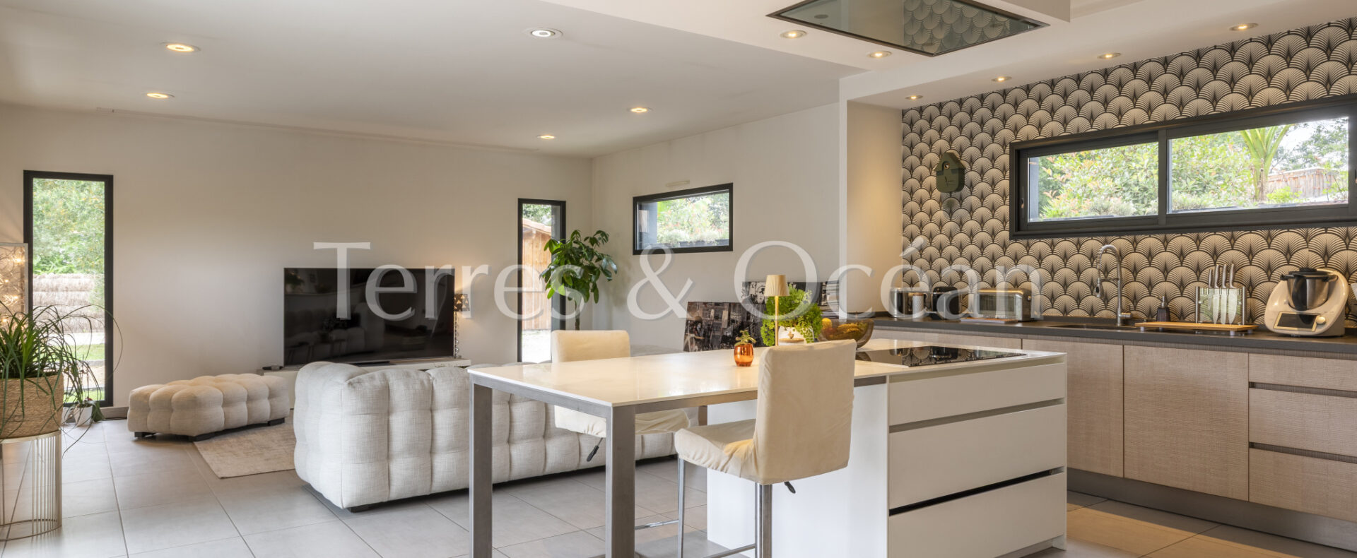 Nichée en fond d’impasse, maison lumineuse de prestige comprenant au rez-de-chaussée une grande pièce de vie, une chambre parentale, un cellier, un garage, des toilettes séparées.