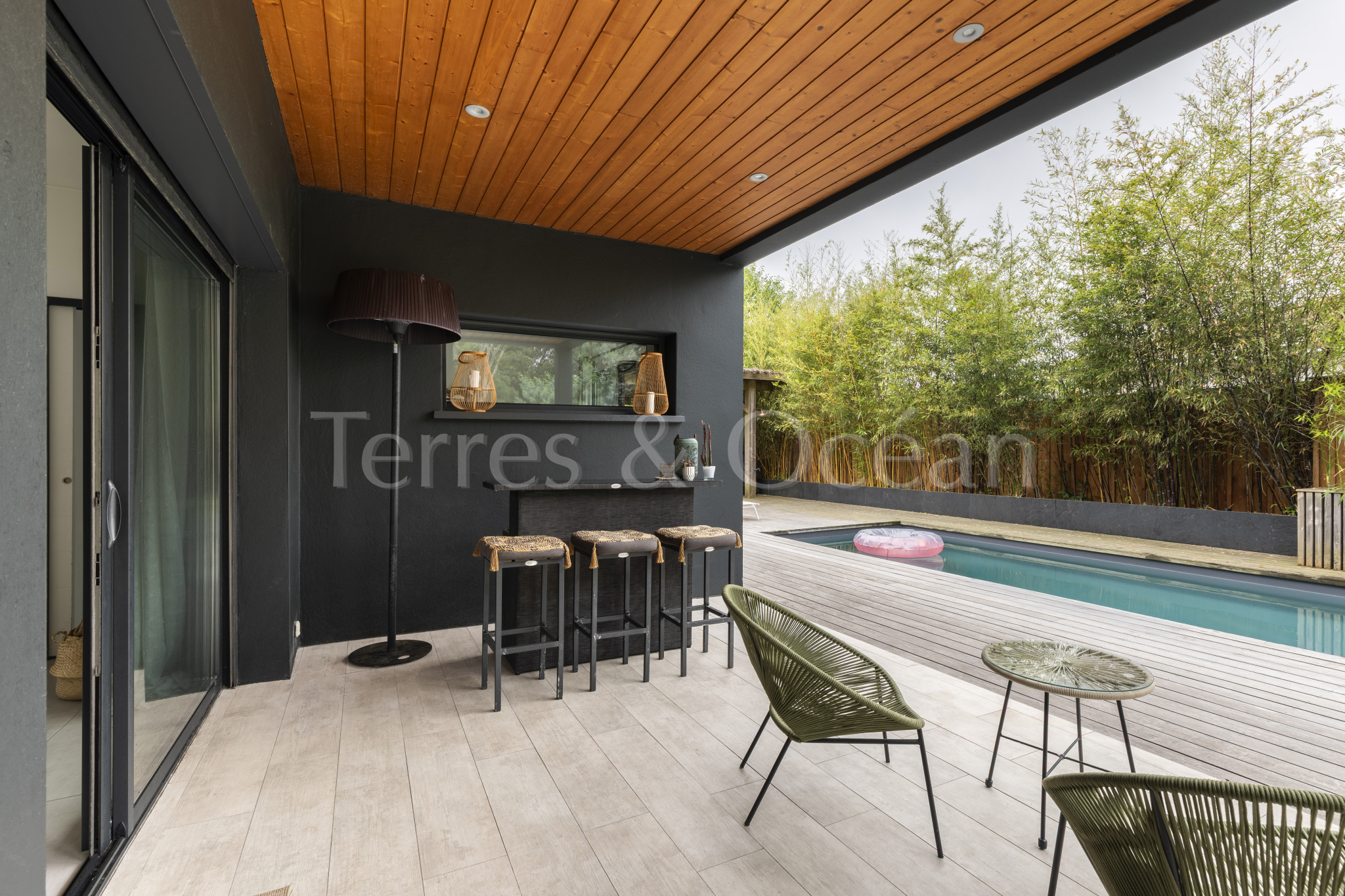 L’extérieur invite à la détente avec une piscine de 14m de long traitée au sel et chauffée, des terrasses couvertes, une bodega, un boulodrome, une dépendance et un atelier.