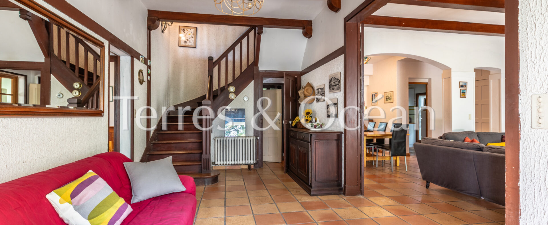 D’une superficie d’environ 200 m2, elle se dévoile par un imposant escalier menant à un spacieux porche d’entrée qui surplombe le jardin, signature de ce style Basco- Landais. Une vaste entrée distribue un espace de vie avec salon et sa cheminée, une salle à manger et une cuisine séparée,