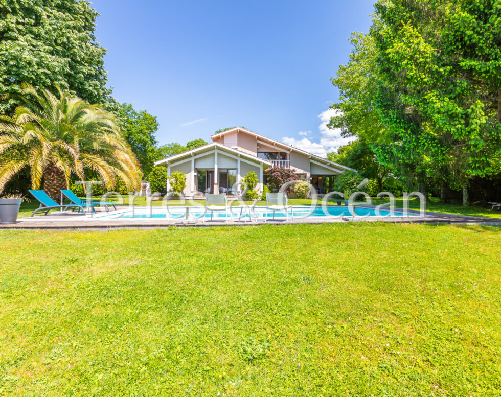 Dans l’un des emplacements les plus convoités d’Hossegor, cette grande Landaise incarne le charme de l’architecture locale et l’harmonie entre confort, calme et nature. Elle bénéficie d’un cadre préservé à proximité du centre-ville et du lac marin, offrant ainsi un équilibre idéal entre intimité et accessibilité. D’une superficie généreuse de plus de 200 m2 répartis sur deux niveaux, la maison propose cinq chambres, dont deux de plain-pied, ainsi qu’une pièce de vie traversante, lumineuse et subtilement agencée pour accueillir, partager et profiter des extérieurs. Elle dispose d’une cuisine généreuse avec un accès direct sur la terrasse coté piscine, de deux salles de bain et d’une salle de douche ainsi que de trois WC. La villa bénéficie également d’un studio avec une entrée autonome, ainsi d’un grand sous-sol avec double garage, cellier, cave, buanderie. Un carport, un pool house avec WC et un cabanon complètent la propriété. La parcelle d’environ 3000m2 s’ouvre sur une forêt de pins majestueux. Les deux terrasses et la piscine bercée de soleil ne souffrent d’aucun vis à vis. Rares sont les propriétés qui réunissent autant de qualités : l’environnement, le charme, la calme, l’exposition et le confort. Une opportunité singulière. Bon rendement locatif. Renseignements techniques : Les informations sur les risques auxquels ce bien est exposé sont disponibles sur le site Géorisques :www.georisques.gouv.fr. Proposé par l’agence TERRES & OCEAN Immobilier Hossegor réf mandat 1668 – Mme Carla VINTROU tel : 0622022060, Agent commercial RSAC 902680404 et Mme Mathilde VINTROU tel : 0781864019 Agent commercial RSAC 918907767