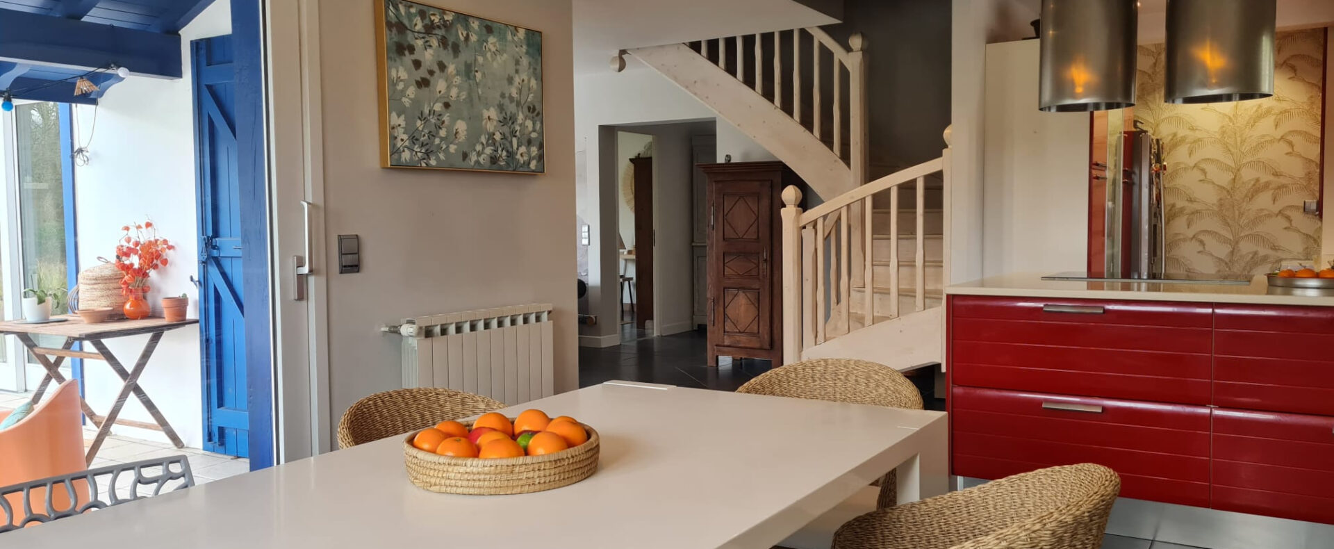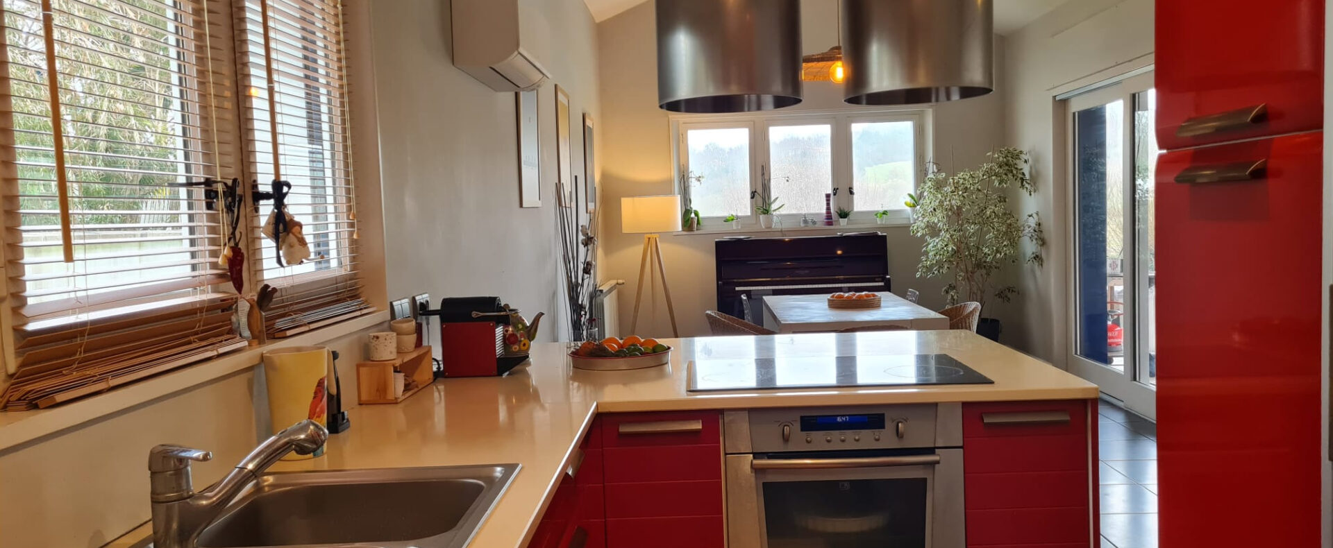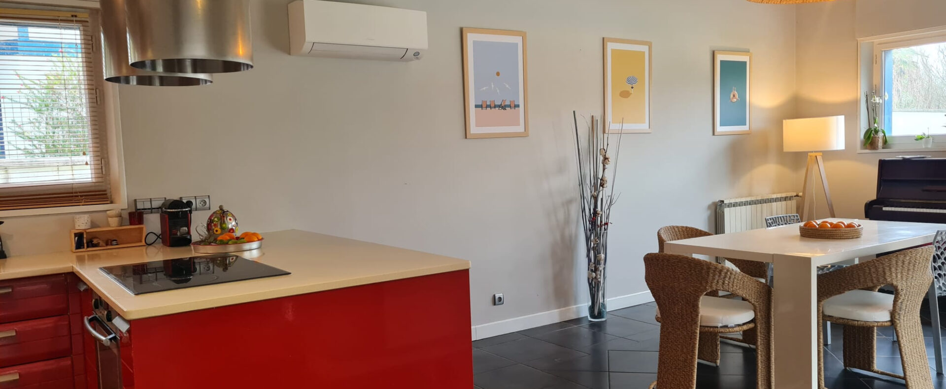 Elle se compose d’une entrée, espace de vie de 60 m2 environ avec salon, salle à manger, cuisine ouverte, quatre chambres dont une de plain pied, salle de bains et salle d’eau.