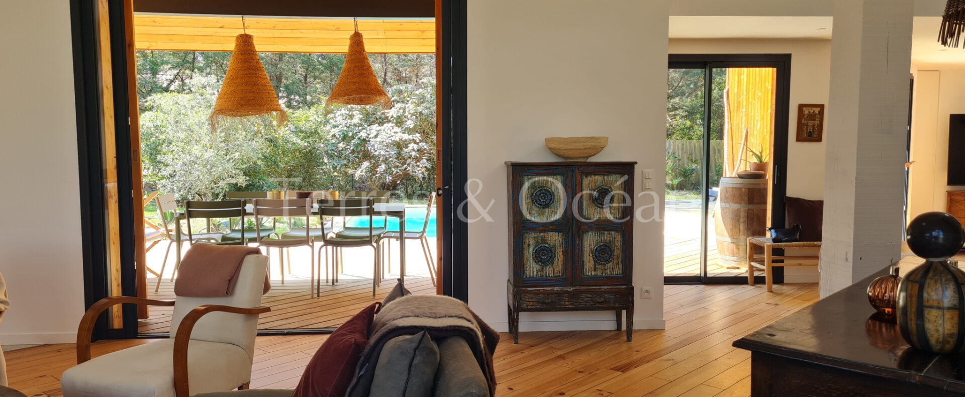 Entièrement rénovée en 2022, elle dispose d’un séjour traversant ouvert sur la terrase et l’espace piscine, cuisine ouverte, suite parentale complète et quatre chambres.