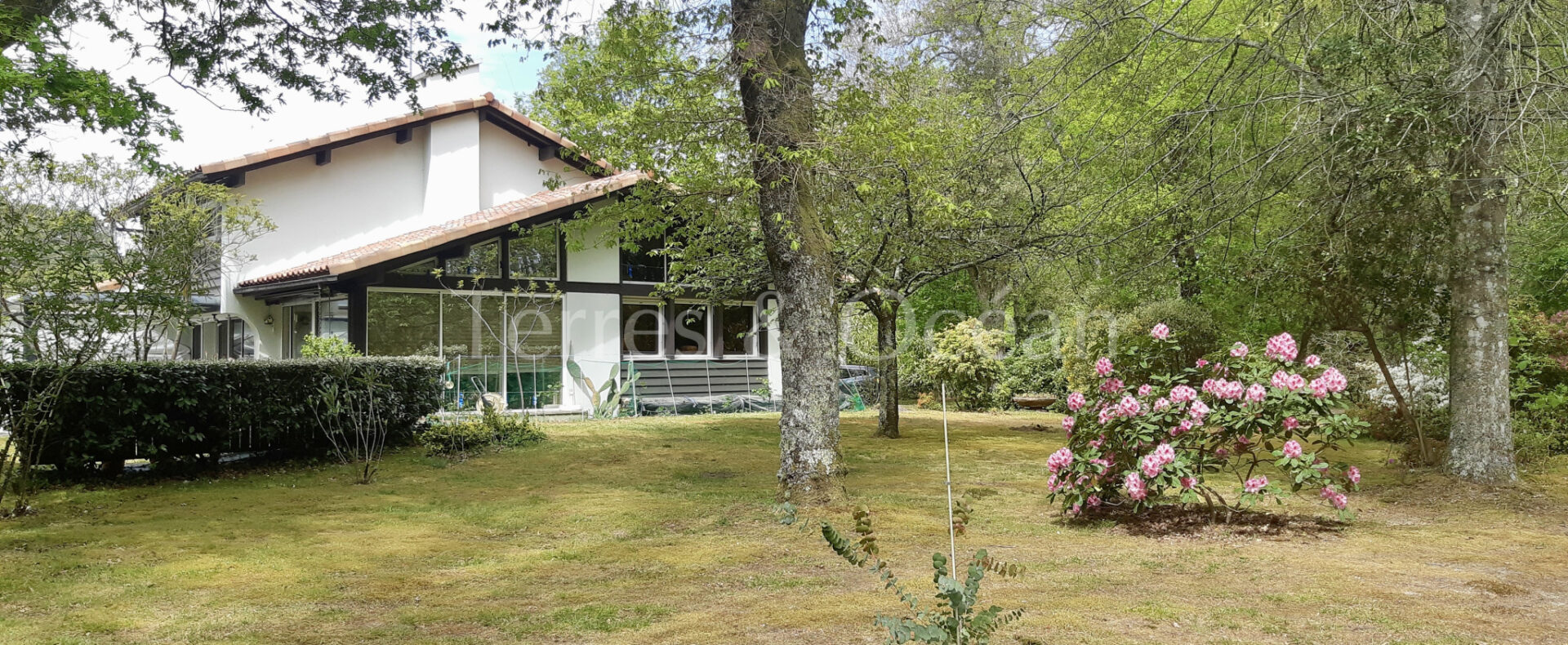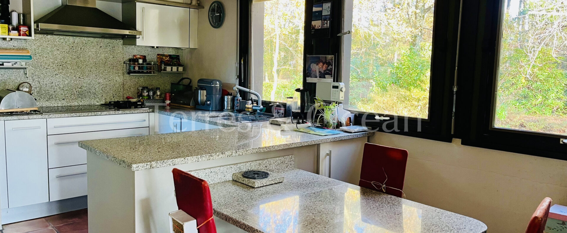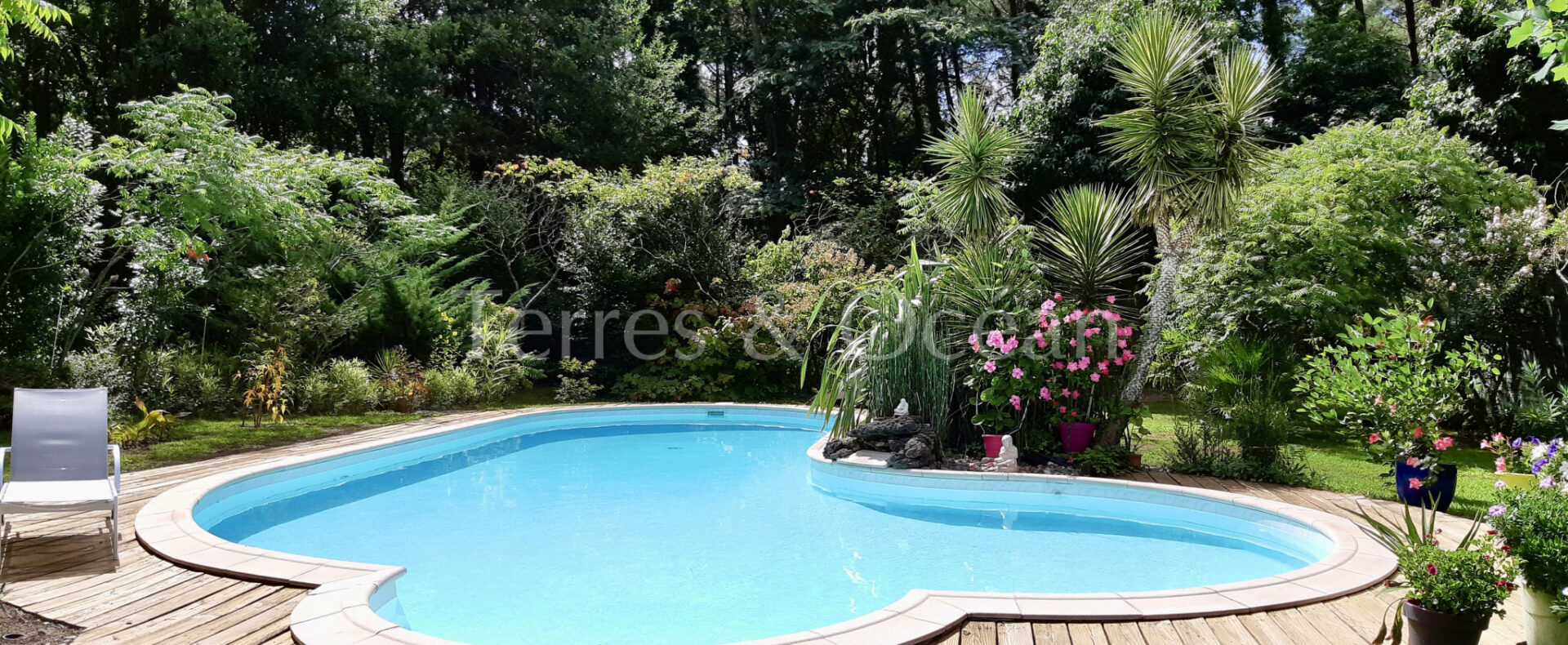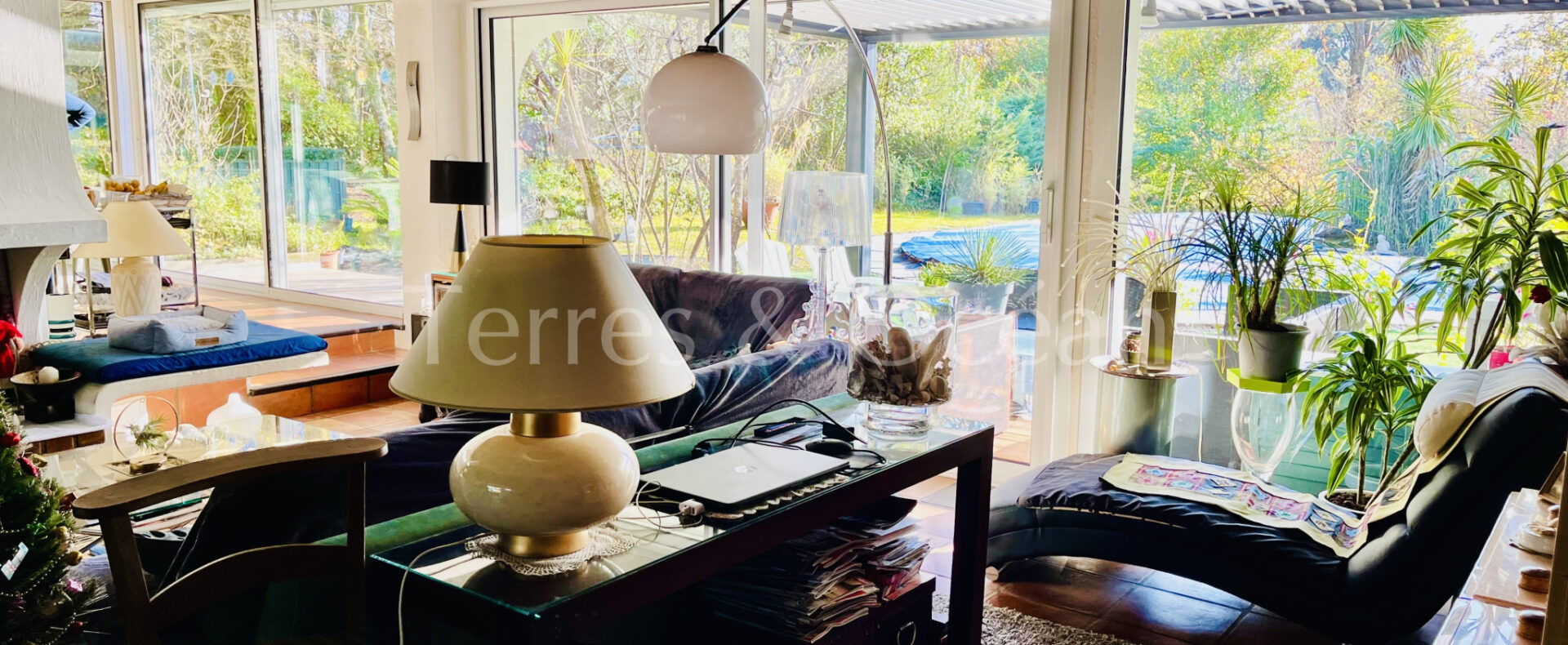Rare à la vente ! Située dans un cadre privilégié en pleine nature, à l’entrée de Soustons, cette magnifique maison d’architecte conçue par François Gassan s’étend sur environ 180 m2 habitables et est entourée d’un parc arboré de plus de 5000 m2. Un véritable havre de paix, à proximité de la ville tout en étant en pleine nature. Elle se compose d’un grand séjour lumineux avec cheminée, ouvert sur une véranda qui laisse entrer la lumière de part et d’autre de la pièce de vie. La salle à manger, adjacente, communique avec une cuisine fermée, le double cellier et l’accès direct au garage rend l’ensemble pratique au quotidien. Au même niveau, de plain-pied, la maison dispose d’une chambre parentale avec dressing et salle de bains avec douche, offrant une vue sur la piscine. À l’étage, vous trouverez trois belles chambres, une salle de douche, un bureau et des toilettes séparées. Les pièces de vie du rez-de-chaussée s’ouvrent sur une terrasse exposée plein sud avec pergola bioclimatique, idéale pour profiter des journées ensoleillées, ainsi qu’une piscine de 11 x 7 mètres, entourés d’essences fleuries. Cette maison est équipée de nombreux dispositifs pour allier confort et économie : climatisation réversible, panneaux solaires et photovoltaïques, arrosage automatique, prise pour voiture électrique et bien plus encore. Côté rangement, vous ne manquerez pas d’espace : trois cabanons, un grand garage et de nombreux espaces de stockage tant à l’intérieur qu’à l’extérieur de la maison. Que ce soit pour une résidence principale ou secondaire, cette propriété unique saura vous charmer par son architecture, ses équipements modernes et son environnement exceptionnel. DPE en cours. Renseignements techniques : Les informations sur les risques auxquels ce bien est exposé sont disponibles sur le site Géorisques :www.georisques.gouv.fr. Proposé à la vente par l’agence TERRES & OCEAN immobilier prix frais d’agence de 5% inclus : 990000€ soit 943000€ net vendeur. Agent commercial : Mathilde Vintrou (RSAC 918 907 767 Toulouse) tel: 07.81.86.40.19