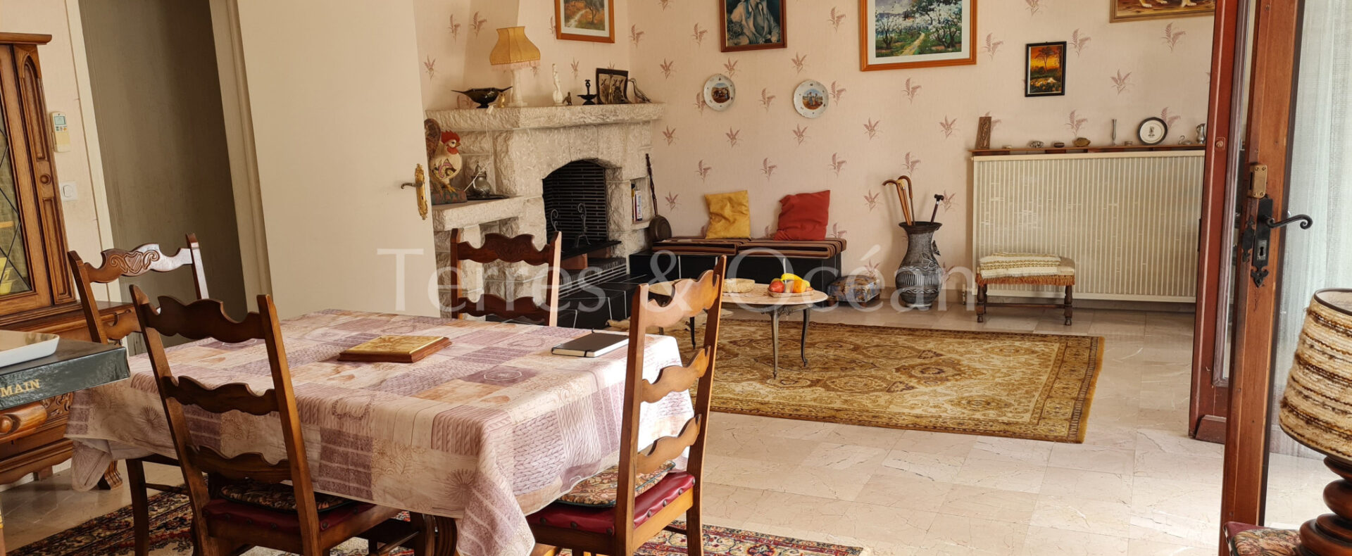 Entièrement distribuée de plain pied, elle se compose d’un séjour avec cheminée, cuisine séparée, quatre chambres, chacune avec rangements, salle d’eau ou cabinet de toilette, un garage et une annexe.
