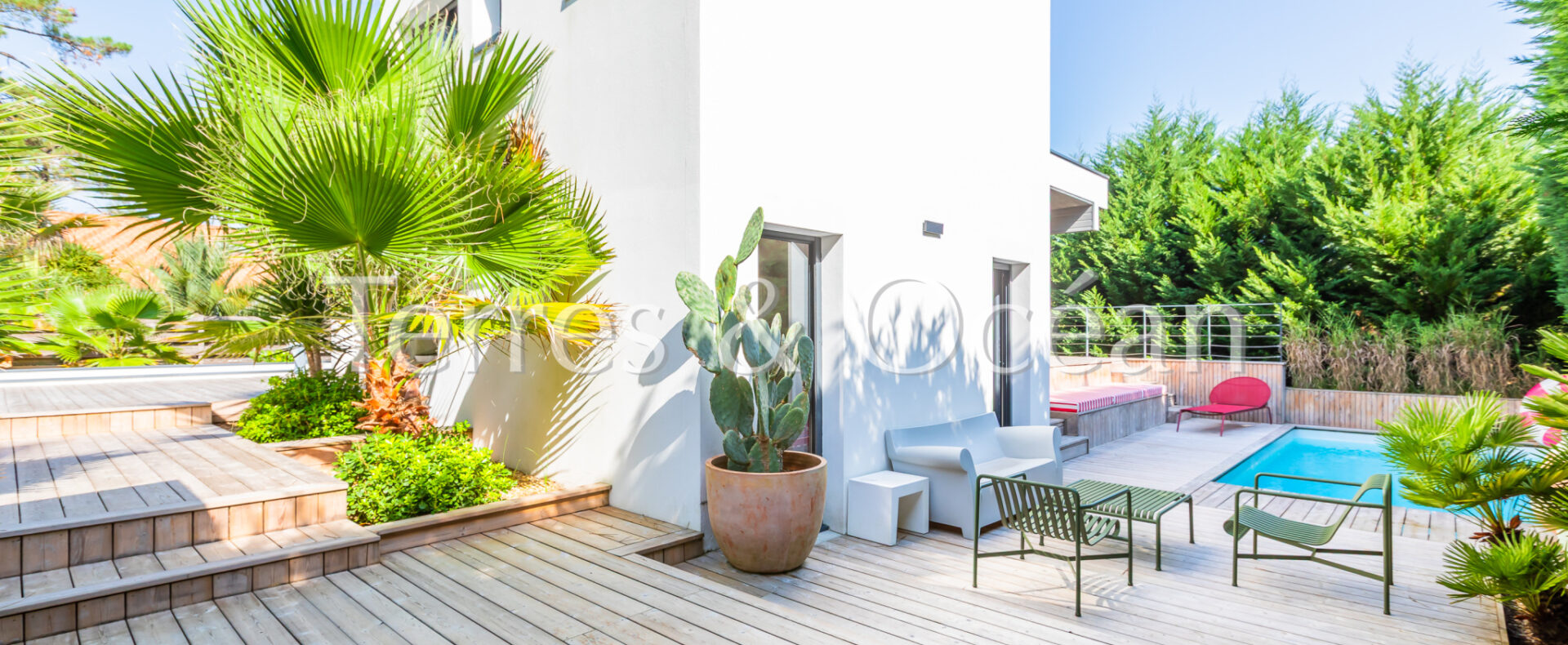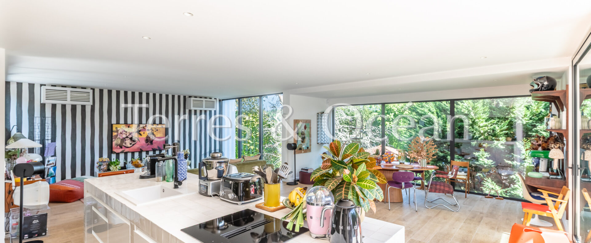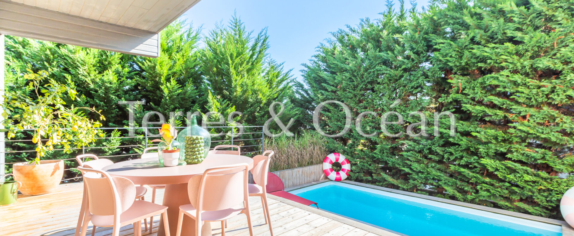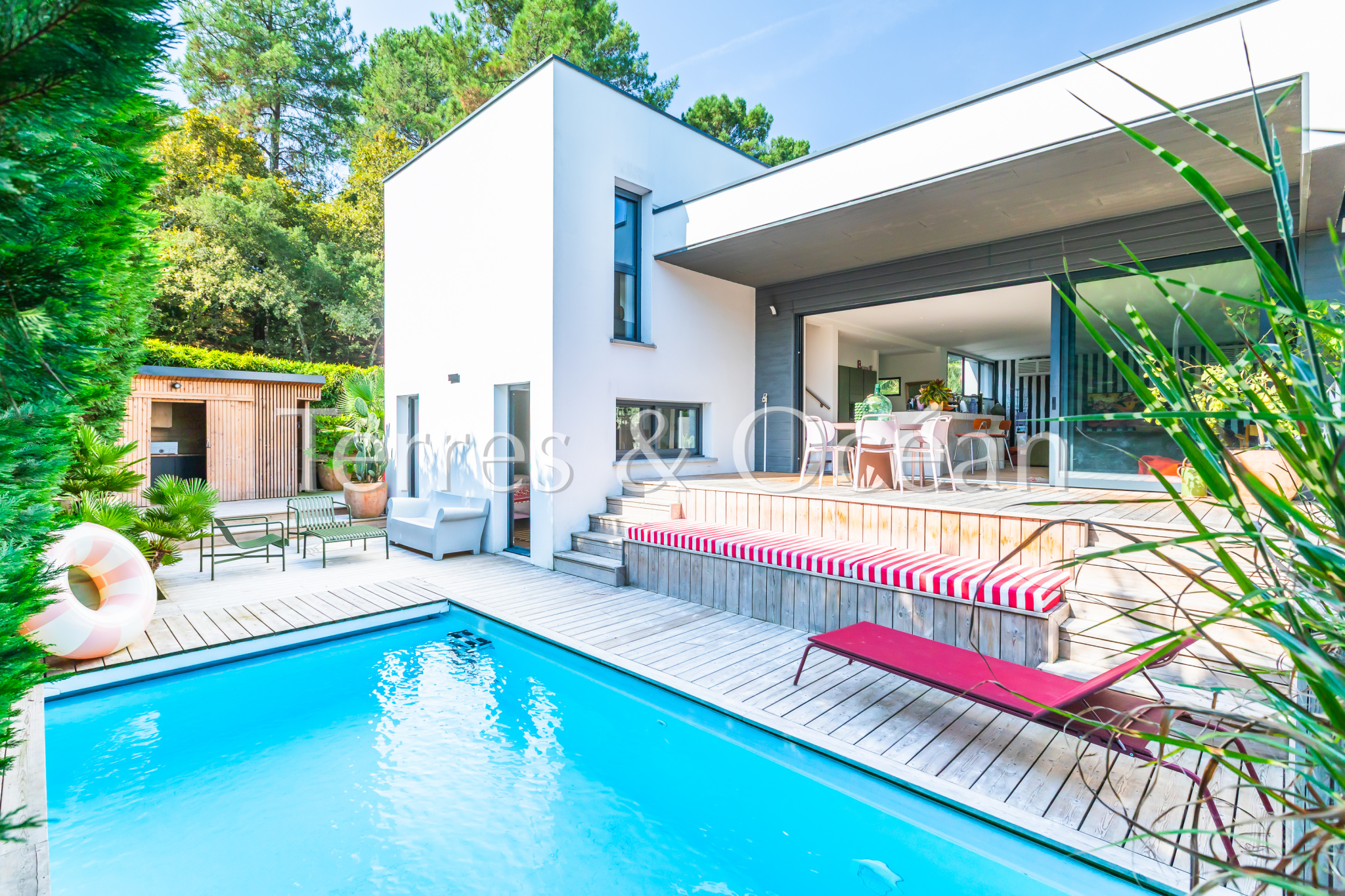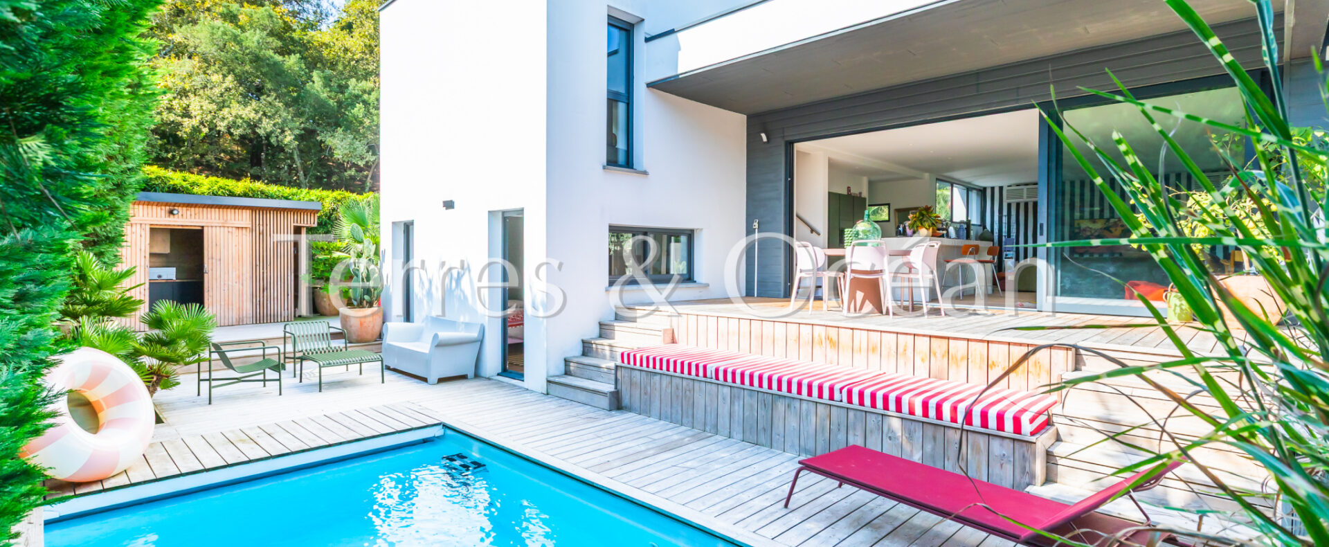 Située au coeur de Seignosse, à proximité à pied de l’ensemble des commodités (pharmacie, boulangerie, écoles, etc), cette maison d’architecte construite en 2006 est unique en son genre. Son architecture, ses volumes, et ses nombreuses ouvertures sur l’extérieur vous séduiront. Celle-ci est composée d’une vaste pièce de vie de près de 70 m2 avec une cuisine américaine entièrement aménagée, 4 chambres (2 chambres parentales équipées de salle d’eau et 2 chambres standard), une salle de bain, une buanderie et 3 wc. Depuis le séjour et l’une des chambres, vous accédez à une très belle terrasse couverte avec piscine intégrée et une cuisine extérieure. Un garage vient compléter ce bien. Renseignements techniques : Les informations sur les risques auxquels ce bien est exposé sont disponibles sur le site Géorisques :www.georisques.gouv.fr. DPE C 145 et B 7 .Estimation du coût annuel d’énergie du logement entre 837€ et 1468€/an. Date de référence des prix de l’énergie utilisés pour établir cette estimation : 2021. Proposé à la vente par l’agence TERRES & OCEAN immobilier prix frais d’agence de 5% inclus : 1150000 € soit 1095238€ net vendeur, mandat : 1707 – Par Mme Carla VINTROU tel : 06.22.02.20.60, Agent commercial RSAC 902680404 et Mme Mathilde Vintrou tel : 07.81.86.40.19 Agent commercial RSAC 918907767