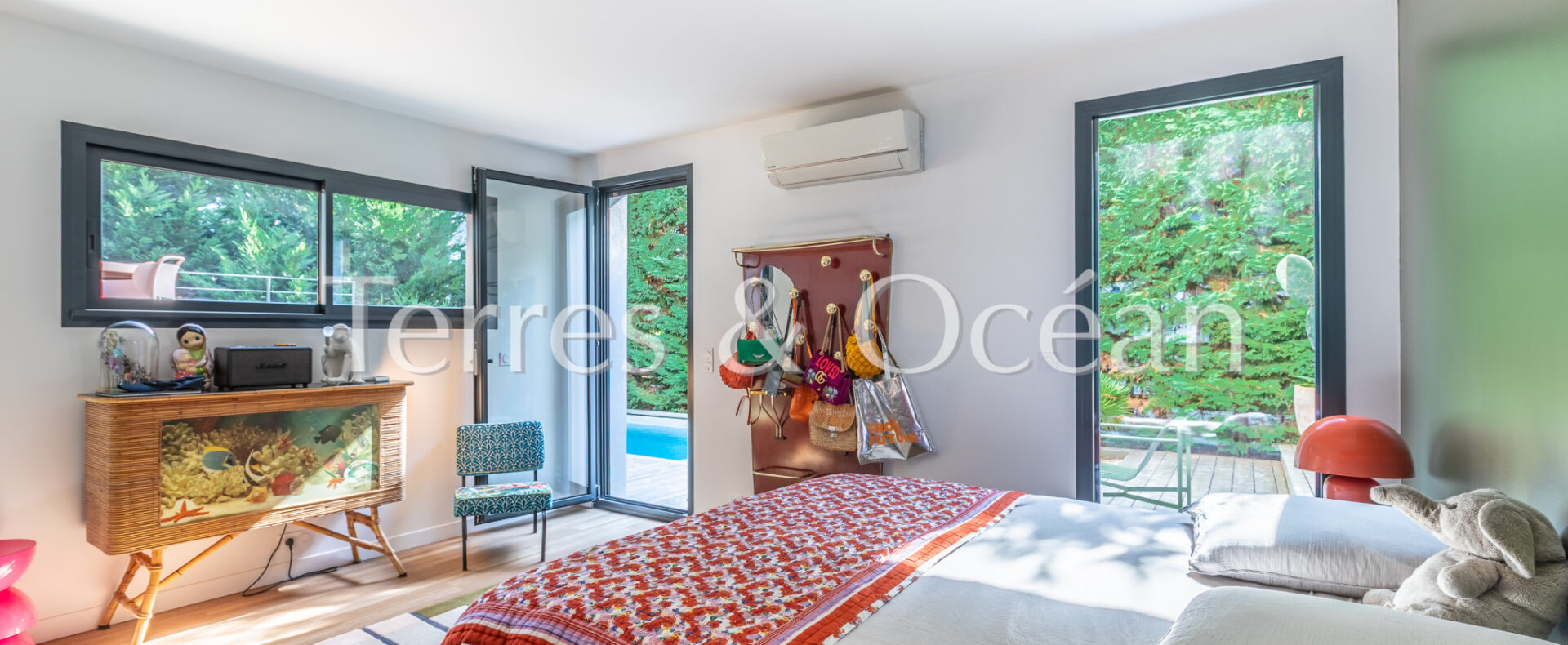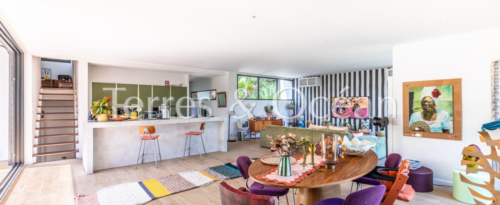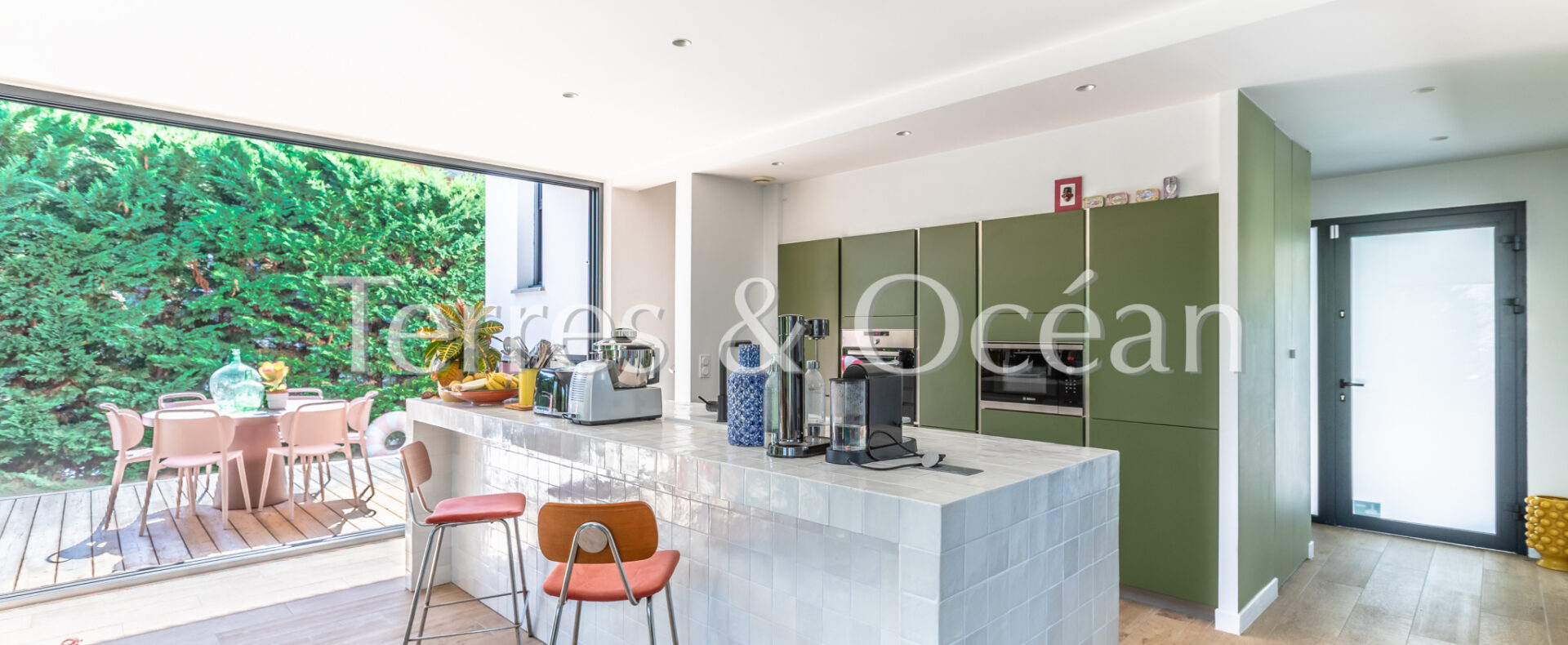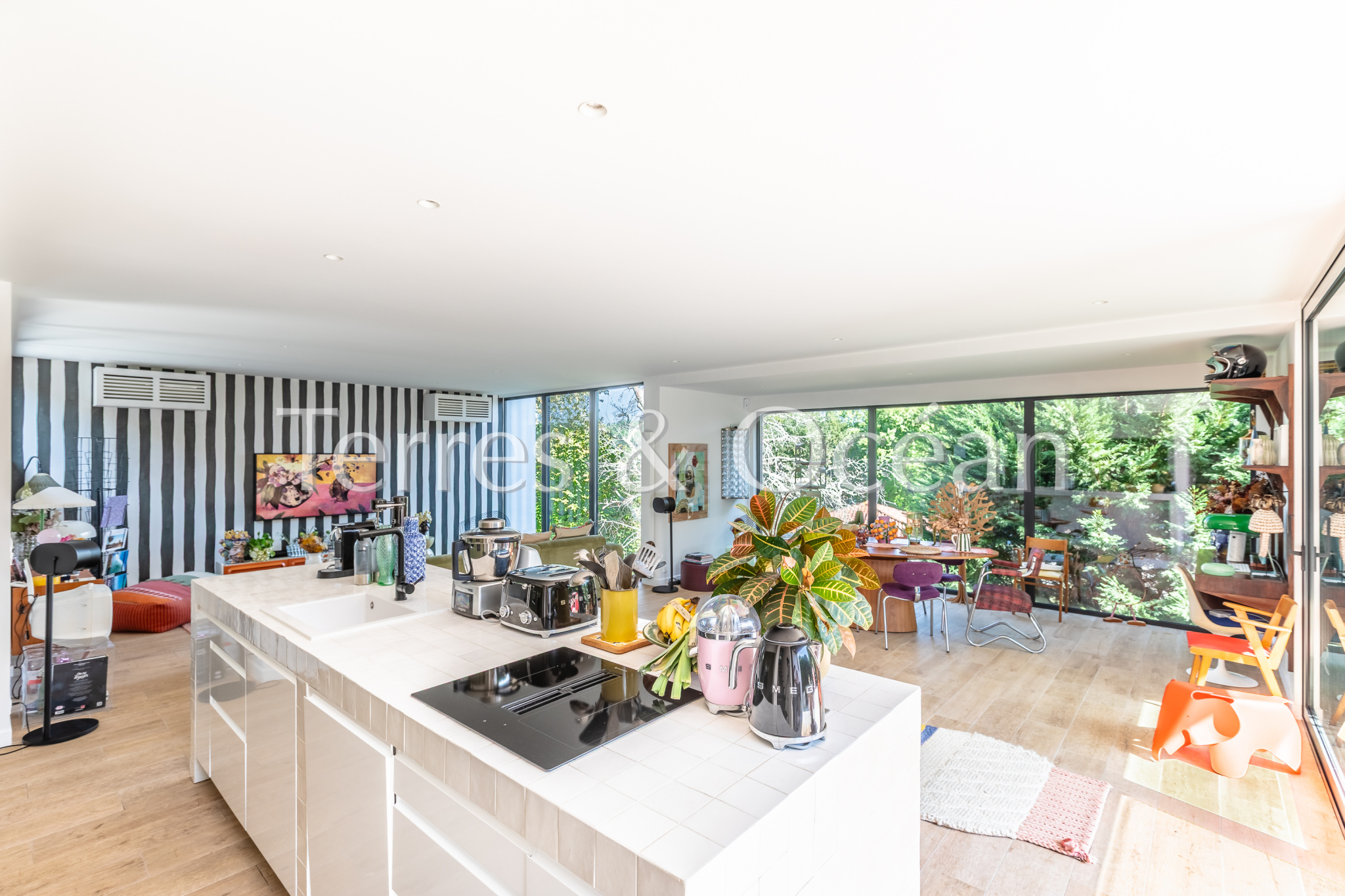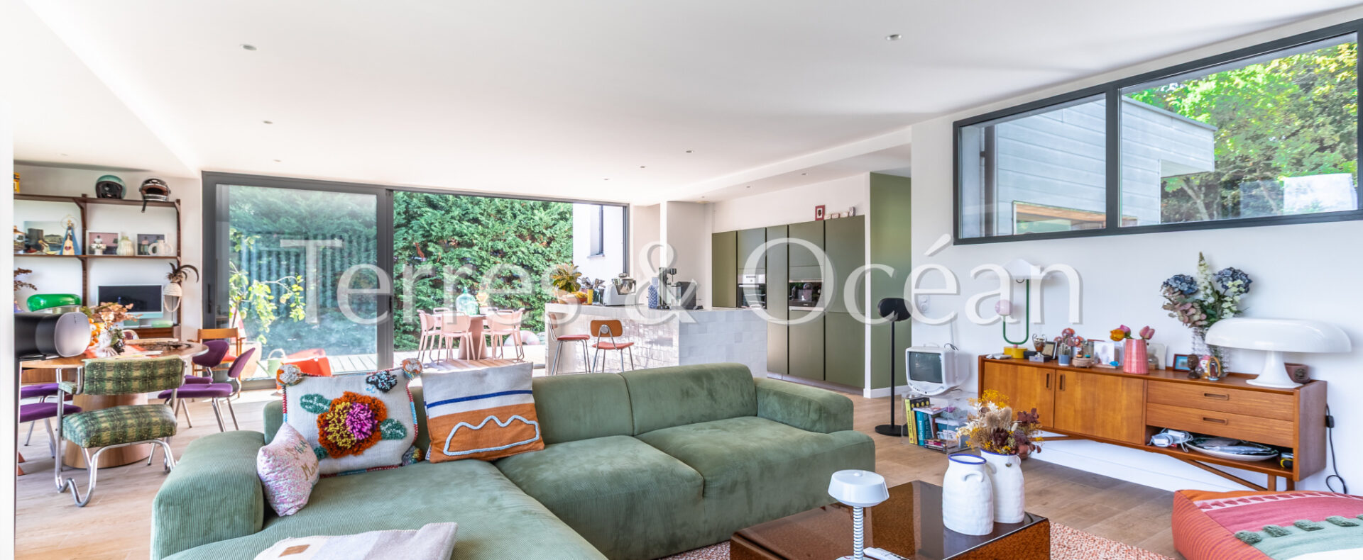 Située au coeur de Seignosse, à proximité à pied de l’ensemble des commodités (pharmacie, boulangerie, écoles, etc), cette maison d’architecte construite en 2006 est unique en son genre. Son architecture, ses volumes, et ses nombreuses ouvertures sur l’extérieur vous séduiront. Celle-ci est composée d’une vaste pièce de vie de près de 70 m2 avec une cuisine américaine entièrement aménagée, 4 chambres (2 chambres parentales équipées de salle d’eau et 2 chambres standard), une salle de bain, une buanderie et 3 wc. Depuis le séjour et l’une des chambres, vous accédez à une très belle terrasse couverte avec piscine intégrée et une cuisine extérieure. Un garage vient compléter ce bien. Renseignements techniques : Les informations sur les risques auxquels ce bien est exposé sont disponibles sur le site Géorisques :www.georisques.gouv.fr. DPE C 145 et B 7 .Estimation du coût annuel d’énergie du logement entre 837€ et 1468€/an. Date de référence des prix de l’énergie utilisés pour établir cette estimation : 2021. Proposé à la vente par l’agence TERRES & OCEAN immobilier prix frais d’agence de 5% inclus : 1150000 € soit 1095238€ net vendeur, mandat : 1707 – Par Mme Carla VINTROU tel : 06.22.02.20.60, Agent commercial RSAC 902680404 et Mme Mathilde Vintrou tel : 07.81.86.40.19 Agent commercial RSAC 918907767