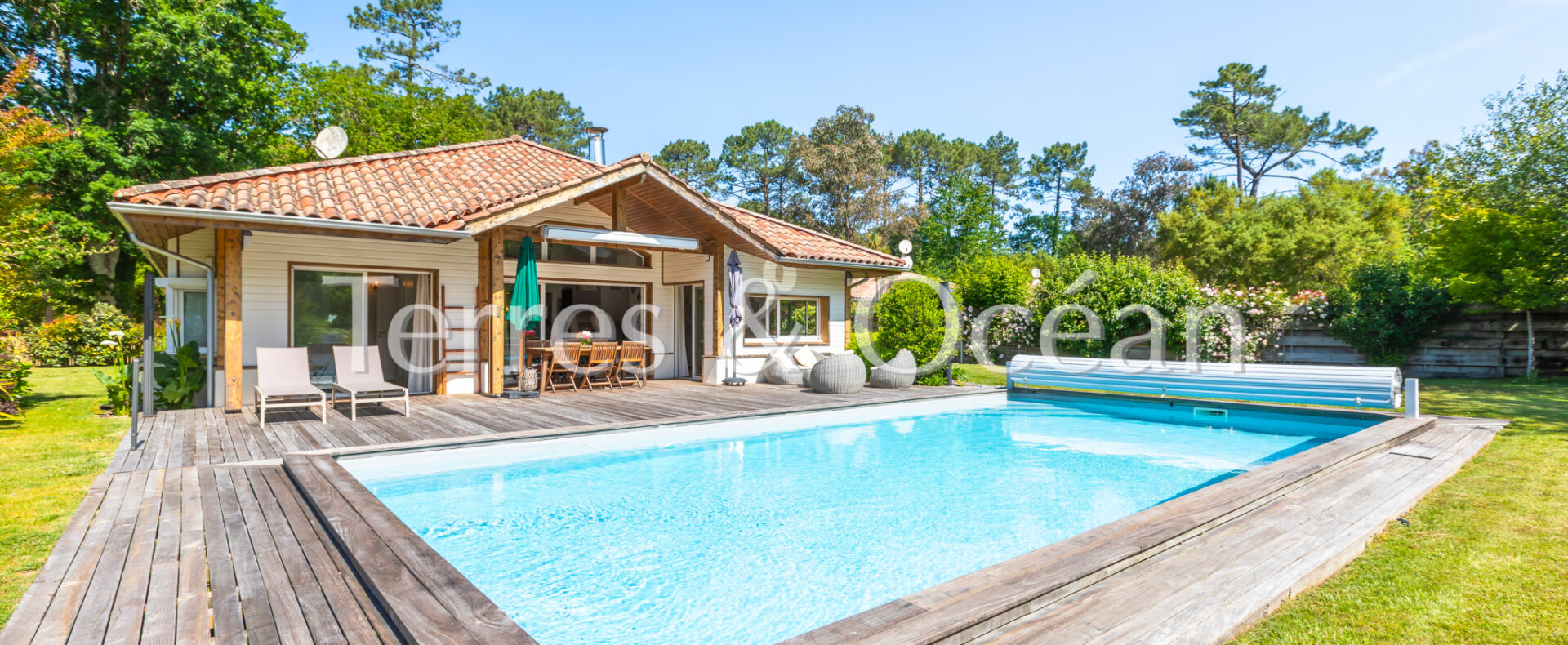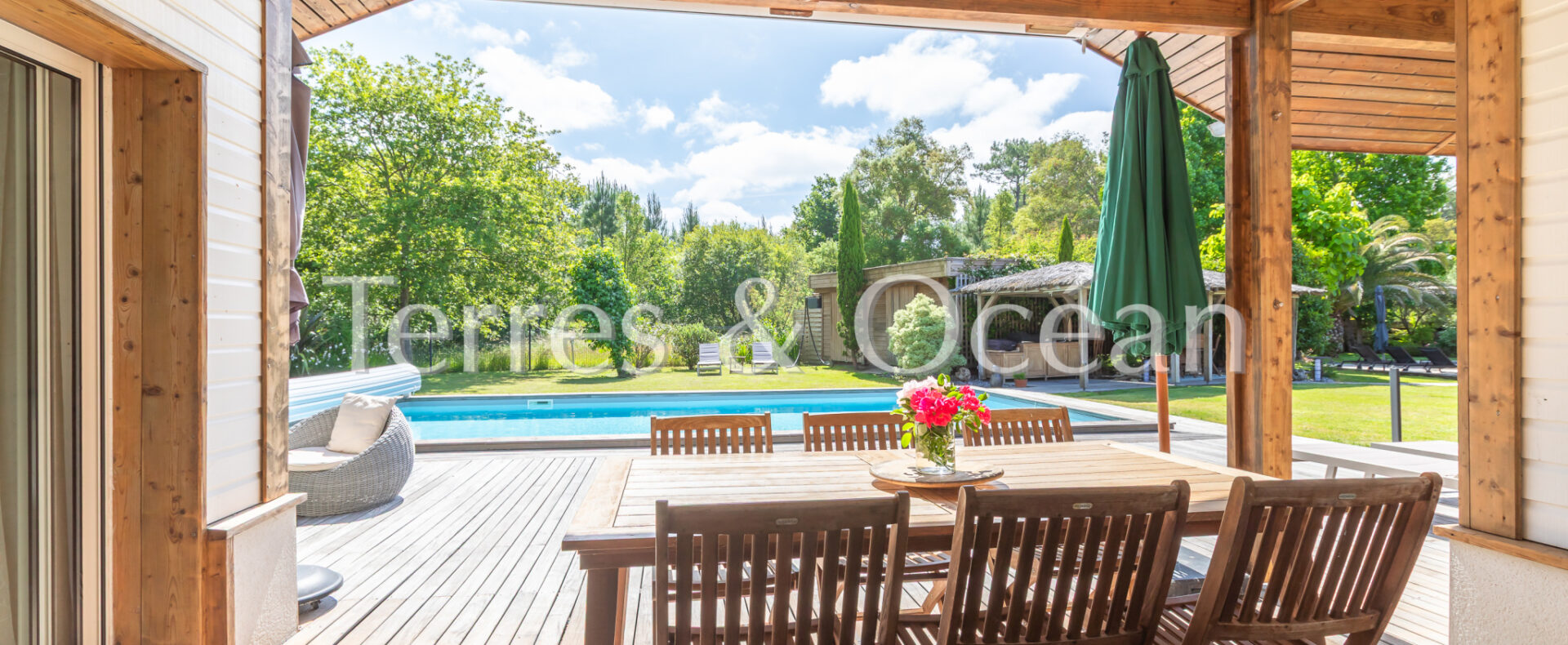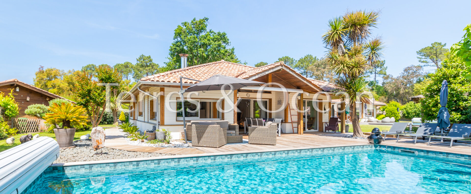 La seconde maison de 130m2 de plain-pied, comprend un séjour avec cheminée, deux suites parentales, deux autres chambres et une magnifique piscine, une terrasse et une cuisine d’été qui font face à une zone naturelle et la forêt landaise.