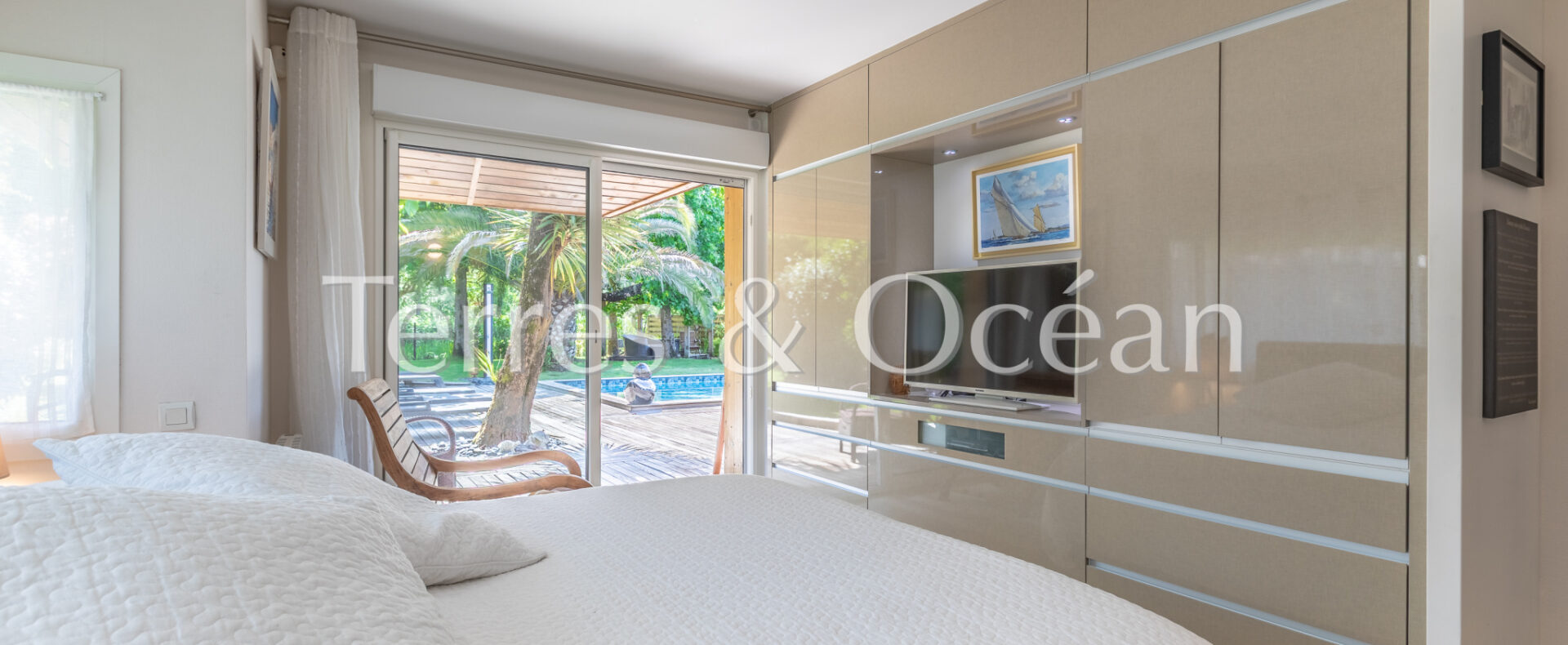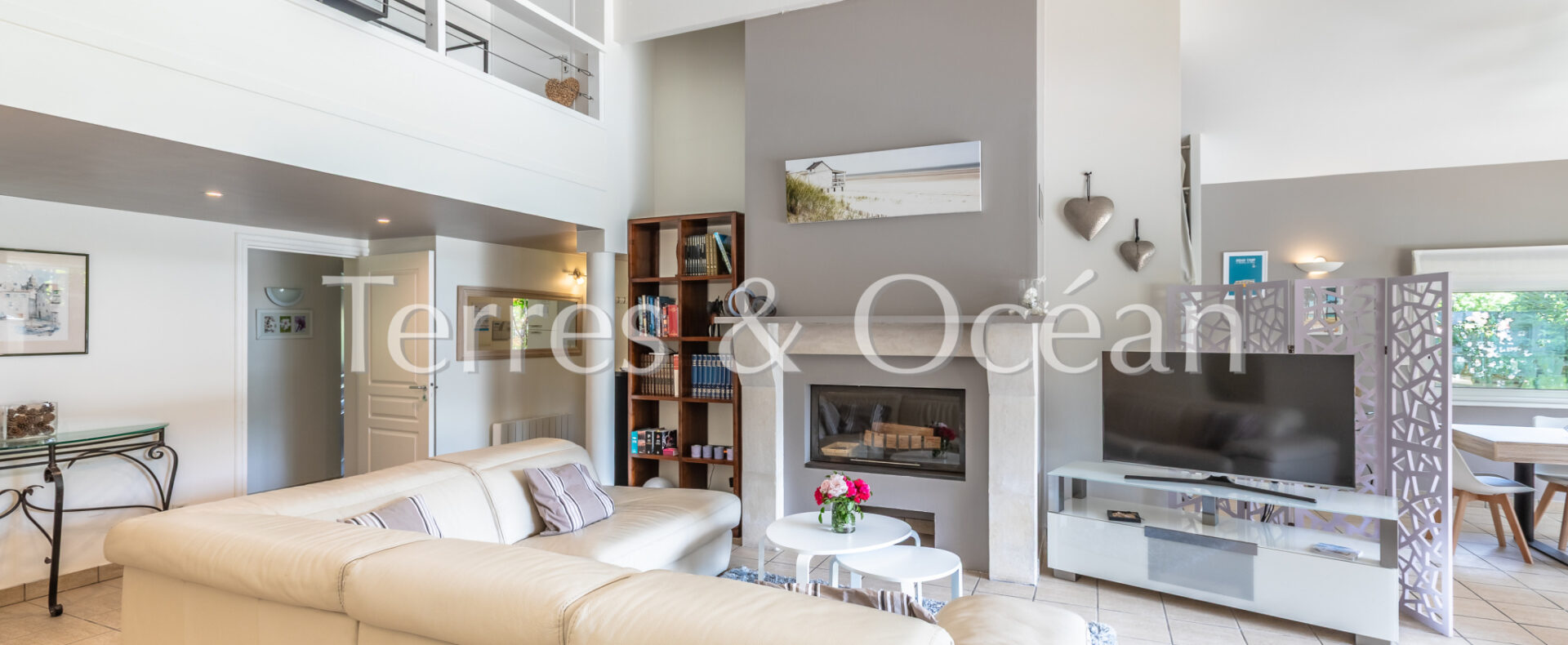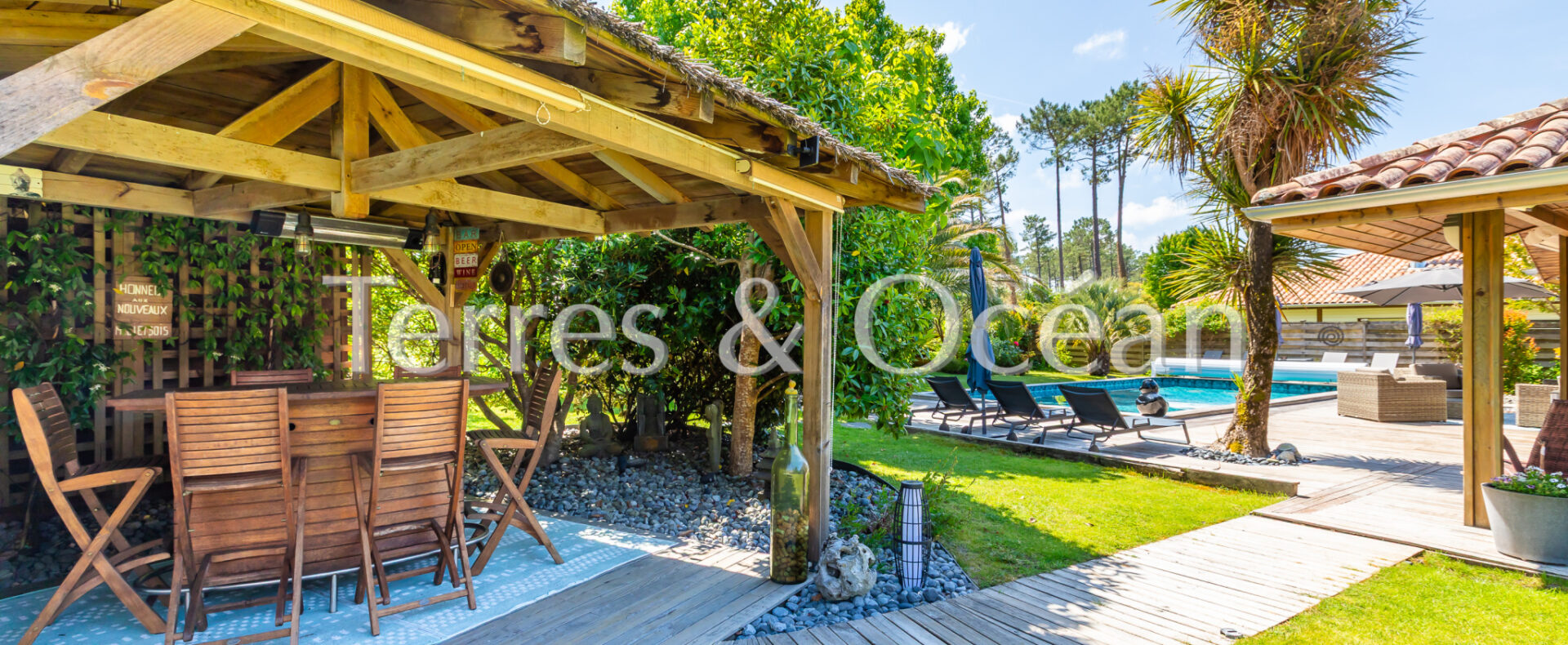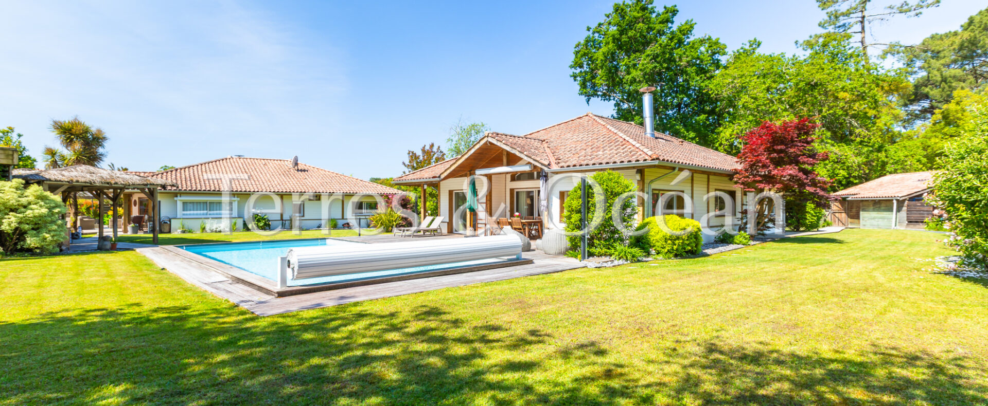 La seconde maison de 130m2 de plain-pied, comprend un séjour avec cheminée, deux suites parentales, deux autres chambres et une magnifique piscine, une terrasse et une cuisine d’été qui font face à une zone naturelle et la forêt landaise.