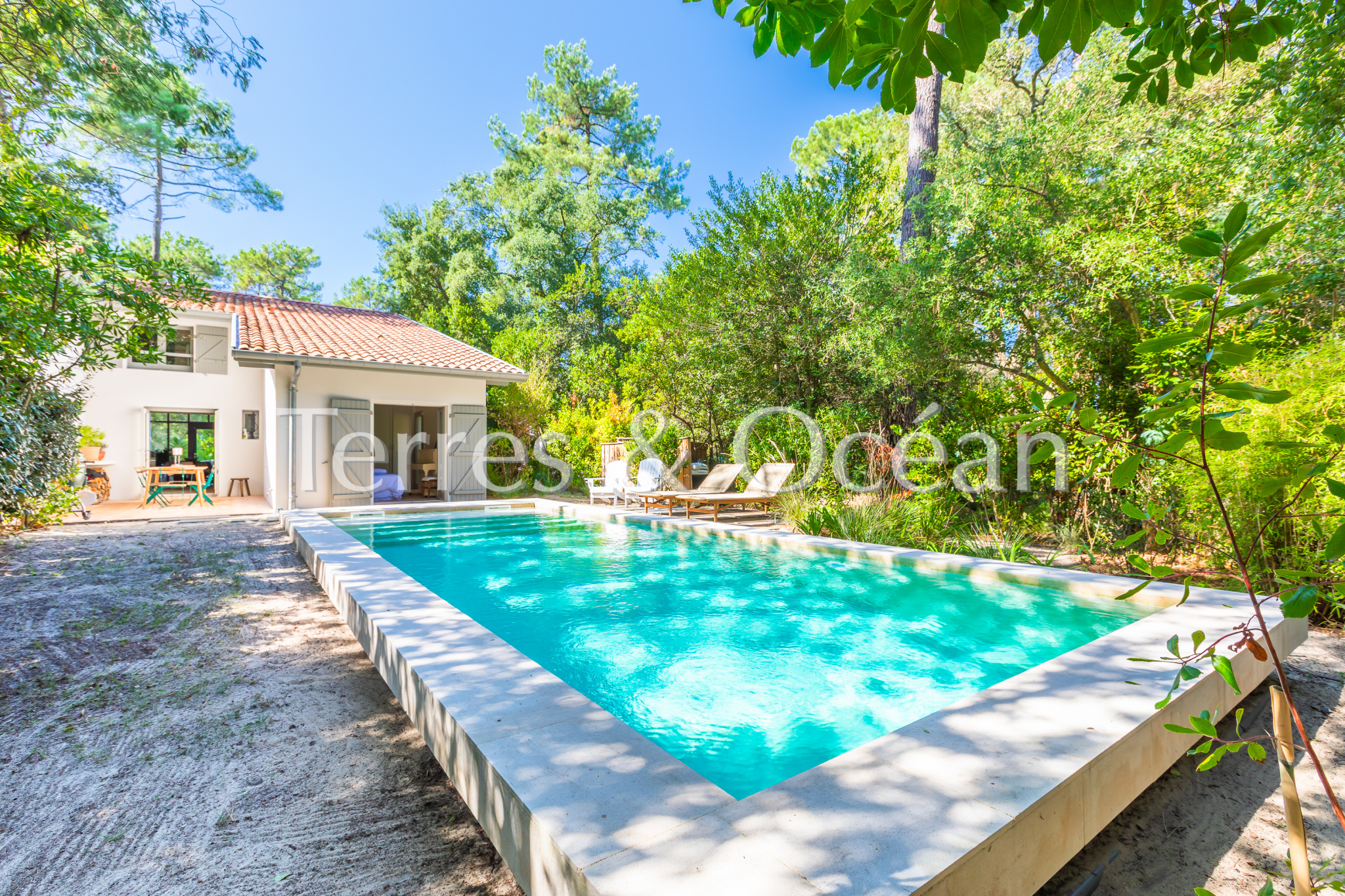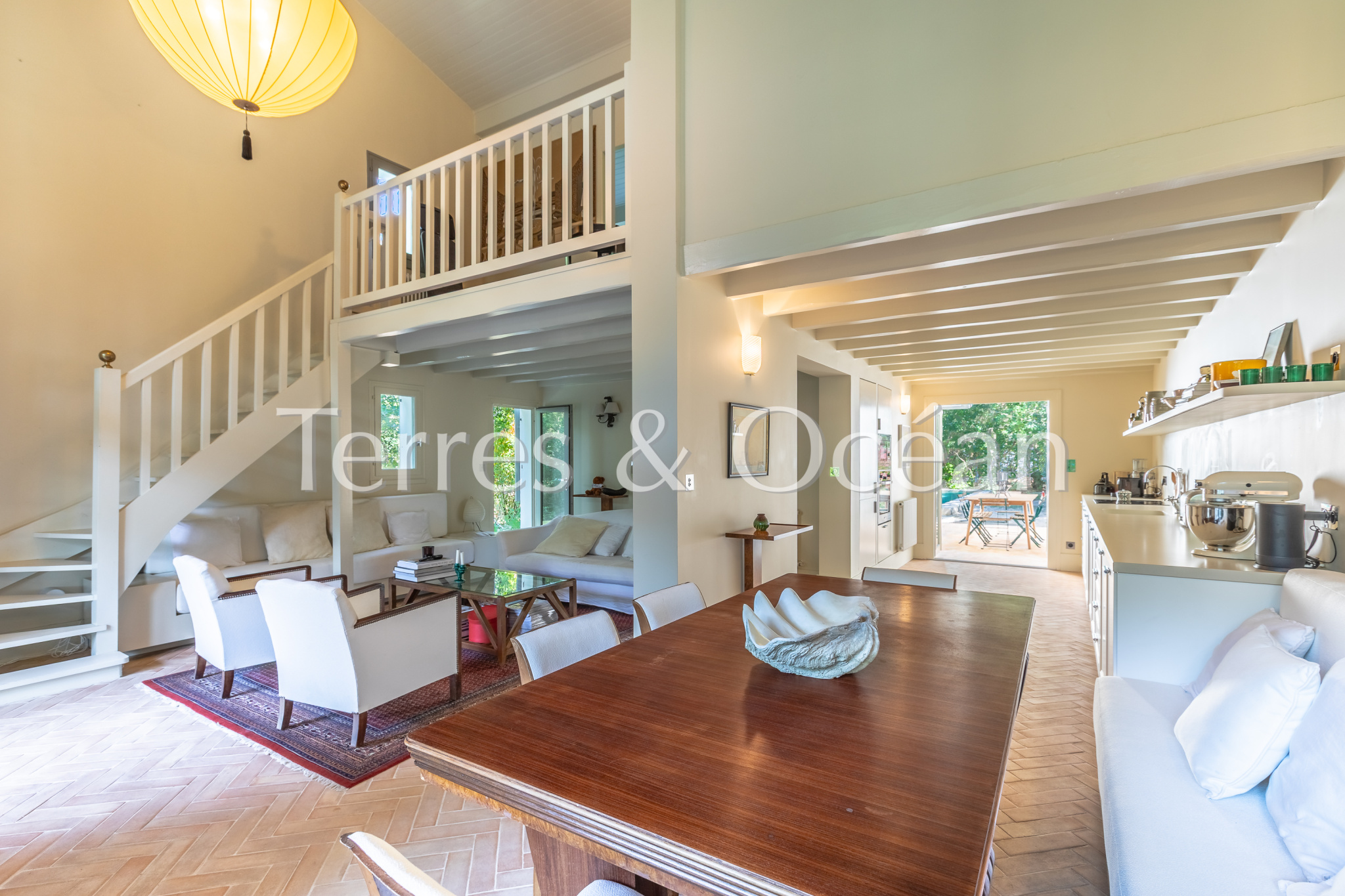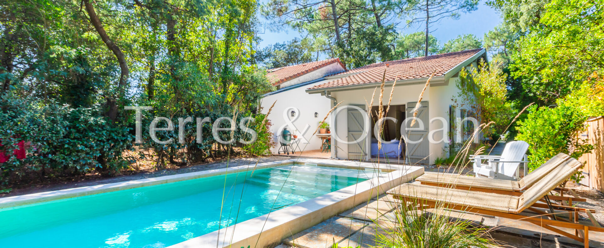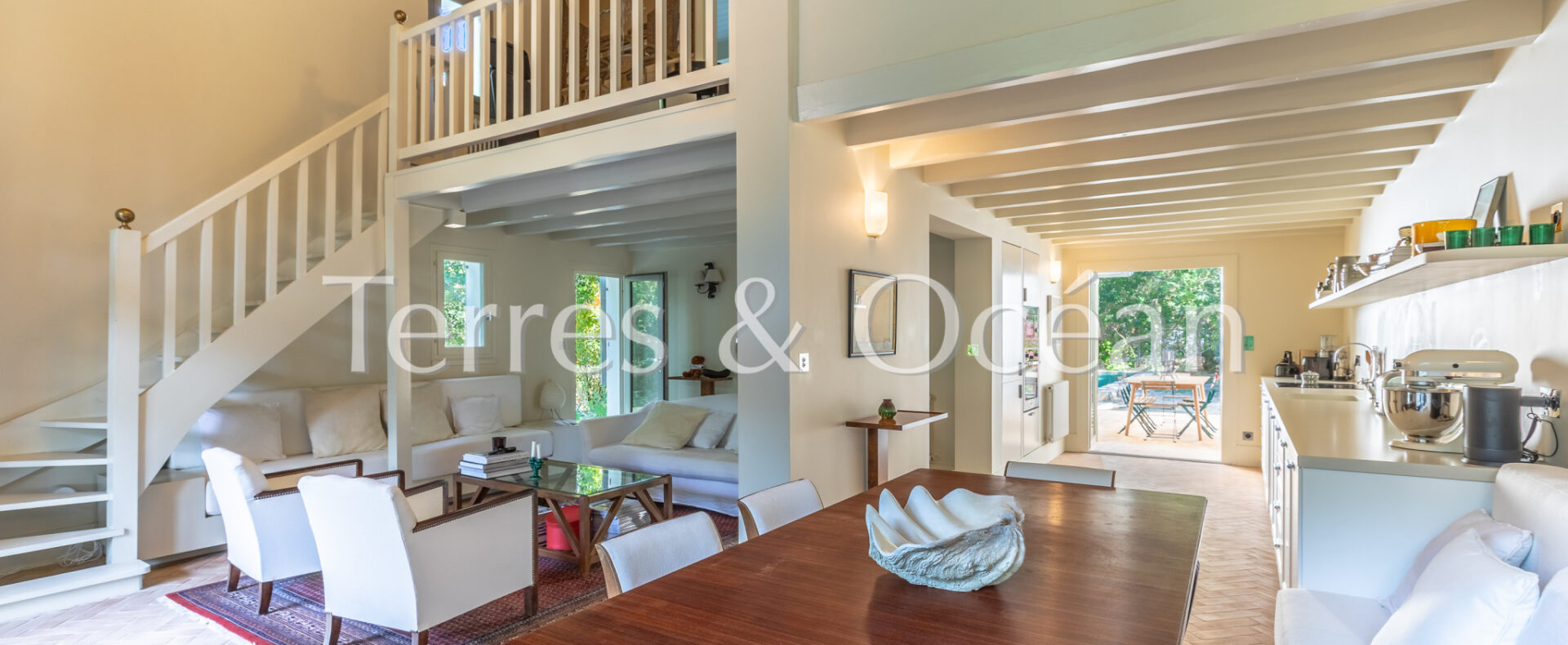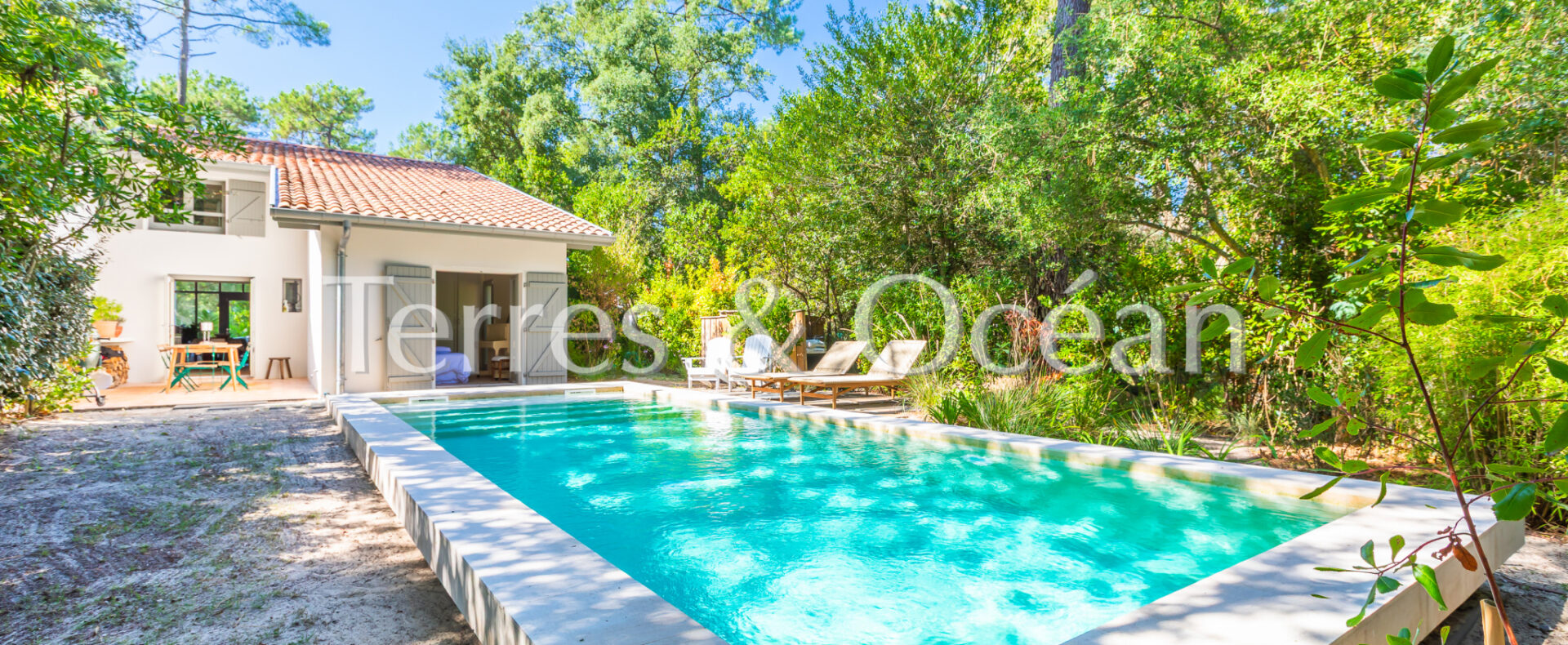 A proximité des plus belles plages et du lac d’Hossegor, au grand calme, sur un jardin intimiste et arboré. Charmante maison entièrement rénovée en 2023 d’environ 103m2 avec piscine chauffée. Elle est composée d’une sublime pièce de vie avec son séjour cathédrale entièrement vitré, salle à manger et cuisine US donnant sur deux spacieuses terrasses. La partie nuit est composée d’une suite parentale en rez de chaussée et de deux chambres à l’étage, avec leurs salles d’eau.