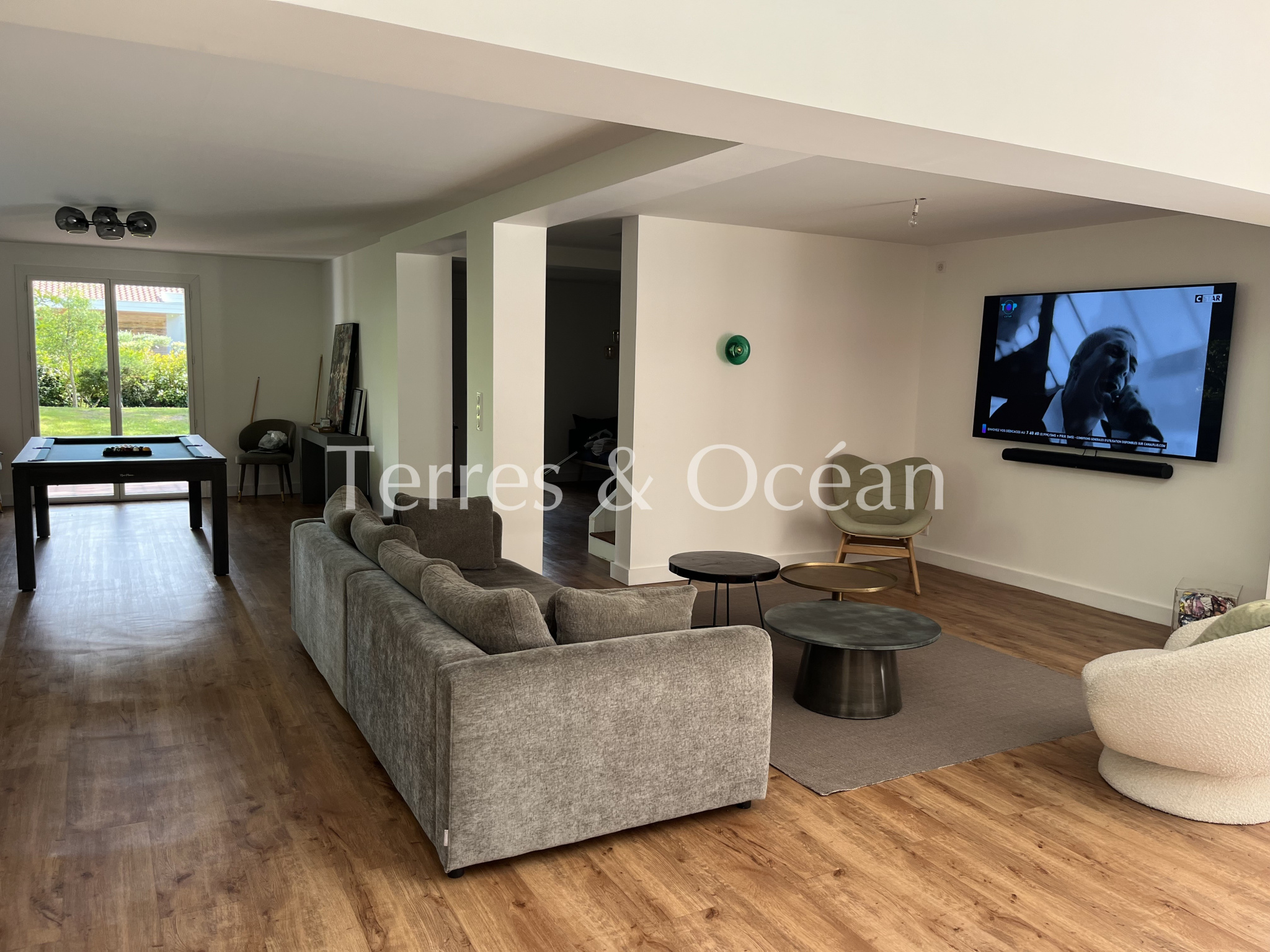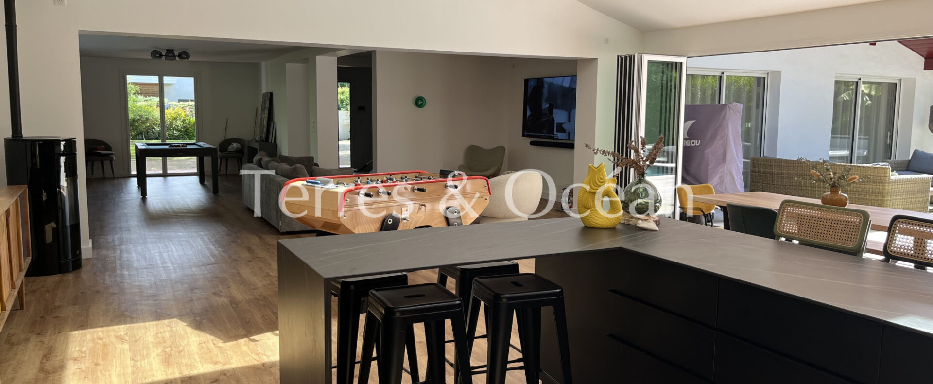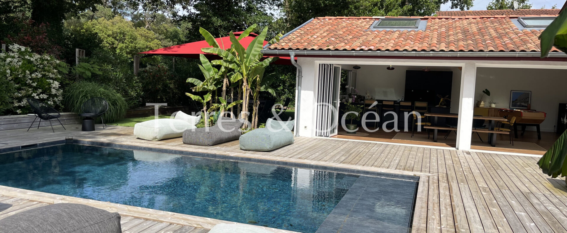 Située en premiere ligne sur le prestigieux golf d’Hossegor, cette magnifique maison landaise a été entièrement rénovée avec goût. Elle offre un cadre de vie exceptionnel, mêlant charme de l’ancien et confort moderne, sans aucun vis-à-vis. Dès l’entrée, vous serez séduit par un vaste séjour lumineux de plus de 100 m2, sublimé par de grandes baies vitrées entièrement ouvrables, prolongeant l’espace de vie vers une terrasse accueillant une piscine, un spa, et une vue sur le golf. La cuisine avec son bar s’ouvre sur cet espace salon avec billard, puis sur une grande table à manger abritée par un très grand parasol sur mesure, faisant office de terrasse couverte. La maison offre au rez-de-chaussée, une suite parentale avec salle de bains et vue sur la piscine grâce à deux baies vitrées, une deuxième chambre avec rangements et salle de douche attenante, une buanderie, un cellier, et des WC invités. À l’étage, deux belles chambres avec dressings et salle de douche, un WC indépendant. Le parc arboré à l’avant de la maison renforce la sensation de tranquillité et d’intimité. Cette propriété rare, à l’architecture typiquement landaise, est idéale comme résidence principale ou secondaire, pour les amateurs de golf ou les amoureux de la région. Renseignements techniques : les informations sur les risques auxquels ce bien est exposé sont disponibles sur le site Géorisques : www.georisques.gouv.fr. DPE en cours. Proposé à la vente par l’agence TERRES & OCEAN immobilier – Agent commercial Mme Mathilde VINTROU RSAC 918907767 tel : 07.81.86.40.19