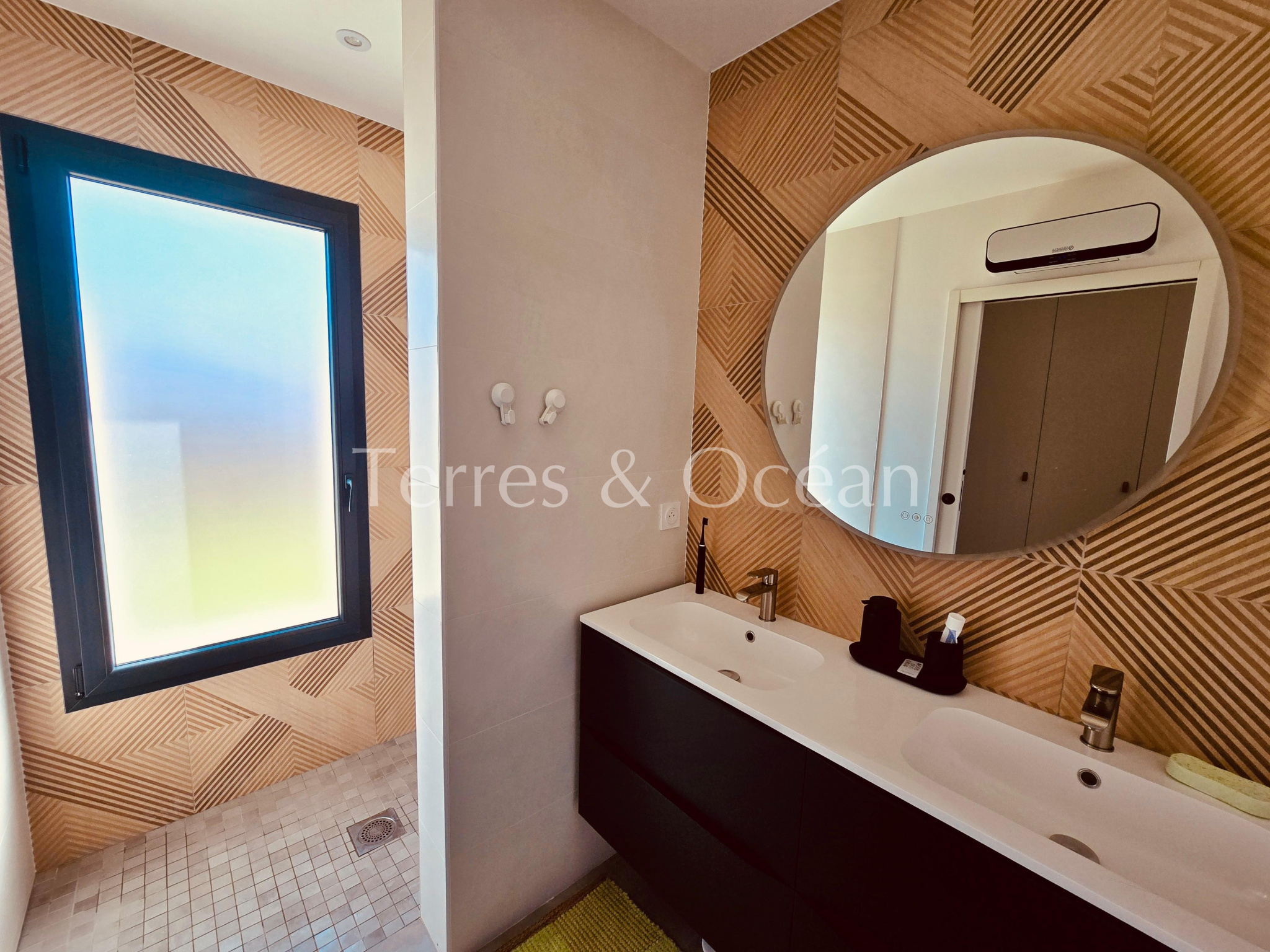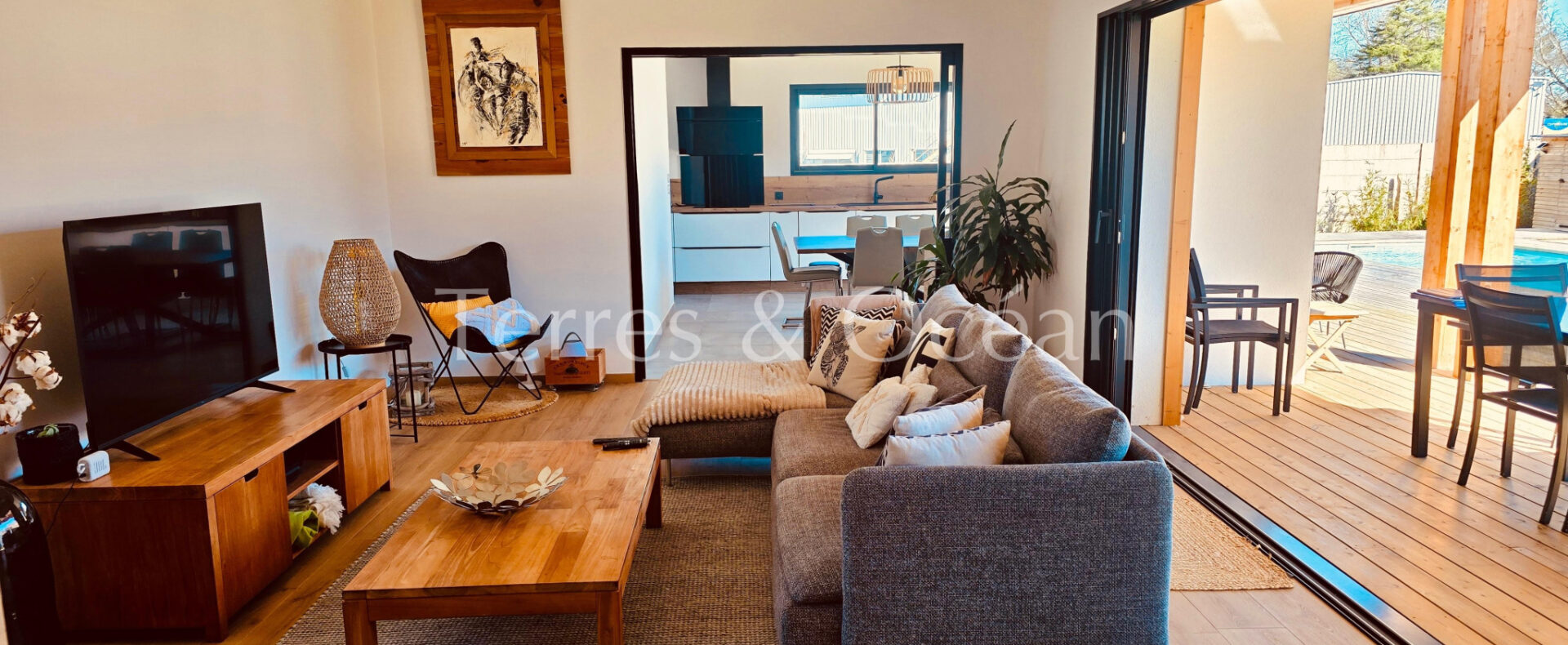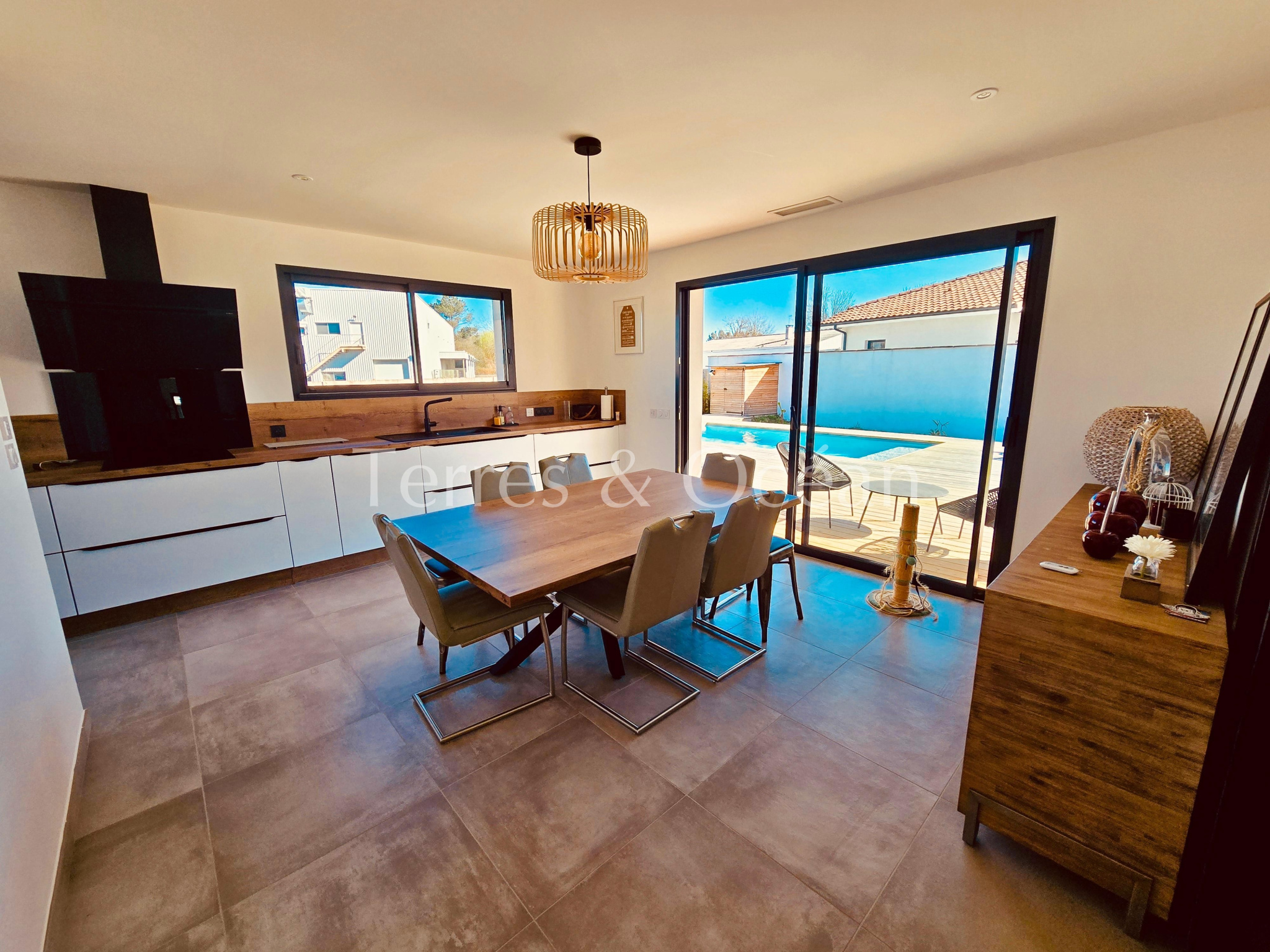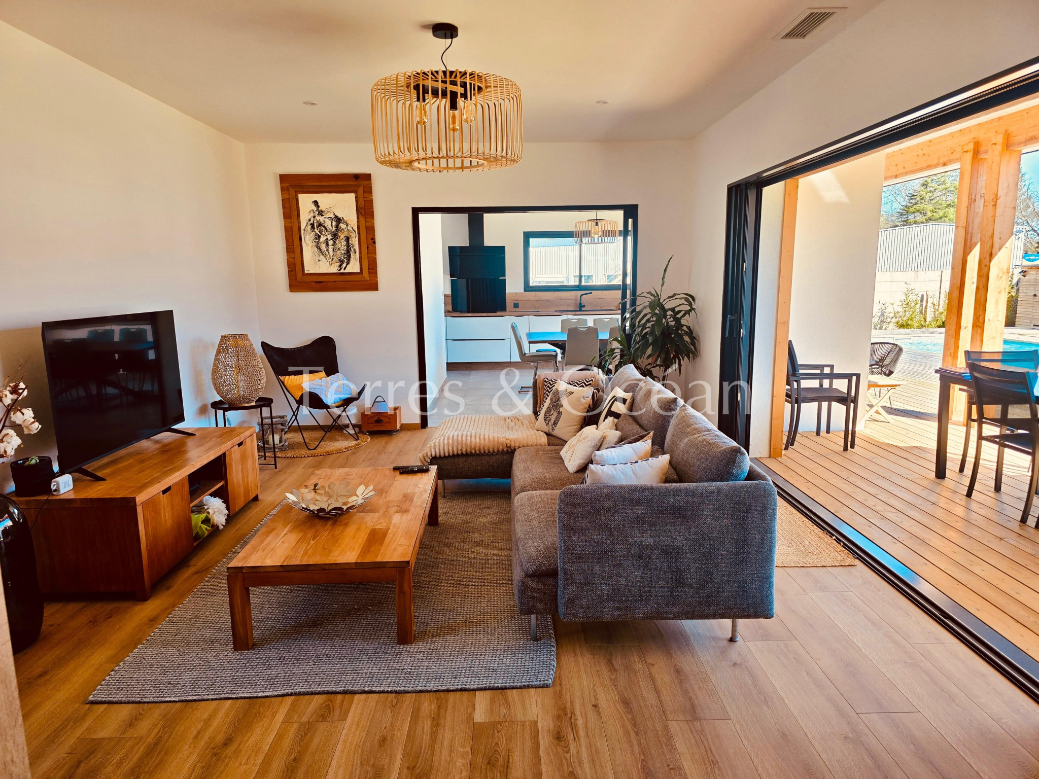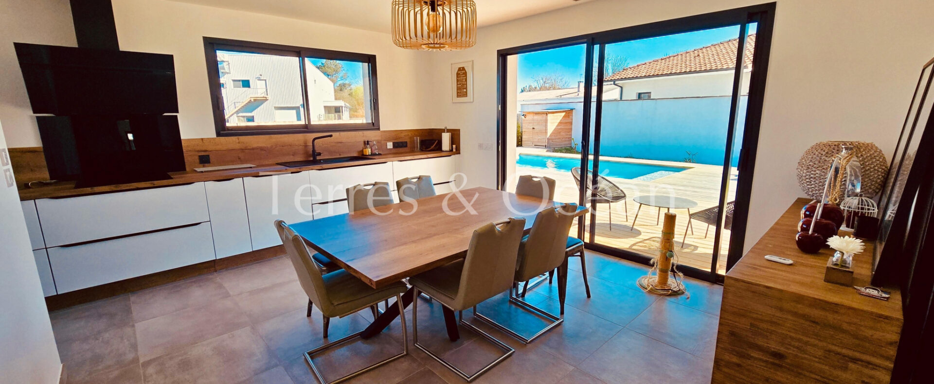 Construite en 2024 par Gondran Construction, la maison de 116m2 offre une belle luminosité et des prestations de qualité. Pièce de vie de 50 m2 avec cuisine aménagée et équipée, 3 chambres dont une suite parentale (dressing, salle d’eau, WC), une seconde salle d’eau et un WC indépendant. L’extérieur propose une grande terrasse de 100 m2 en partie couverte, une seconde terrasse plus intimiste, ainsi qu’une piscine (6×3 m). Terrain de 724m2 entièrement clôturé avec portail électrique. Cellier, garage, chauffage gainable, climatisation, stationnements. Une prestation complète qui est très appréciable.