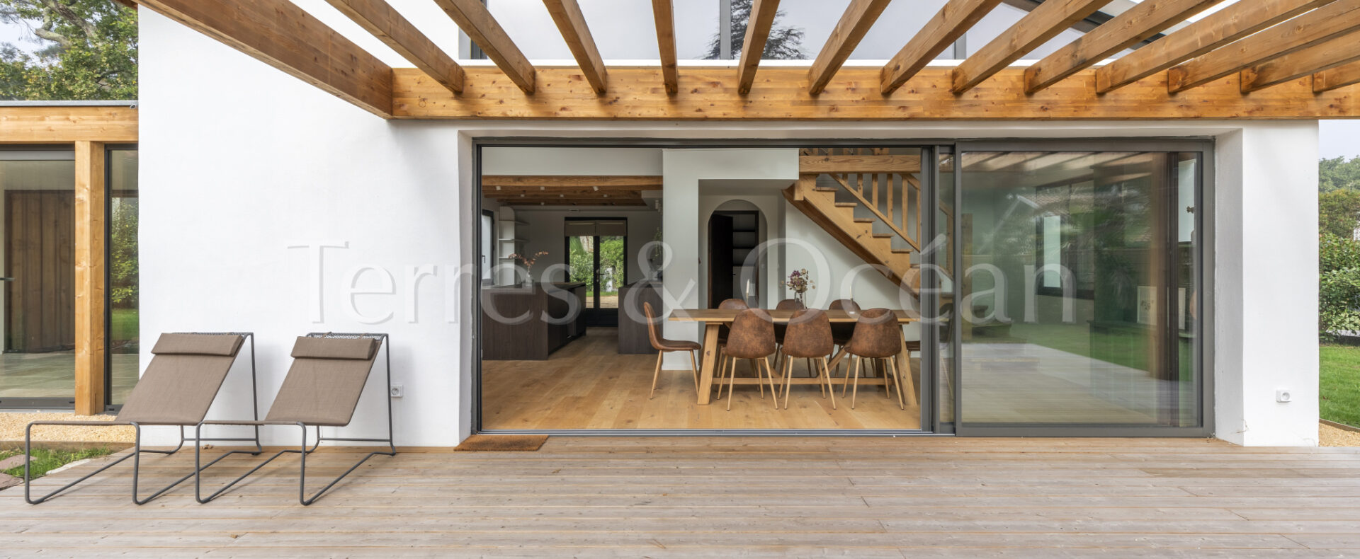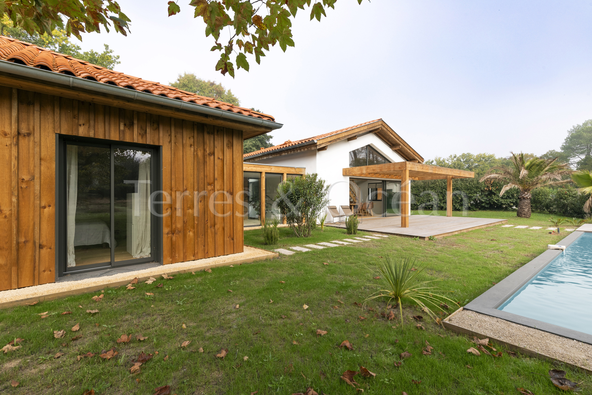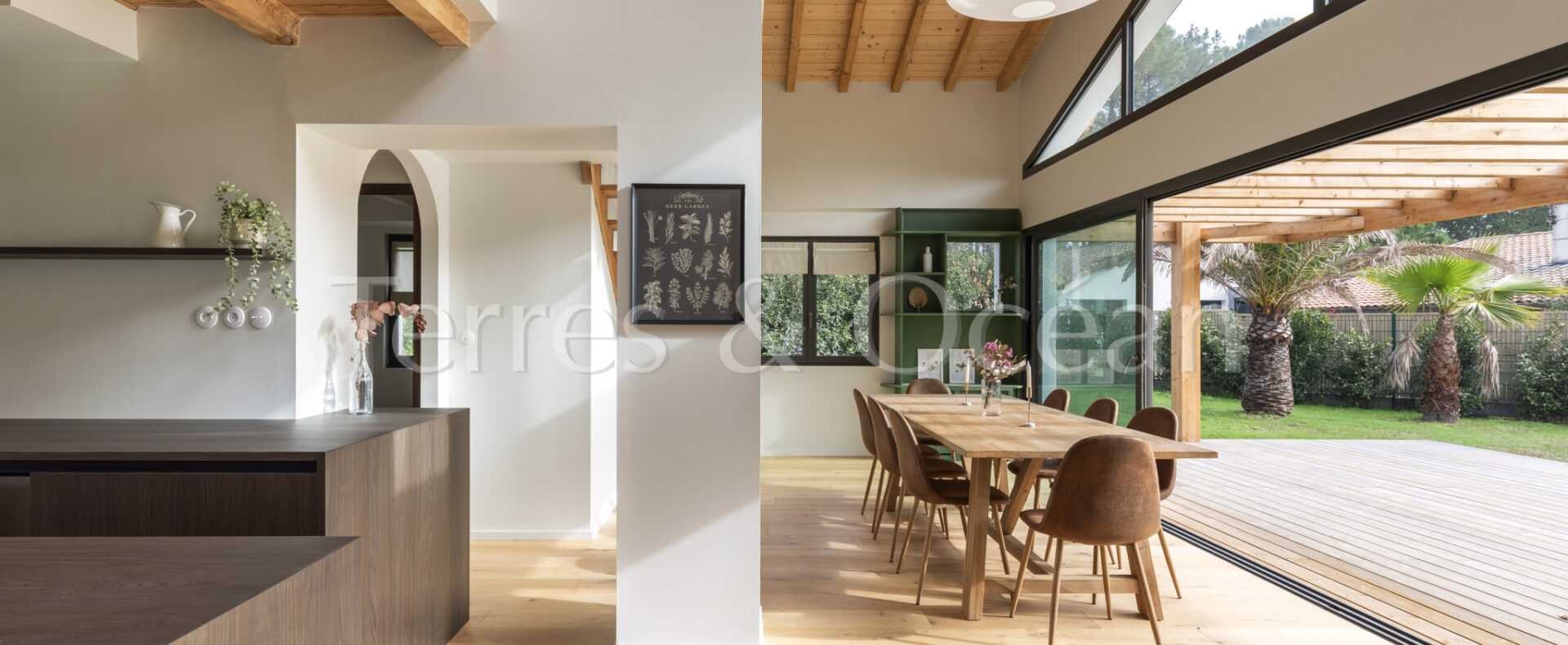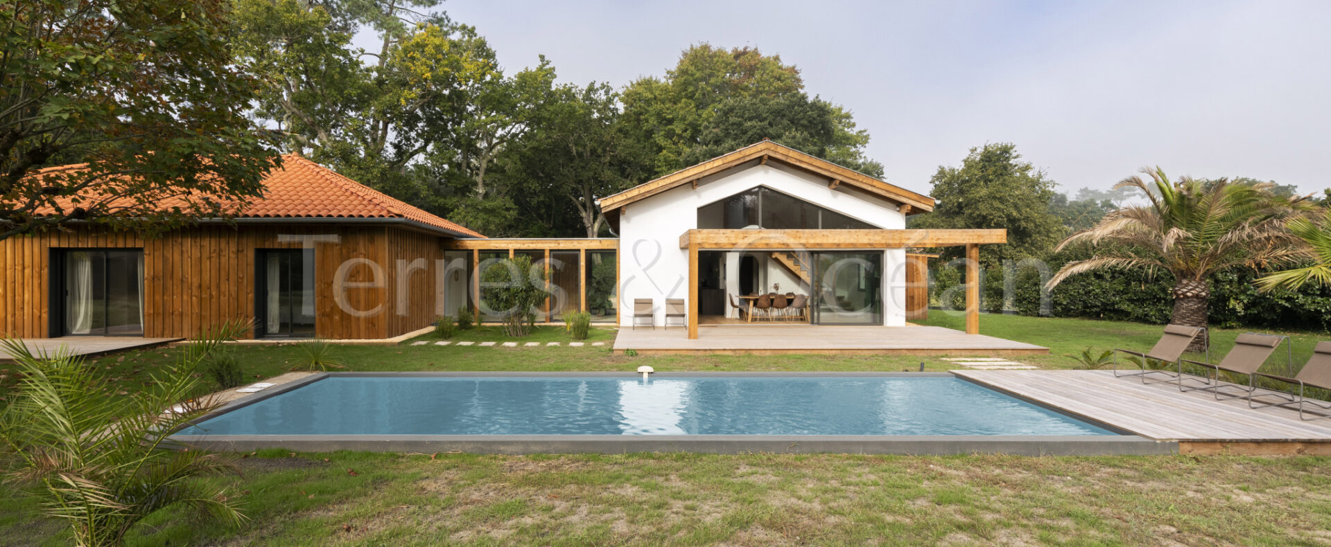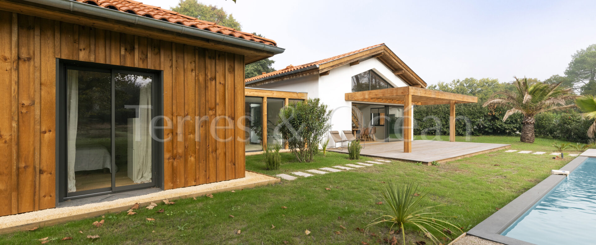 À 30 minutes d’Hossegor et proche des plages, dans un quartier calme et recherché, magnifique villa contemporaine rénovée totalement d’environ 170m2. Un mélange du charme de l’authentique et de la modernité recherchée aujourd’hui. La villa, vendue entièrement équipée, est composée d’une superbe entrée vitrée, d’une grande pièce de vie avec cuisine ouverte, d’un salon, d’un espace bureau, de trois chambres avec chacune sa salle de douche, d’une suite parentale (chambre, espace dressing et salle de douche) et de trois wc. La vaste terrasse donne sur une belle piscine chauffée. Jardin paysagé d’environ 2500 m2 avec arrosage automatique. Travaux sous garantie et assurance dommages ouvrages. Visite virtuelle sur demande. Les informations sur les risques auxquels ce bien est exposé sont disponibles sur le site Géorisques : www.georisques.gouv.fr Proposé à la vente par l’agence TERRES & OCEAN immobilier – Agent commercial Alexandra Baudoin Desprez (RSAC 853744217 Dax) Tél : 07.81.75.97.44