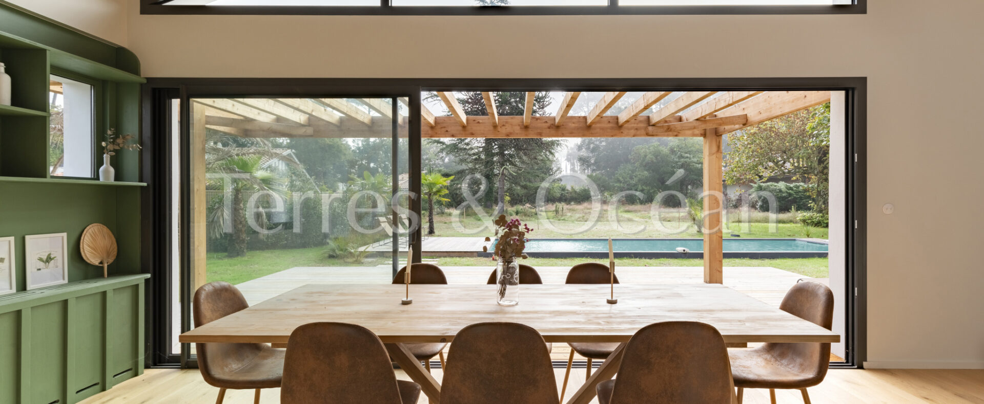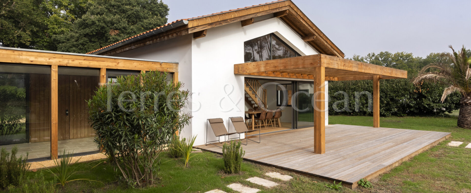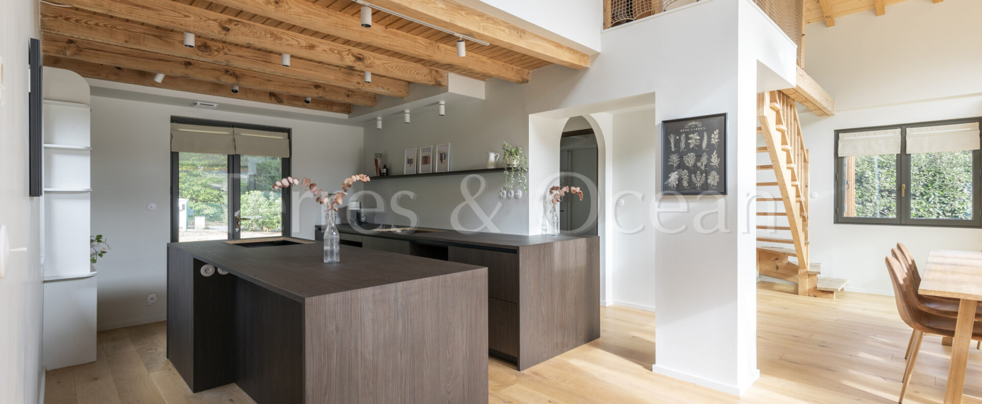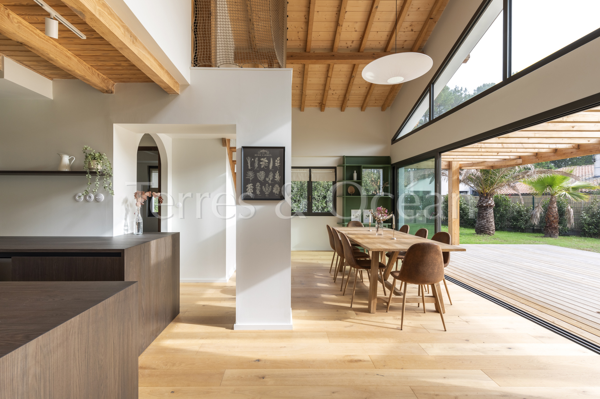 À 30 minutes d’Hossegor et proche des plages, dans un quartier calme et recherché, magnifique villa contemporaine rénovée totalement d’environ 170m2. Un mélange du charme de l’authentique et de la modernité recherchée aujourd’hui. La villa, vendue entièrement équipée, est composée d’une superbe entrée vitrée, d’une grande pièce de vie avec cuisine ouverte, d’un salon, d’un espace bureau, de trois chambres avec chacune sa salle de douche, d’une suite parentale (chambre, espace dressing et salle de douche) et de trois wc. La vaste terrasse donne sur une belle piscine chauffée. Jardin paysagé d’environ 2500 m2 avec arrosage automatique. Travaux sous garantie et assurance dommages ouvrages. Visite virtuelle sur demande. Les informations sur les risques auxquels ce bien est exposé sont disponibles sur le site Géorisques : www.georisques.gouv.fr Proposé à la vente par l’agence TERRES & OCEAN immobilier – Agent commercial Alexandra Baudoin Desprez (RSAC 853744217 Dax) Tél : 07.81.75.97.44