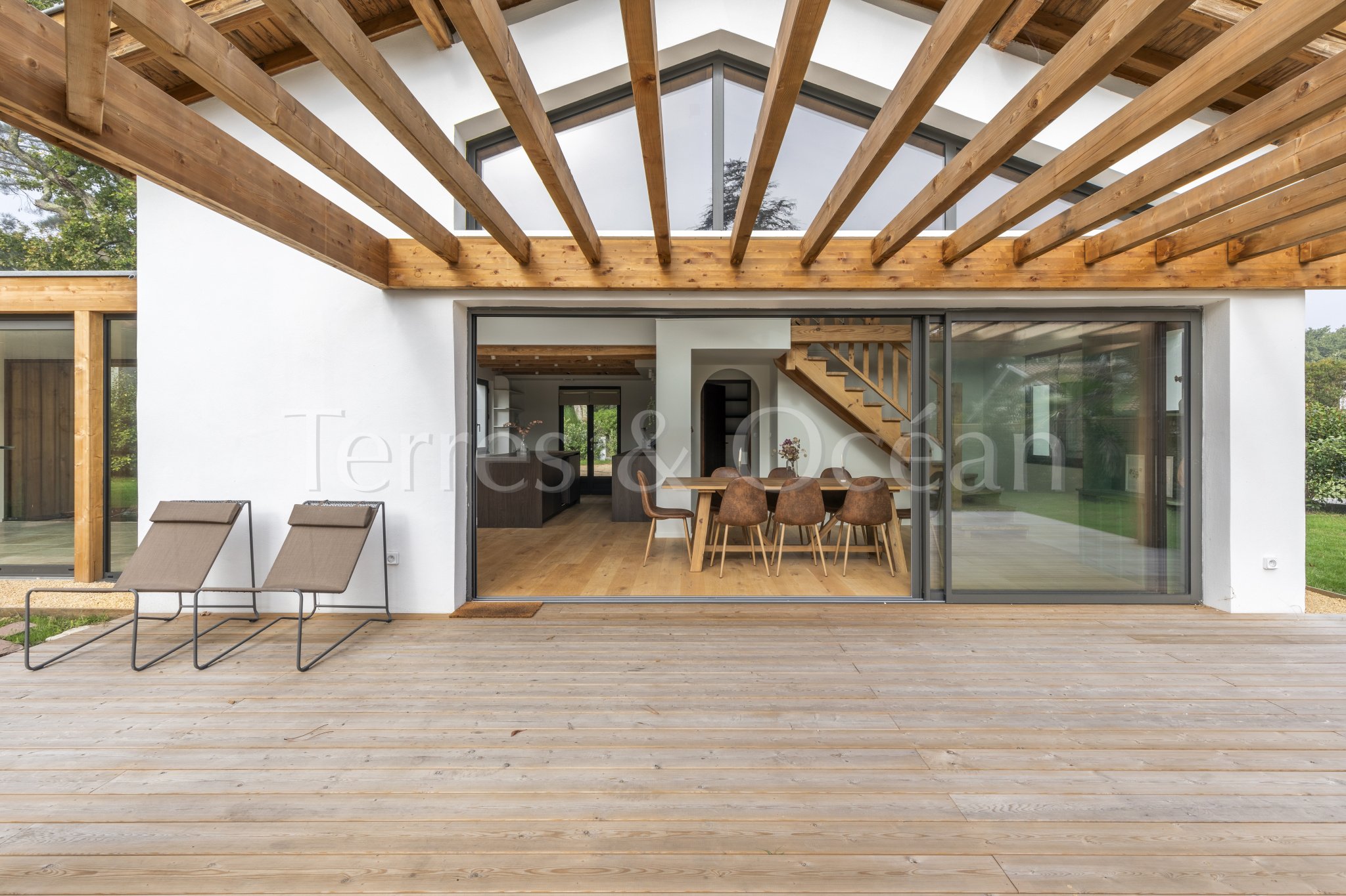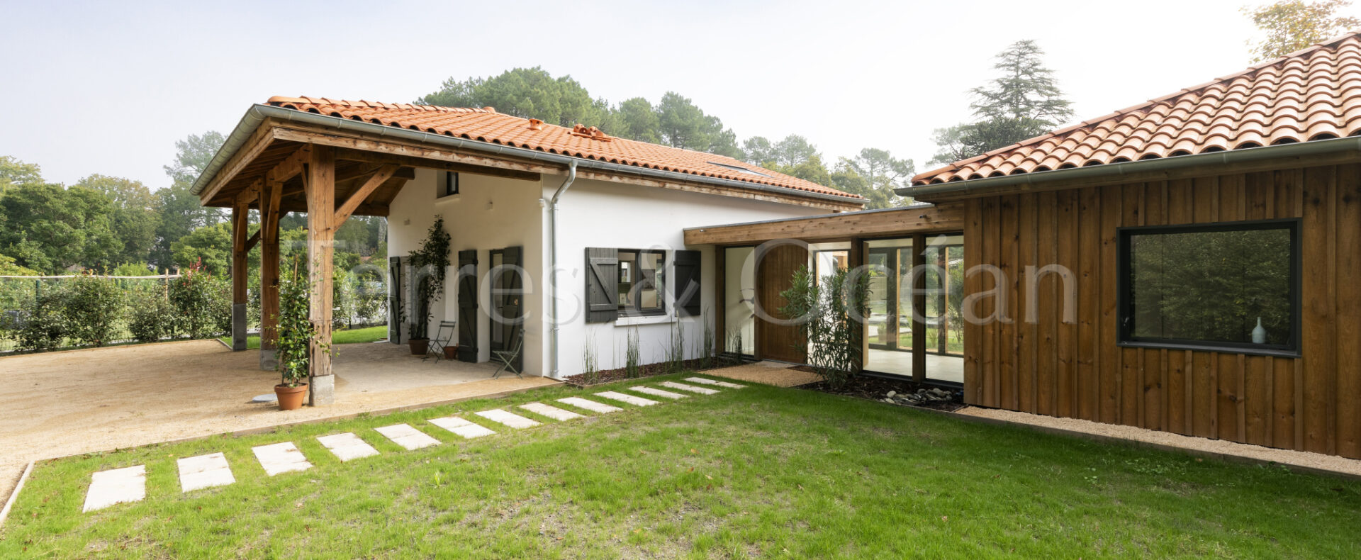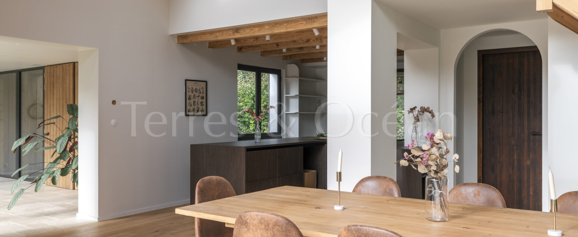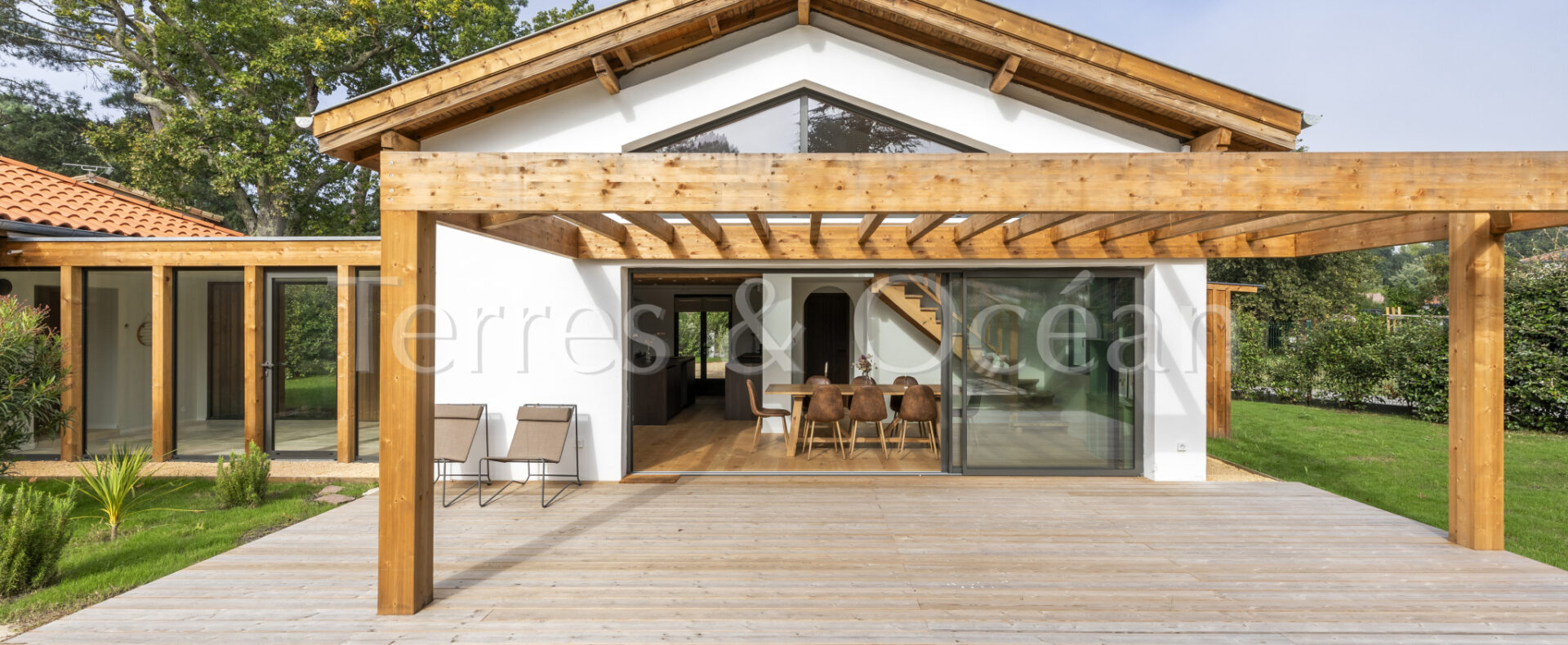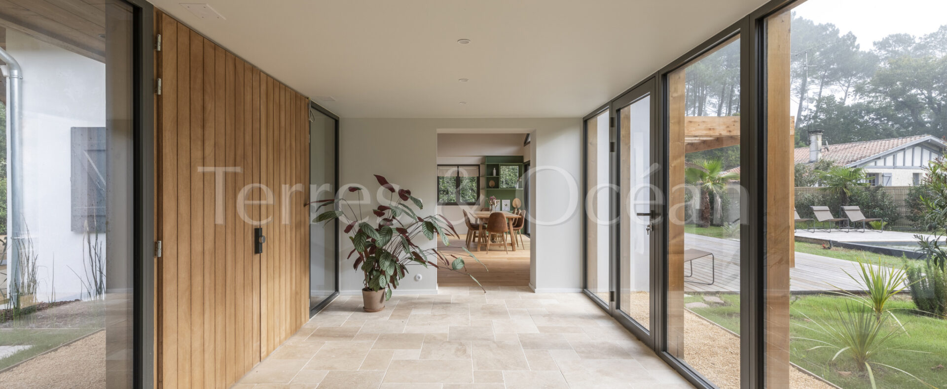 À 30 minutes d’Hossegor et proche des plages, dans un quartier calme et recherché, magnifique villa contemporaine rénovée totalement d’environ 170m2. Un mélange du charme de l’authentique et de la modernité recherchée aujourd’hui. La villa, vendue entièrement équipée, est composée d’une superbe entrée vitrée, d’une grande pièce de vie avec cuisine ouverte, d’un salon, d’un espace bureau, de trois chambres avec chacune sa salle de douche, d’une suite parentale (chambre, espace dressing et salle de douche) et de trois wc. La vaste terrasse donne sur une belle piscine chauffée. Jardin paysagé d’environ 2500 m2 avec arrosage automatique. Travaux sous garantie et assurance dommages ouvrages. Visite virtuelle sur demande. Les informations sur les risques auxquels ce bien est exposé sont disponibles sur le site Géorisques : www.georisques.gouv.fr Proposé à la vente par l’agence TERRES & OCEAN immobilier – Agent commercial Alexandra Baudoin Desprez (RSAC 853744217 Dax) Tél : 07.81.75.97.44